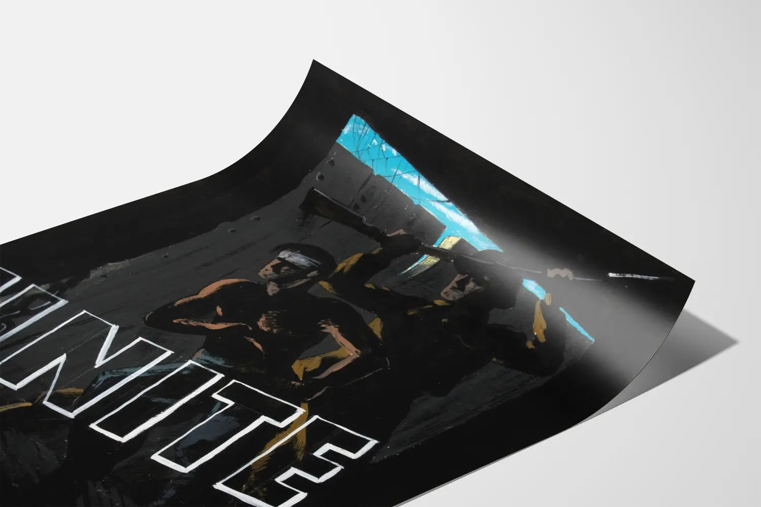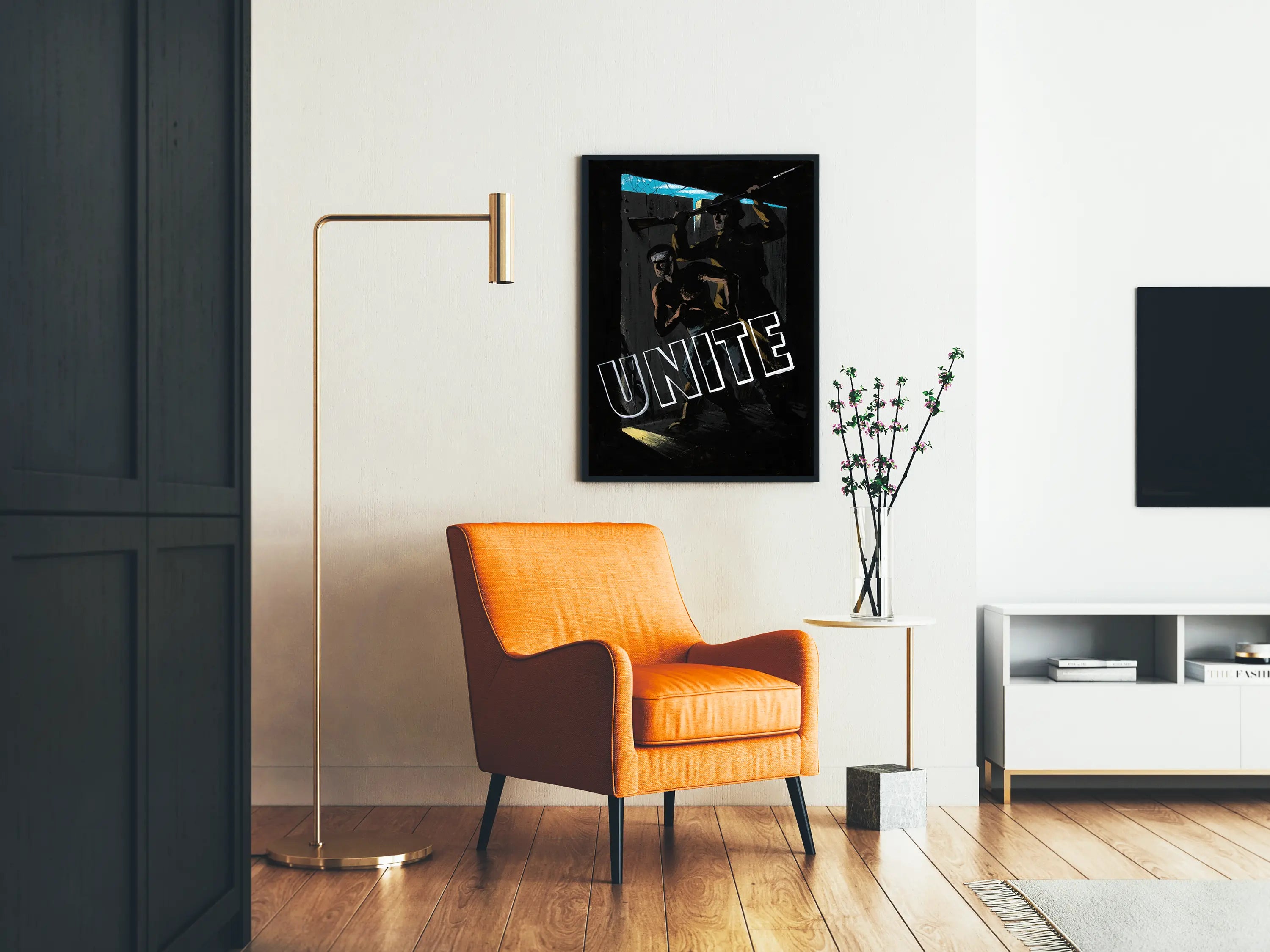 Das Wort „EINHEIT“ erscheint in großen, weißen, kühnen und grafischen Buchstaben, die einen auffälligen Kontrast zum dunklen Hintergrund bilden und die zentrale Botschaft des Plakats verstärken. Dieses Poster spielt mit dominierenden dunklen Farben, ergänzt durch leuchtende Akzente in Gelb und Blau, und schafft eine dramatische Stimmung, die besonders für Räume geeignet ist, die Tiefe und Emotion suchen.