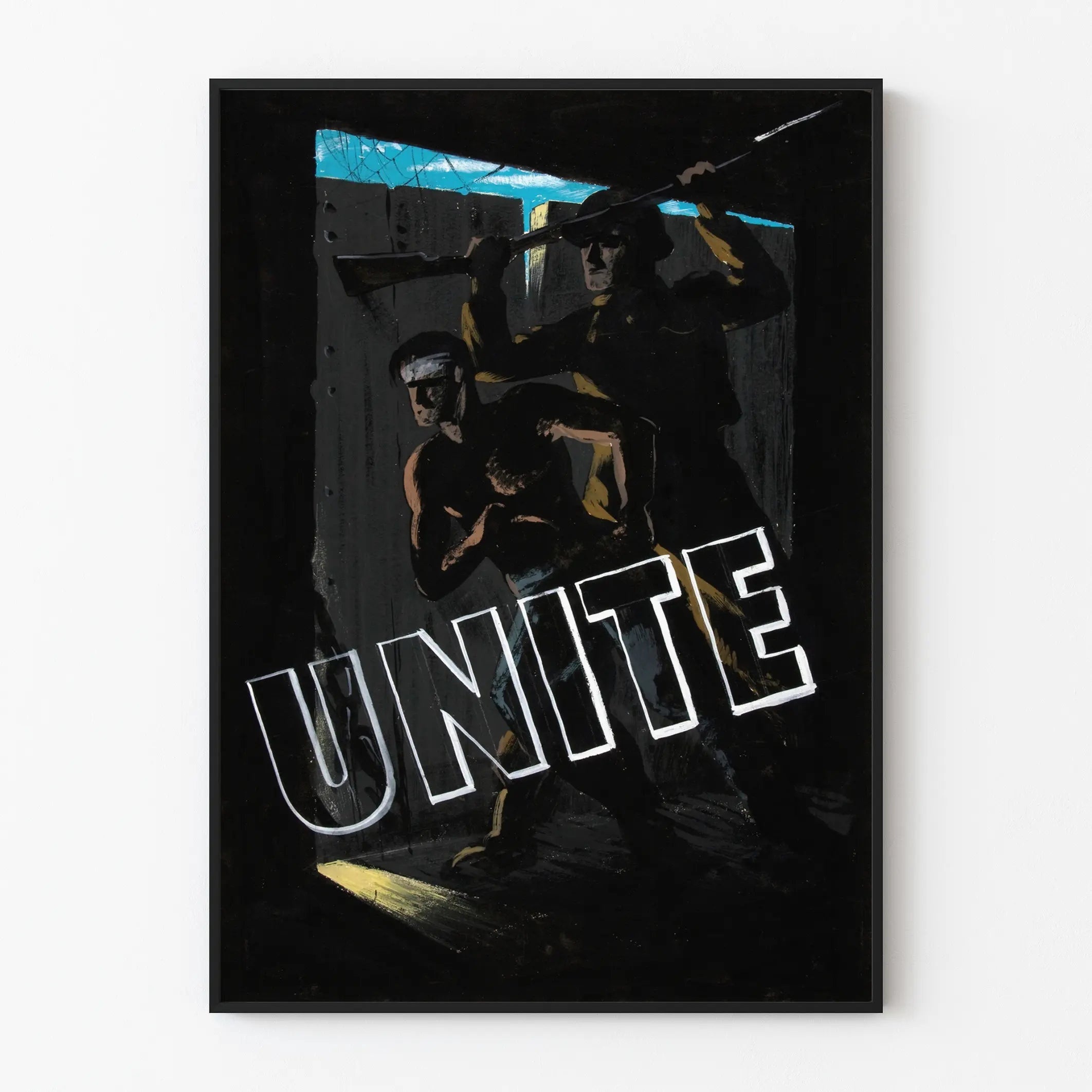 Entdecken Sie dieses kraftvolle Plakat mit dem Titel „Einheit“, eine Wanddekoration, die durch ihren dramatischen Stil und ihre intensive Atmosphäre Aufmerksamkeit erregt. Dieses Werk zeigt zwei Figuren in einer dunklen Umgebung, die gleichzeitig Spannung und Zusammenhalt andeutet. Eine der Figuren, in Uniform, hält eine Waffe entschlossen in der Hand, während die andere mit einem Stirnband erscheint, als sei sie verletzt oder müde, und eine Szene des Schutzes oder gemeinsamen Kampfes evoziert. Das Licht, das aus einer Öffnung strömt, erhellt die Szene leicht und offenbart subtile Details, insbesondere die Gesichter und die Haltung der Protagonisten.