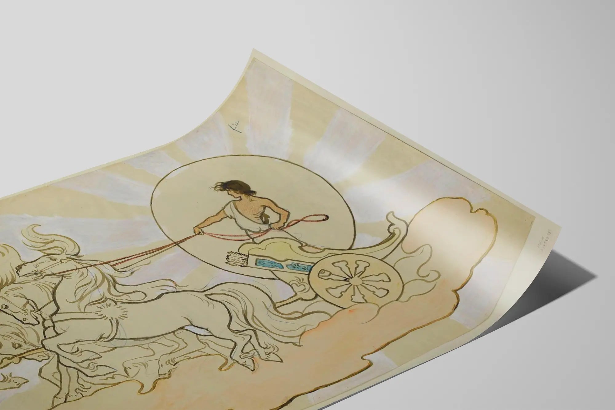 Dieses künstlerische Plakat bietet eine einzigartige Wanddekoration, die Joel auf seinem Wagen zeigt, verbunden mit vier dynamischen Pferden, in einer Szene inspiriert von dem Stück „Joel's Traum“. Die Linienzeichnung hebt einen Stil hervor, der sowohl klassisch als auch schlicht ist, mit einem subtilen Spiel aus goldenen Konturen und Pastellnuancen, die Licht und Bewegung suggerieren. Das Bild fokussiert auf einen jungen Mann mit zarten Zügen, der fest die Zügel seiner Pferde hält, die scheinbar auf einer schwebenden Wolke galoppieren. Diese traumhafte Atmosphäre verleiht Ihrem Interieur eine poetische Note, ideal für Kunst- und Mythologieliebhaber. Als Wanddekoration ist dieses Plakat oder Poster perfekt, um einen eleganten und charmanten Blickfang in Wohnzimmer, Büro oder kulturellem Raum zu schaffen. Es fügt sich nahtlos in eine Inneneinrichtung ein, die Klassizismus und minimalistischen Modernismus verbindet. Dieses Motiv lädt zum Träumen und Entfliehen ein und verkörpert ein Gleichgewicht zwischen Kraft und Sanftheit. Für Liebhaber von Theaterkunst oder symbolischen Gemälden ist dieser kunstdruck eine raffinierte Dekorationswahl, die die Fantasie anregt und die Atmosphäre des Raumes bereichert. Dieses Wandbild zu Ihrer Sammlung hinzuzufügen bedeutet, einen künstlerischen, intellektuellen Akzent und einen Hauch Poesie in Ihre Dekoration zu bringen. Sein zeitloser Charakter harmoniert mit verschiedenen Farbpaletten und Einrichtungsstilen, vom zeitgenössischen bis zum traditionelleren.