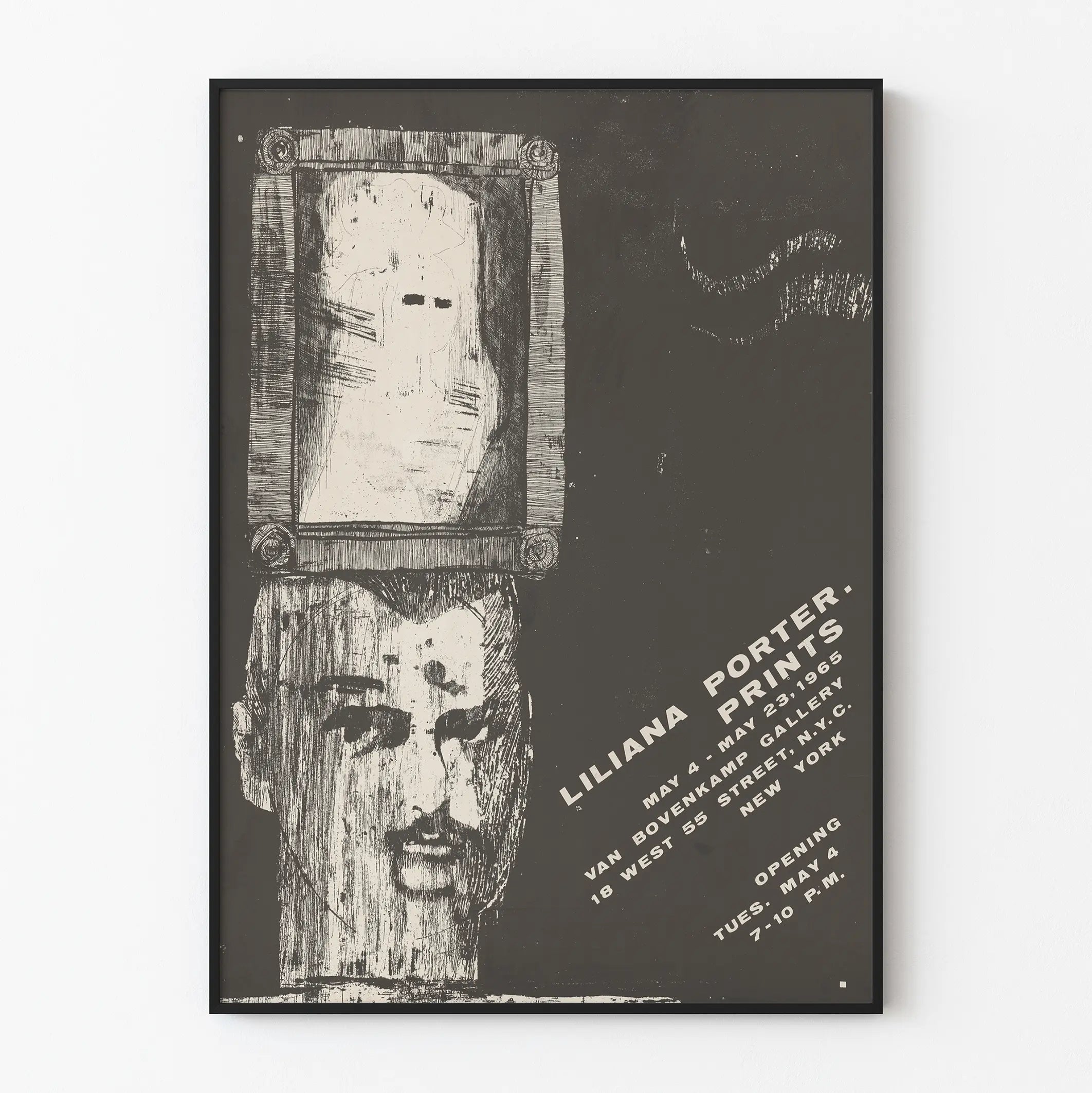 Entdecken Sie dieses einzigartige Plakat, das der Ausstellung „Liliana Porter Prints“ gewidmet ist, die vom 4. bis 23. Mai 1965 stattfand. Dieses Wandbild hebt eine grafische Arbeit in Schwarzweiß hervor, die eine stilisierte Darstellung eines männlichen Gesichts unten mit einem Rahmen enthält, der oben eine abstrakte Silhouette zeigt. Das Werk bietet einen starken Kontrast zwischen feinen Texturen und Schattenbereichen und spielt mit einem Effekt alter Gravur. Ideal als Wanddekoration kann dieses Plakat Ihr Zuhause bereichern, indem es eine authentische und künstlerische Note hinzufügt. Es ist perfekt für Kunstliebhaber, die sich für grafische Kunst und Vintage-Poster interessieren, die an Kunstausstellungen der 60er Jahre erinnern. Die schräg verlaufende Beschriftung, die das Bild begleitet, präzisiert die Details der Veranstaltung und verstärkt den historischen und grafischen Charakter dieses Stücks. Dieses vertikale Poster ist ein dekoratives Element, das sowohl in einem Büro, einem Wohnzimmer als auch in einer Kunstgalerie gut zur Geltung kommt, und einen Retro-Stil betont, der dennoch schlicht und elegant bleibt. Die originale Komposition und die Spielarten des Kontrasts machen daraus ein faszinierendes Wandbild, das durch seine Details und seine faszinierende Atmosphäre Aufmerksamkeit erregt. Verleihen Sie Ihren Wänden eine kulturelle und ästhetische Dimension mit diesem Ausstellungsposter für typografische und figürliche Kunst, das die Bedeutung künstlerischer Drucke in der zeitgenössischen Dekoration unterstreicht.
