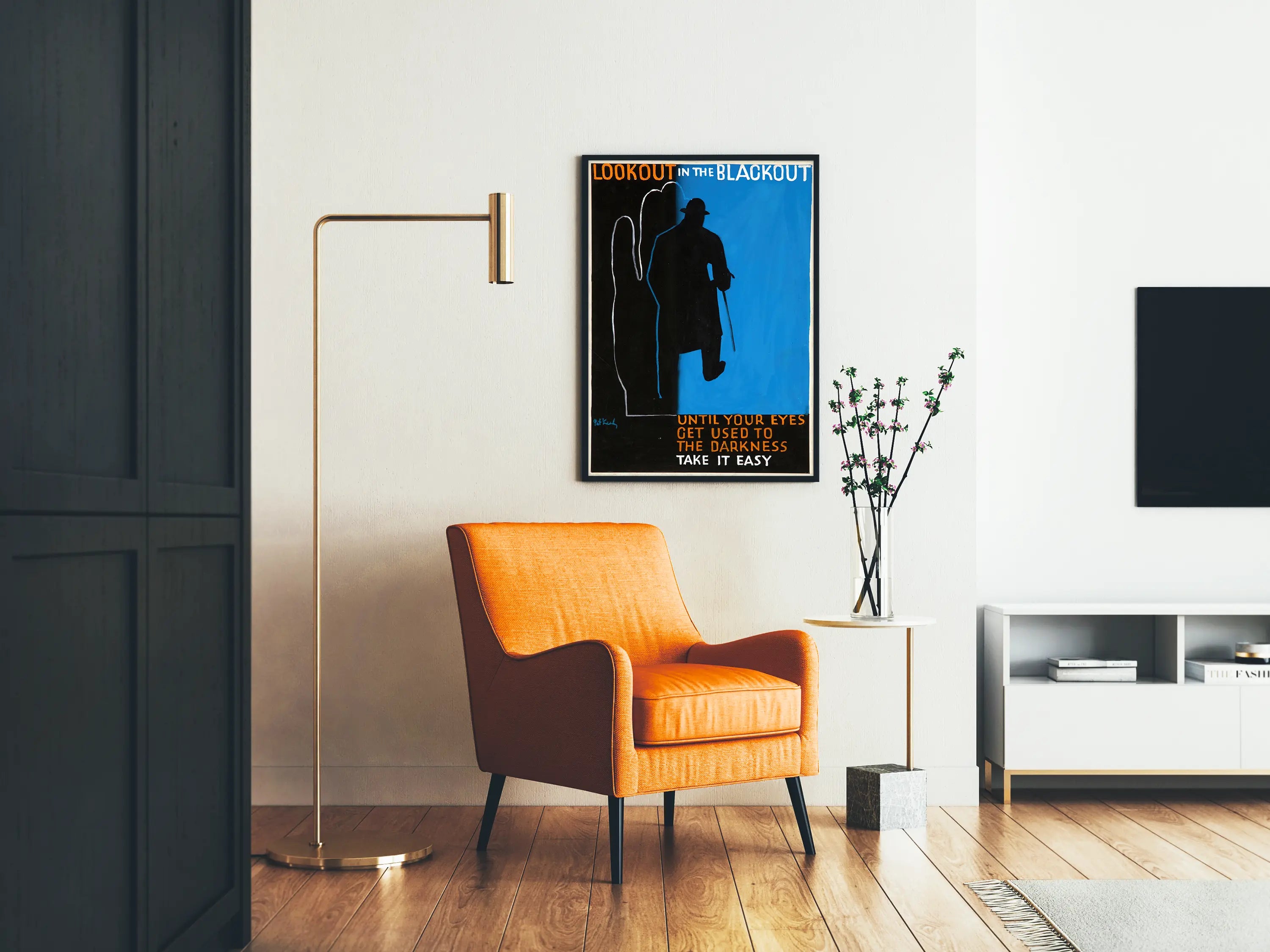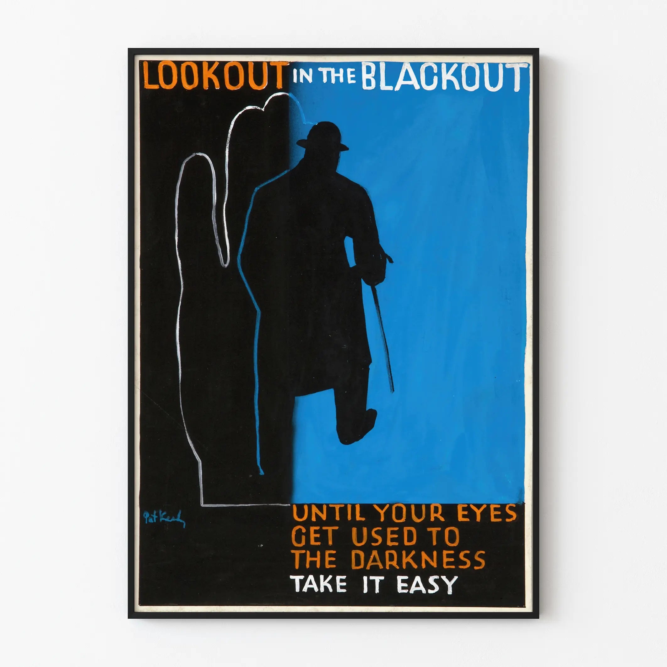 Bringen Sie einen geheimnisvollen und vintage Touch in Ihr Zuhause mit diesem künstlerischen Plakat mit dem Titel „Look Out in the Blackout“. Diese Wanddekoration besticht durch ihre markante Ästhetik: eine schwarze Silhouette, erkennbar an Hut und Stock, schreitet vor einem lebhaften blauen Hintergrund, eingerahmt von einem breiten schwarzen Bereich, der die Dunkelheit symbolisiert. Der starke Kontrast zwischen Schwarz und Blau zieht sofort den Blick auf sich, verstärkt durch eine Großbuchstaben-Typografie in Orange und Weiß, die eine eindrucksvolle Botschaft vermittelt: „Look out in the blackout until your eyes get used to the darkness. Take it easy.“ Dieser Satz kann als Einladung zur Geduld und Anpassung in Zeiten der Unsicherheit oder Dunkelheit verstanden werden. Dieses Plakat wird zu einem echten visuellen Anker in jedem Raum, ideal für ein Wohnzimmer, ein Büro oder Schlafzimmer, wo es eine kontemplative und faszinierende Atmosphäre schafft. Mehr als nur ein Poster, ist diese Wanddekoration ein echtes Kunstobjekt, das zum Nachdenken anregt und gleichzeitig eine moderne grafische Note in Ihren Raum bringt. Sein Stil und seine Farben lassen sich mühelos mit zeitgenössischer oder industrieller Einrichtung kombinieren. Wagen Sie dieses außergewöhnliche Plakat, um Ihre Wände zu beleben und Ihrem Zuhause Charakter zu verleihen – ein Werk, das nicht unbemerkt bleibt.