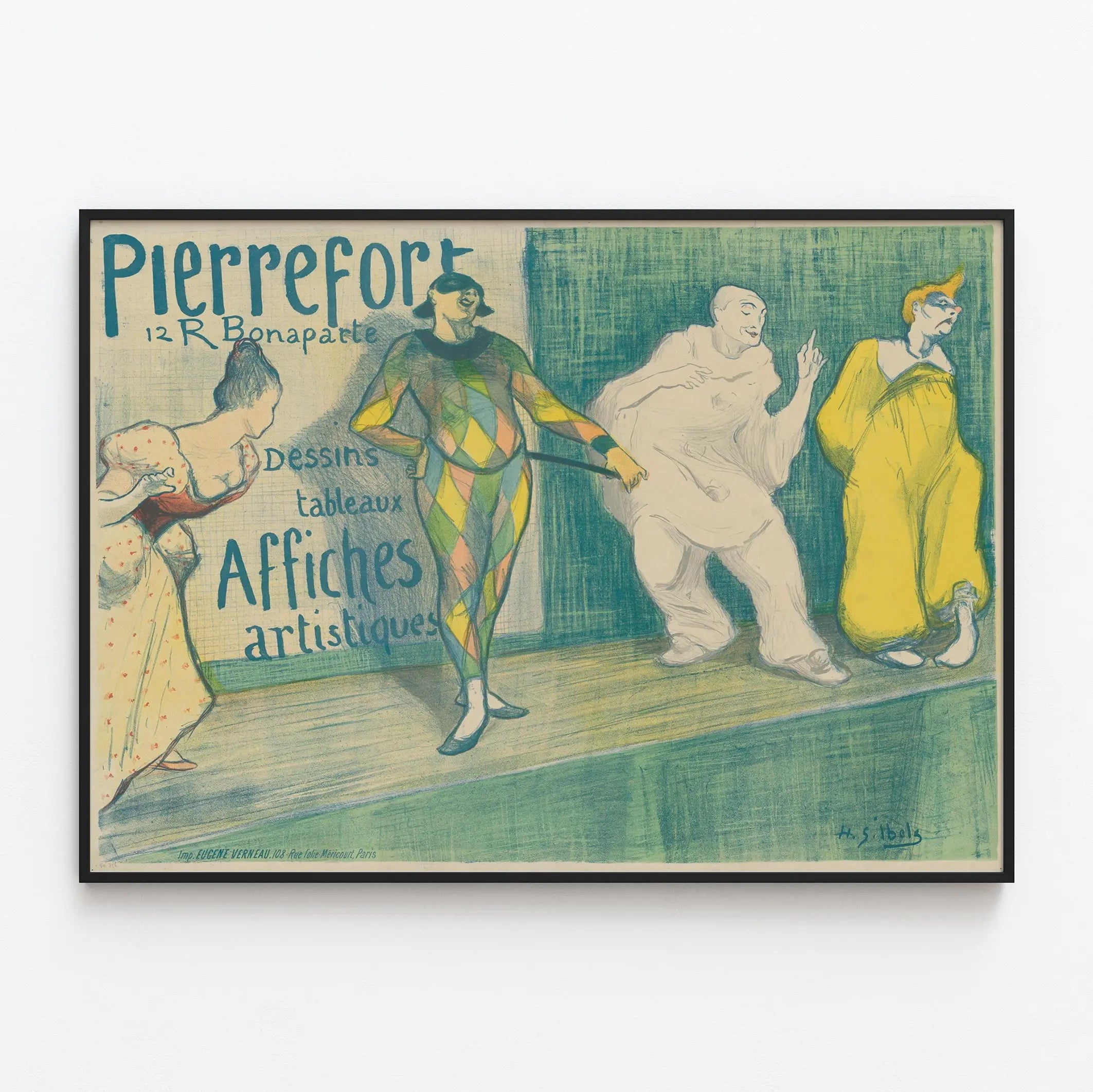 Entdecken Sie dieses künstlerische Vintage-Poster mit dem Titel „Pierrefort“, das eine theaterähnliche Szene mit vier Figuren in unterschiedlichen Kostümen zeigt, darunter ein farbenfroher Harlekin und mehrere Figuren in charakteristischen Verkleidungen, vor einem strukturierten grünen Hintergrund. Dieses Werbeplakat bewirbt die verfügbaren Zeichnungen, Gemälde und künstlerischen Poster in der Nummer 12 der Rue Bonaparte. Das Poster präsentiert einen feinen und detaillierten grafischen Stil, der Linienzeichnung mit sanften Farbtönen verbindet und Ihrer Wanddekoration einen Hauch von Eleganz und Kultur verleiht. Perfekt für Liebhaber von Retro-Kunst oder Dekorationen inspiriert vom Theater und den grafischen Künsten, fängt dieses Wandbild eine leichte und expressive Atmosphäre ein, ideal, um ein Wohnzimmer, Büro oder kreativen Raum zu verschönern. Dank seiner harmonischen Farbpalette, dominiert von Grün-, Gelb- und Ockertönen, lässt sich dieses Plakat mühelos in verschiedene Innenstile integrieren, sei es traditionell oder modern. Das Werk vereint Humor und Raffinesse durch seine dynamischen Figuren und aufwändigen Kostüme und macht dieses Poster zu einem einzigartigen Stück für alle, die ihre Wanddekoration mit einem originellen künstlerischen Akzent personalisieren möchten. Dieses Produkt eignet sich perfekt für eine gerahmte Präsentation an der Wand oder als dekoratives Poster für Liebhaber alter Zeichnungen und Gemälde. Bringen Sie eine theaterartige und künstlerische Atmosphäre in Ihr Zuhause mit diesem Pierrefort-Poster, einer ästhetischen Wahl, die die Vielfalt des Zeichnens und des Kunstplakats feiert.