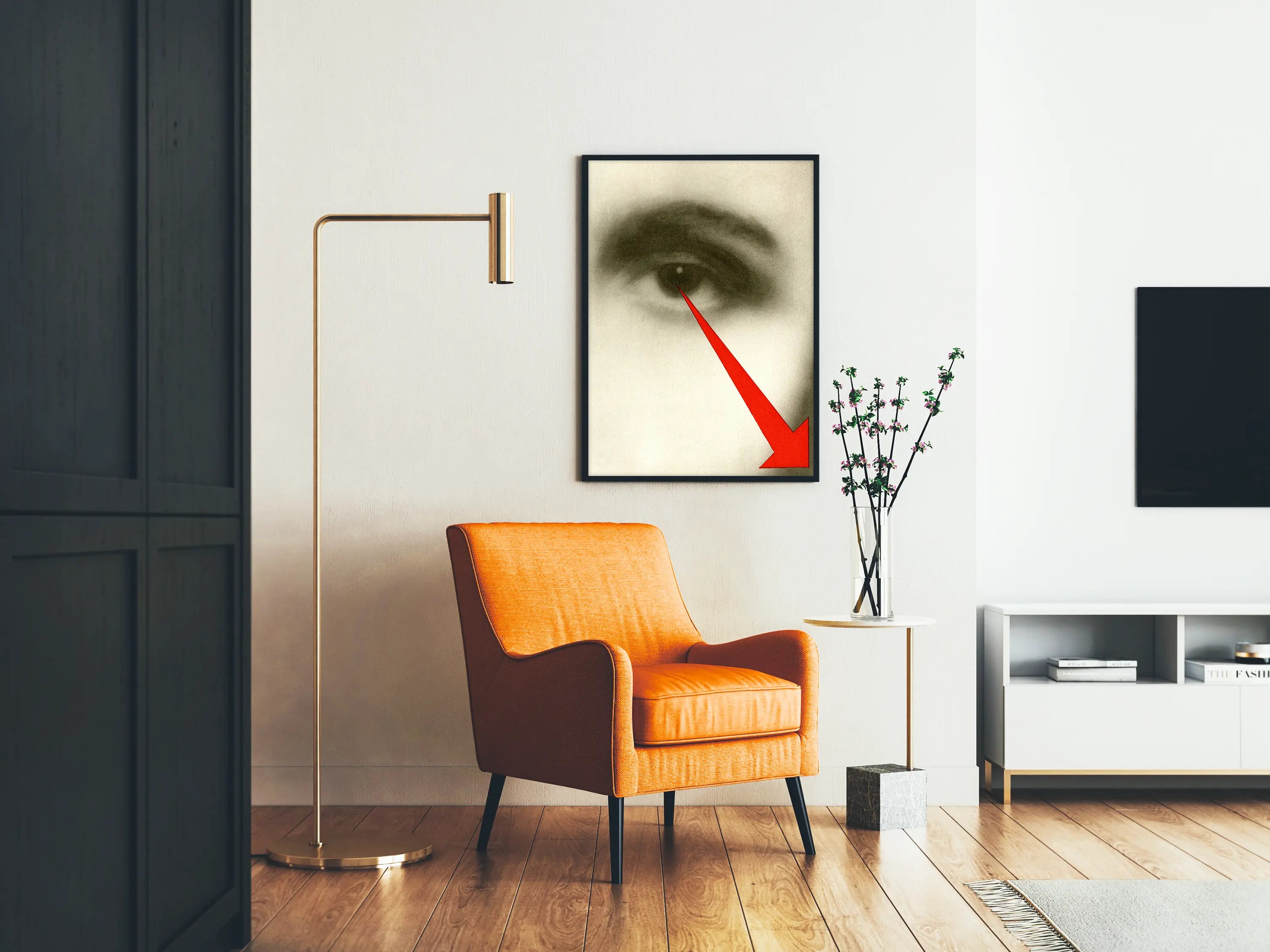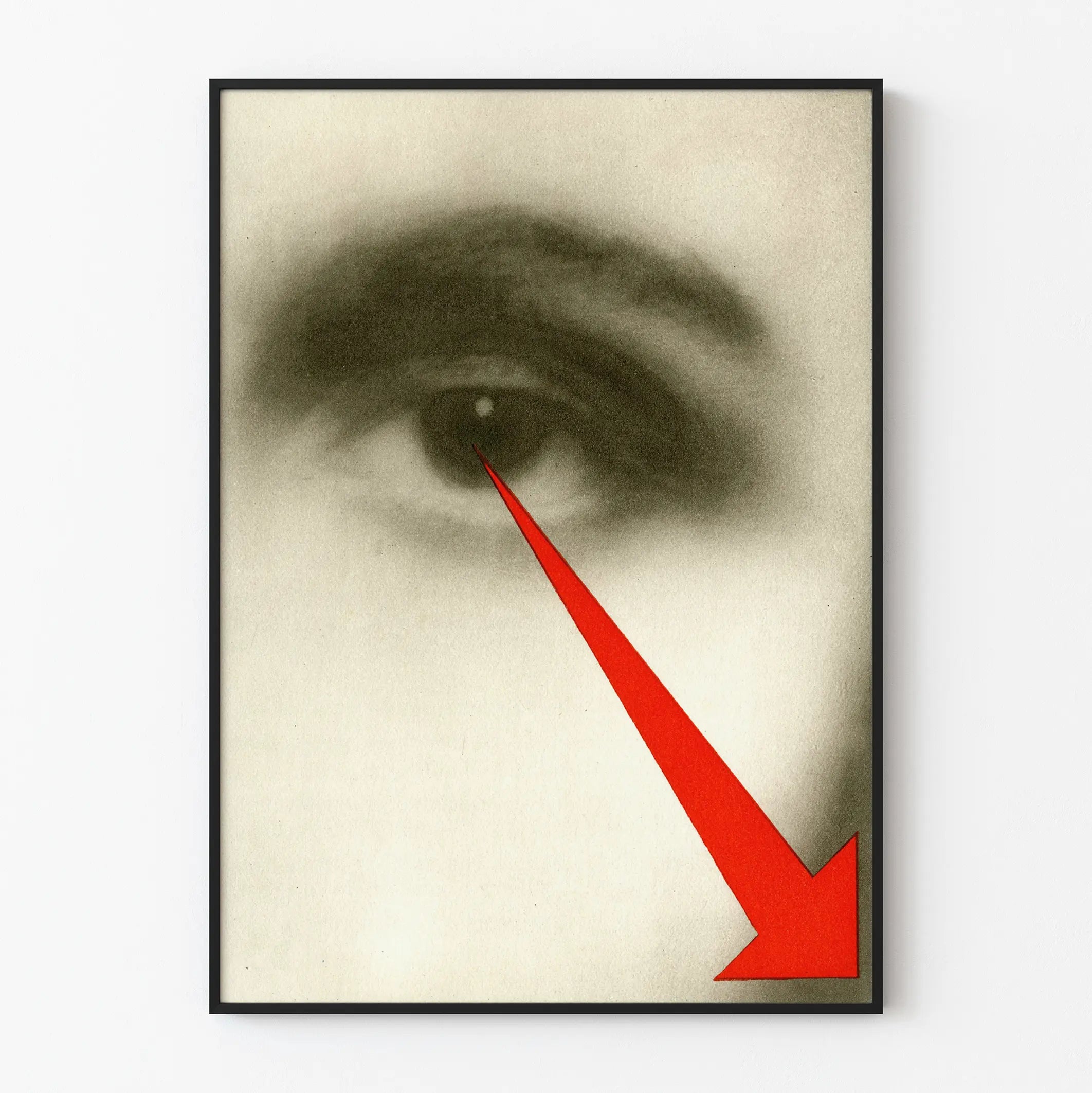 Dieses Poster bietet eine starke visuelle Komposition mit einem Nahaufnahme eines Auges in Grautönen, das durch einen leuchtend roten Pfeil nach unten rechts Aufmerksamkeit erregt. Der auffällige Kontrast zwischen dem monochromen Auge und der lebendigen roten Farbe des Pfeils schafft eine kraftvolle visuelle Dynamik, ideal für eine moderne und ausdrucksstarke Wanddekoration. Dieses Plakat ist perfekt, um jedem Raum einen künstlerischen und zeitgenössischen Akzent zu verleihen, sei es im Wohnzimmer, im Büro oder in einer Galerie. Die Schlichtheit der Formen und die begrenzte, aber intensive Farbpalette verstärken die visuelle Wirkung und fördern eine Atmosphäre, die sowohl geheimnisvoll als auch fesselnd ist. Der fokussierte Blick des Auges, verbunden mit der durch den roten Pfeil markierten Richtung, lädt zu Nachdenken oder visueller Erkundung ein. Dieses Wandbild eignet sich besonders für Liebhaber minimalistischer und grafischer Kunst, die ein Stück integrieren möchten, das Neugier weckt und Besucher anspricht. Ob als Blickfang oder in eine ausgewogene Wandkomposition integriert – dieses Poster passt zu verschiedenen Dekorationskonzepten. Die Druckqualität hebt die feinen Details des Auges und die leuchtende Sättigung des Rot hervor, was Langlebigkeit und Schärfe im Laufe der Zeit garantiert. Dieses Plakat ist eine ausgezeichnete Wahl für alle, die ihre Umgebung mit einem schlichten, aber kraftvollen Wanddekor bereichern möchten, das Grafik und visuelle Symbolik vereint.