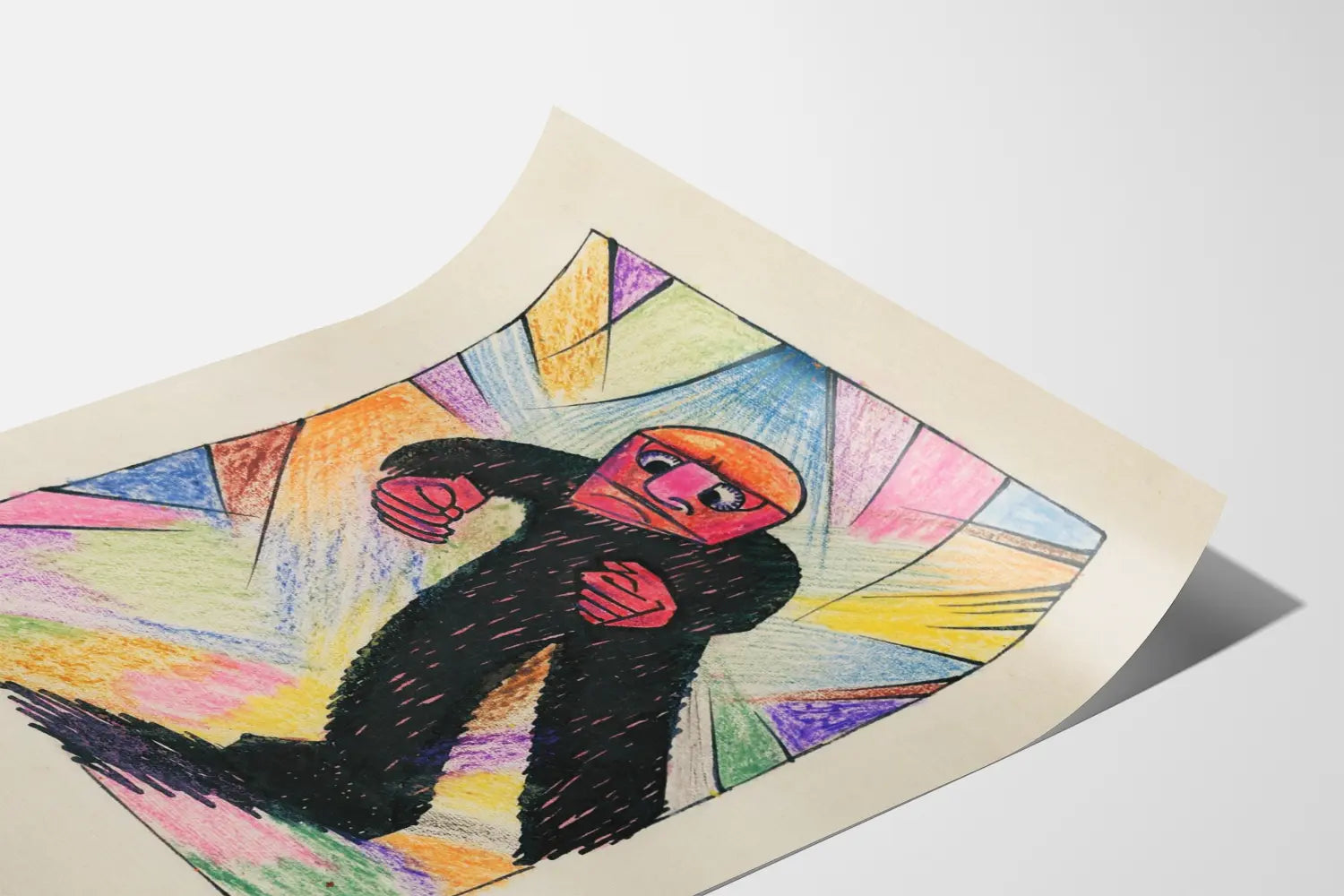 Dieses einzigartige Plakat mit dem Titel „Wut!“ und signiert von K. Wiener besticht durch seinen lebendigen expressionistischen Kunststil. Das Bild zeigt eine stilisierte menschliche Figur mit kantigen Formen und einem intensiven roten Gesicht, das starke Emotionen ausdrückt. Die Figur, in Schwarz gekleidet, wirkt entschlossen vor einem abstrakten Hintergrund, der von leuchtenden Farbexplosionen geprägt ist: Rosa, Blau, Orange, Violett, Grün und Gelb verschmelzen in einem dynamischen Farbverlauf um die Silhouette. Die markanten Linien und die geometrische Komposition des Hintergrunds verleihen dem Gesamtbild eine gewisse Energie, was dieses Werk zu einer gewagten Wahl für eine Wanddekoration macht. Das Plakat vereint harmonisch die Schlichtheit der Linie mit der Fülle der Farbtöne, sodass es sowohl in modernen Innenräumen als auch in kreativen Räumen integriert werden kann. Durch seine Originalität ist dieses Poster ideal für diejenigen, die ihrer Dekoration einen starken, ausdrucksstarken künstlerischen Akzent verleihen möchten. Ob im Büro, Wohnzimmer oder Atelier – die Lebendigkeit der Farben und die Ausdruckskraft dieses Plakats verleihen ihm eine zentrale Rolle bei der Gestaltung Ihrer Wände. Dieses originelle Stück hebt zudem einen einzigartigen grafischen Stil hervor, der durch seine Intensität und Authentizität ins Auge fällt und die emotionale Kraft des Bildes unterstreicht. Zusammenfassend ist das Plakat „Wut!“ von K. Wiener eine Einladung, rohe und farbenfrohe Ausdruckskraft durch eine eindrucksvolle Wanddekoration zu entdecken, die einen einfachen Raum in einen charaktervollen Ort verwandeln kann.