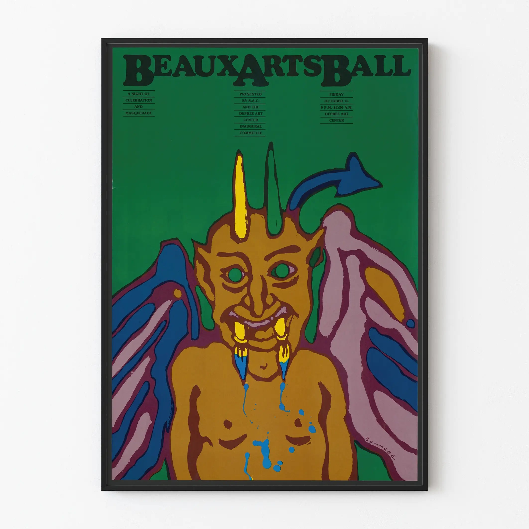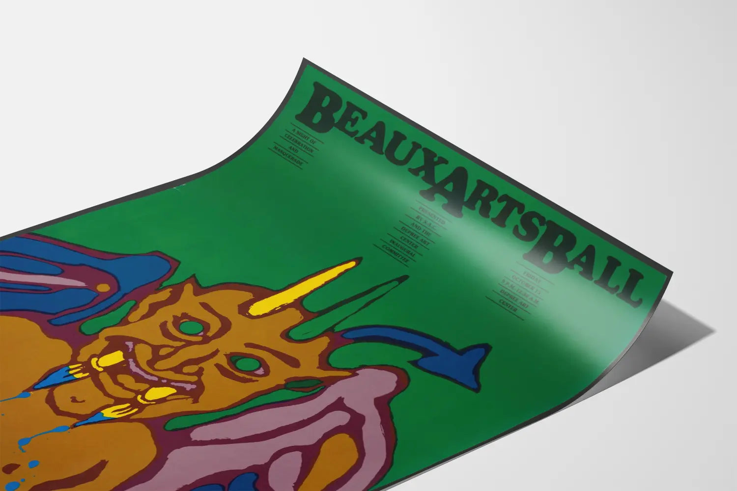 Der im oberen Bereich des Posters gedruckte Text kündigt eine Veranstaltung mit dem Titel „Beaux Arts Ball“ an, was auf einen festlichen, kostümierten Kunstabend hindeutet, verstärkt durch die Aussage „Eine Nacht voller Feier und Maskerade“. Die typografischen Schriftzüge sind in Schwarz, fett und strukturiert gestaltet, was ein Gleichgewicht zwischen Text und Bild schafft und eine klare, harmonische Präsentation ermöglicht.