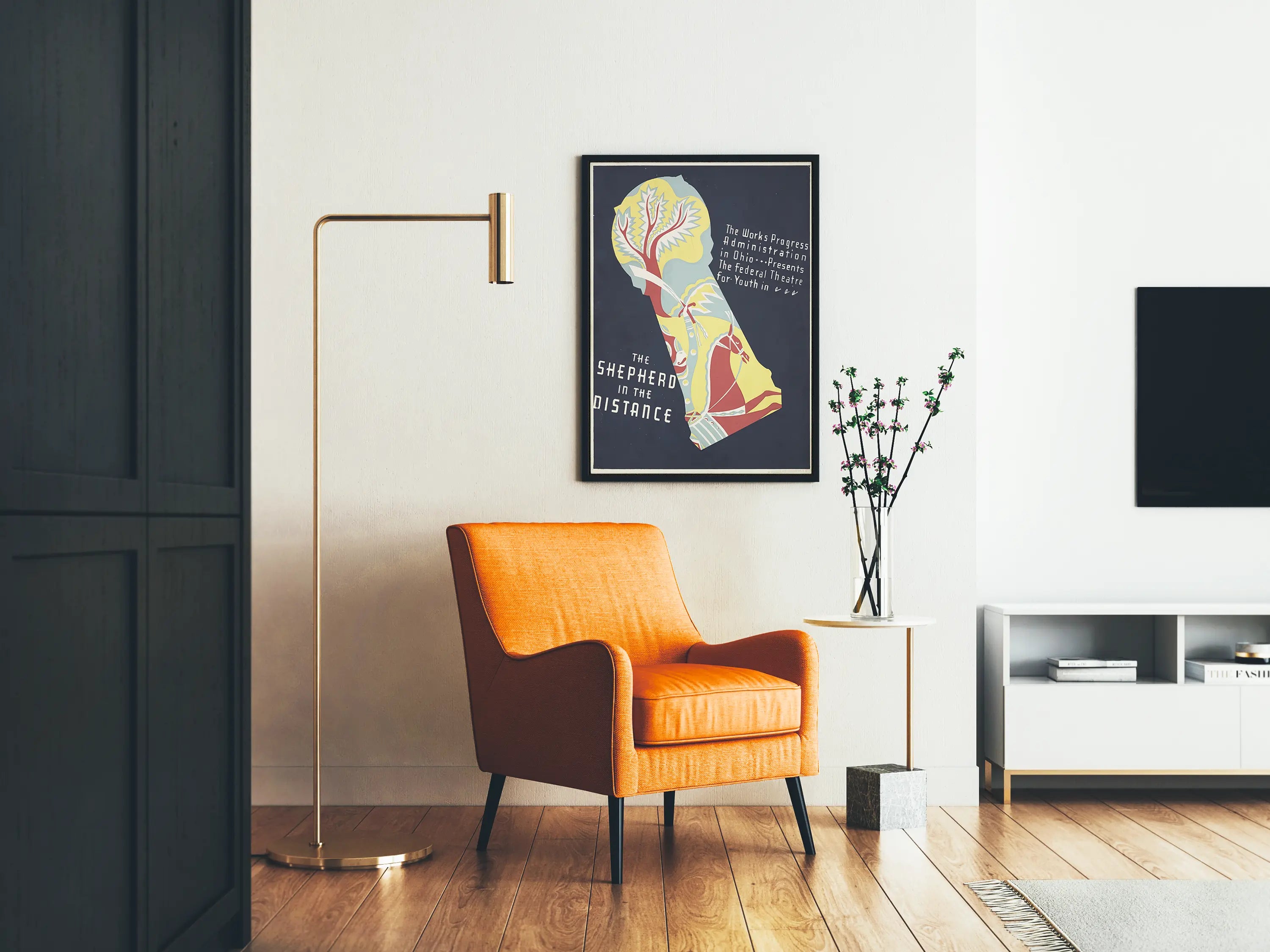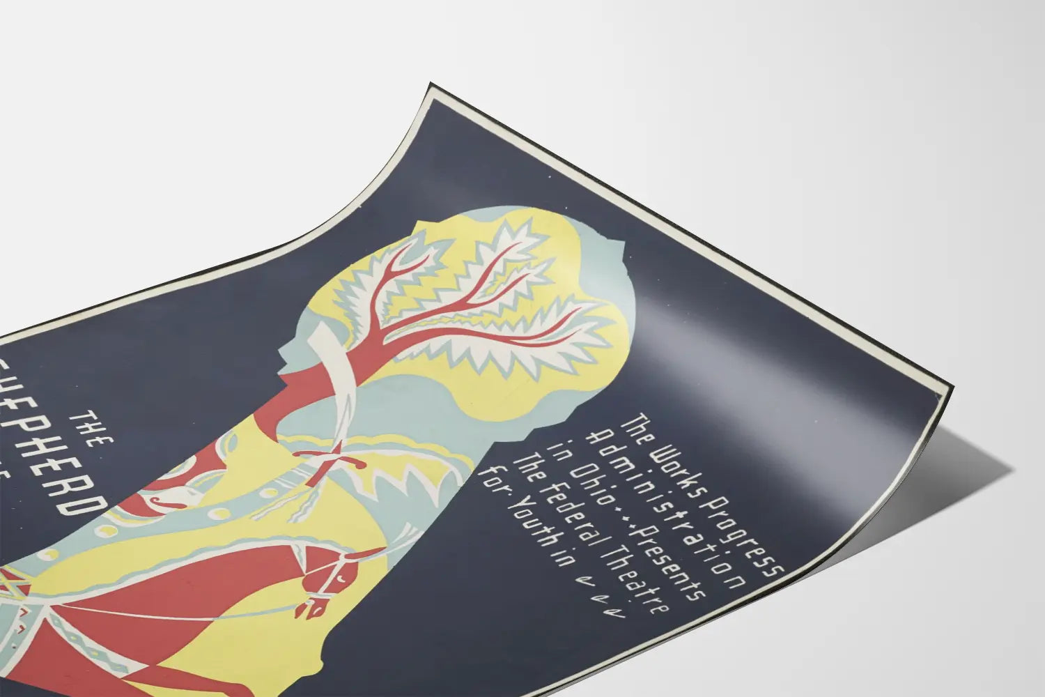 Dieses Poster zeigt eine einzigartige Wanddekoration im Art-Déco-Stil, geprägt von geometrischen Formen und kontrastreichen Farben. Darauf erkennt man eine Silhouette, bestehend aus einem stilisierten Baum und einem dekorierten Pferd, allesamt in Rottönen, Gelb, Hellblau und Weiß auf dunklem Hintergrund. Der in weißen Buchstaben geschriebene Text beschreibt eine Theateraufführung, organisiert von der Verwaltung der fortschreitenden Arbeiten in Ohio, die sich an die Jugend richtet. Diese originelle grafische Komposition lädt zu einer vintage- und künstlerischen Atmosphäre ein, ideal, um eine Wanddekoration in einem modernen oder retro-inspirierten Interieur zu bereichern. Als Posterformat verleiht dieses Kunstwerk einem Wohnzimmer, einem Büro oder einem Kunstbereich eine kulturelle und inspirierende Note. Sein dynamisches Design und die farbenfrohe Palette machen es zu einem ansprechenden Dekorationselement, das den Blick auf sich zieht und Neugier weckt. Perfekt für Liebhaber grafischer Kunst, Theater oder visueller Geschichte verwandelt diese Wanddekoration eine klassische Wand in ein echtes Kunstwerk, das sowohl eine historische Atmosphäre als auch eine moderne Ästhetik vereint. Sie lässt sich mühelos mit hellen Holzmöbeln, minimalistischen Accessoires und industriellen Dekorationsstücken kombinieren und bietet so vielseitige Gestaltungsmöglichkeiten für verschiedene Raumstile.