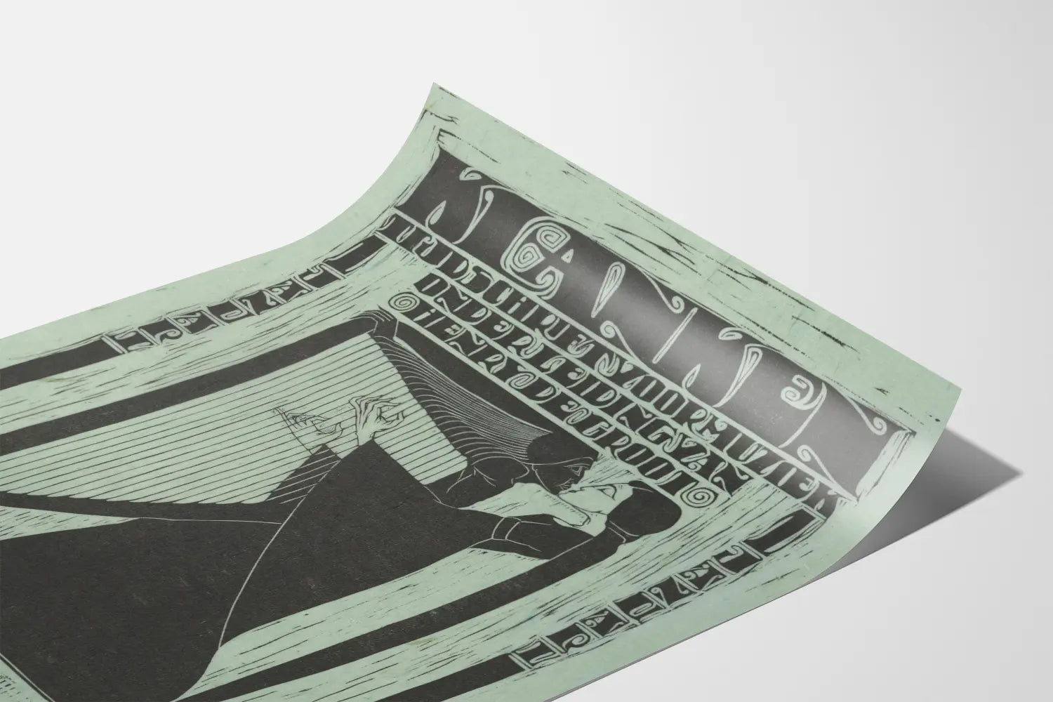 Entdecken Sie dieses künstlerische Plakat im Art Déco-Stil, perfekt für eine außergewöhnliche Wanddekoration. Dieses Poster zeigt ein stilisiertes Paar in Schwarzweiß, bei dem die Figuren in einer zarten und eleganten Umarmung verbunden zu sein scheinen, was die Vereinigung und Harmonie symbolisiert. Die Komposition integriert eine Harfe mit fein gezeichneten Saiten, die eine musikalische und poetische Welt evoziert. Das Ganze wird von sehr grafischen typografischen Zeichen eingerahmt, die typisch für das Design Anfang des 20. Jahrhunderts sind und dieser Wanddekoration einen Vintage- und Raffinesse-Charme verleihen. Dieses auf hellem Hintergrund gedruckte Bild hebt die Meisterschaft im Strich und eine schlichte Arbeit hervor, die jedem Raum eine künstlerische und elegante Note verleiht. Nutzen Sie dieses Poster, um ein Wohnzimmer, ein Büro oder einen Musikraum zu personalisieren und dabei einen kulturellen sowie ästhetischen Akzent zu setzen. Diese Art von Plakat, inspiriert von alten Kulturmagazinen, verbindet Kunst und Typografie der Epoche und zollt der Musik und der visuellen Poesie Tribut. Die Präsenz der Harfe, ein edles und zartes Instrument, verstärkt das musikalische und romantische Thema dieser einzigartigen, schwarz-weißen Illustration, die sich leicht in einen modernen oder klassischen Dekorstil integrieren lässt. Gönnen Sie sich ein Werk, das eine Geschichte zwischen Form, Klang und Gefühl erzählt – ideal für Liebhaber grafischer Kunst und origineller Wanddekoration.