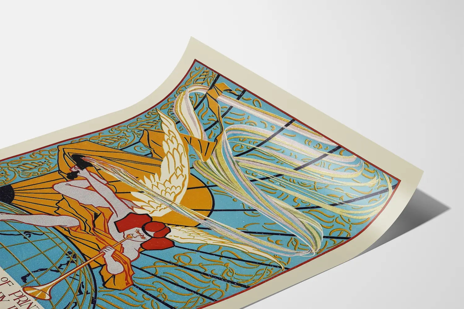 Dieses vintage Plakat im Art Déco Stil ist ein dekoratives Stück, das perfekt ist, um Ihrem Interieur eine elegante und charaktervolle Note zu verleihen. Es zeigt einen geflügelten Engel im Flug, der in eine Trompete bläst und gleichzeitig eine Fackel hält. Dieses kraftvolle Bild ruft eine reiche und symbolische grafische Welt hervor. Der Engel breitet seine weißen Flügel vor einem blauen Hintergrund mit stilisierten goldenen Ornamenten aus und fliegt über eine blaue Sphäre, die mit Linien versehen ist und eine Weltkarte erinnert, wodurch Bewegung und Energie in die Komposition gebracht werden.