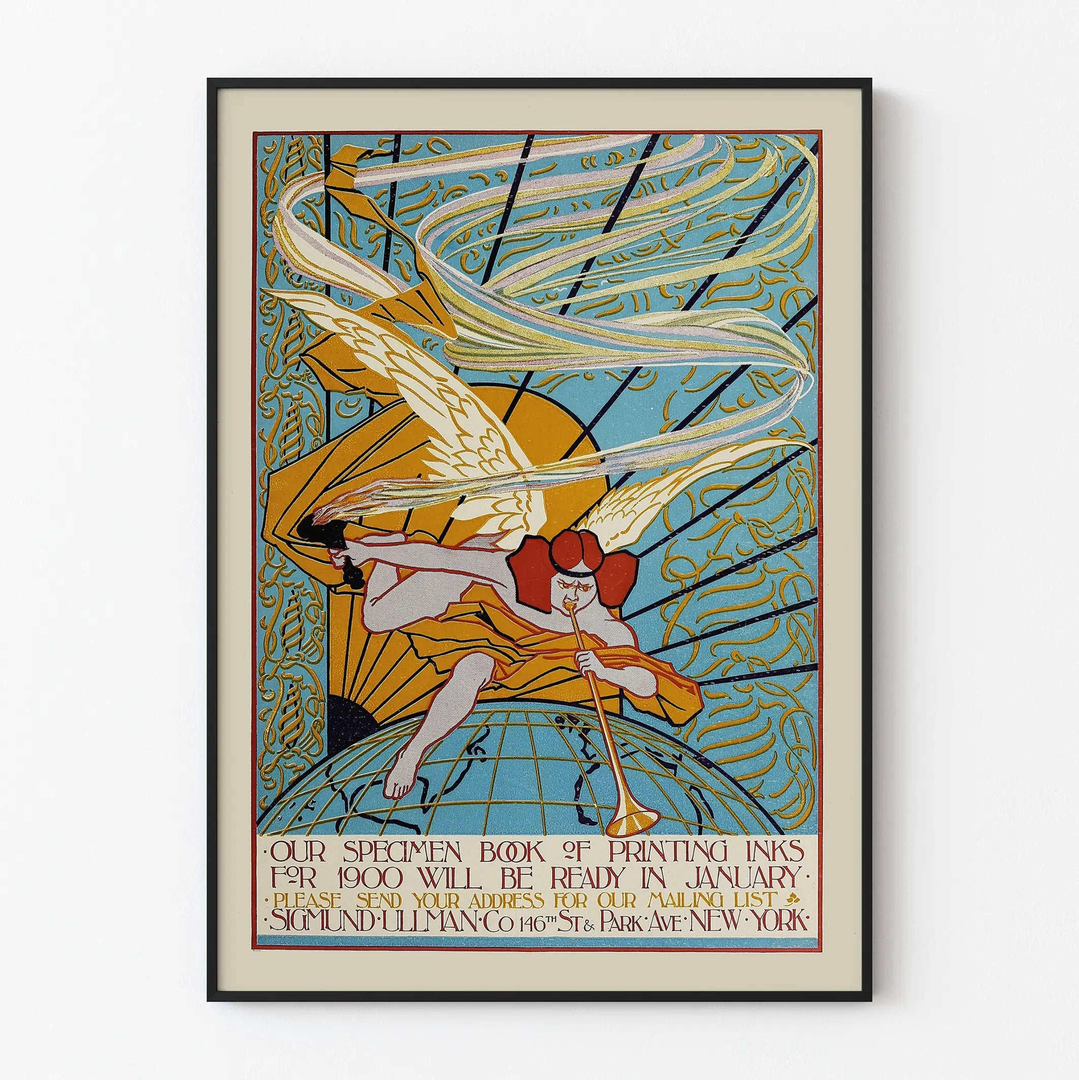 Perfekt geeignet als Wandposter, ist dieser kunstdruck ideal, um ein Wohnzimmer, Büro oder eine Bibliothek zu schmücken und eine einzigartige, inspirierende Atmosphäre zu schaffen. Sein originelles Grafikdesign und die charakteristische Typografie am unteren Rand kündigen einen Katalog von Druckfarben für das Jahr 1900 an, was seine Authentizität und den Stil der Epoche unterstreicht.