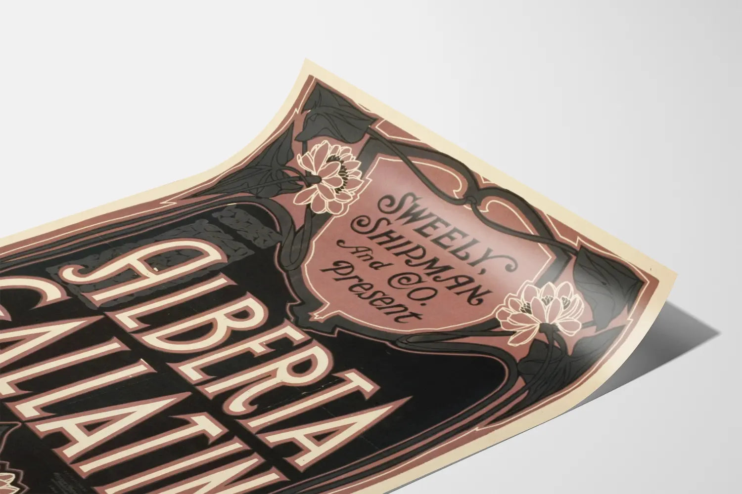 Dieses Plakat im Jugendstil präsentiert ein elegantes und typografisches Design rund um den Namen „Alberta Gallatin“. Es besticht durch eine subtile Farbpalette, die Nuancen von Staubrosa, Schwarz und Creme miteinander verbindet und eine retro- und zarte Atmosphäre schafft. Die Komposition ist von stilisierten Blumenmotiven eingerahmt, die durch weiße Blüten mit detaillierten Blättern und großen Blättern gekennzeichnet sind und dem Gesamtbild einen organischen und dekorativen Charakter verleihen. Die Großbuchstaben, breit und leicht schattiert, fügen sich harmonisch in den Rahmen ein, der mit Schwüngen und geometrischen Formen mit abgerundeten Konturen verziert ist. Oben befindet sich eine kleinere Inschrift mit „Sweely, Shipman and Co. Present“, die diesem visuellen Stück eine Note von Authentizität und geschäftlichem Kontext verleiht. Dieses Vintage-Poster ist ein perfektes Wanddekorationselement, um Ihrem Interieur eine klassische und künstlerische Note zu verleihen. Ob im Wohnzimmer, Büro oder in einer Galerie – dieses Poster lädt zu einer eleganten und raffinierten Betrachtung ein und ehrt die Ästhetik des frühen 20. Jahrhunderts. Sein grafisches Design und sein ikonischer Jugendstil-Stil werden Ihre Wände mit Originalität und Charme schmücken und gleichzeitig einen ausgeprägten historischen und visuellen Reiz vermitteln. Eine Wanddekoration, die Liebhaber alter Typografie und grafischer Kreationen mit starkem stilistischem Charakter begeistern wird.