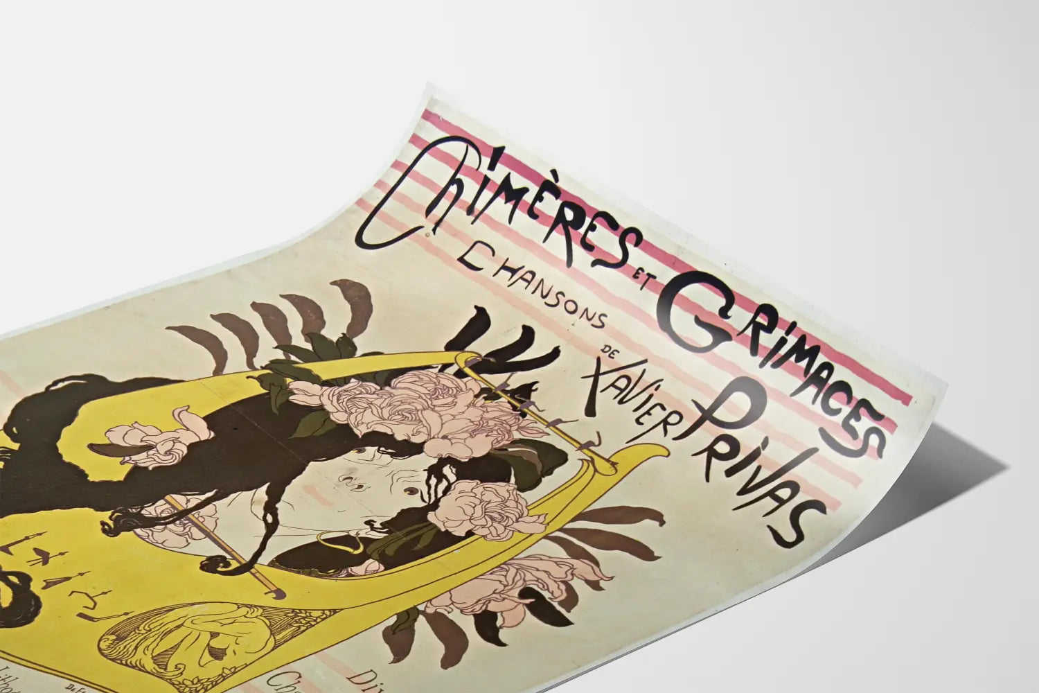 Dieses Poster besticht durch seine geschwungenen Linien, die typisch für den Jugendstil sind, mit einem subtilen Spiel zwischen sanften Farben wie blassem Rosa, tiefem Grün der Blätter und dem leuchtenden Gelb der Harfe. Der Kontrast zwischen den schwarzen Haaren und den gezeichneten Konturen verleiht dem Werk eine visuelle Tiefe und einen zeitlosen Charme. Die handschriftlichen Schriftzüge oben auf dem Poster verleihen eine authentische und poetische Note und unterstreichen die Einzigartigkeit dieses Stücks für Ihre Wanddekoration.