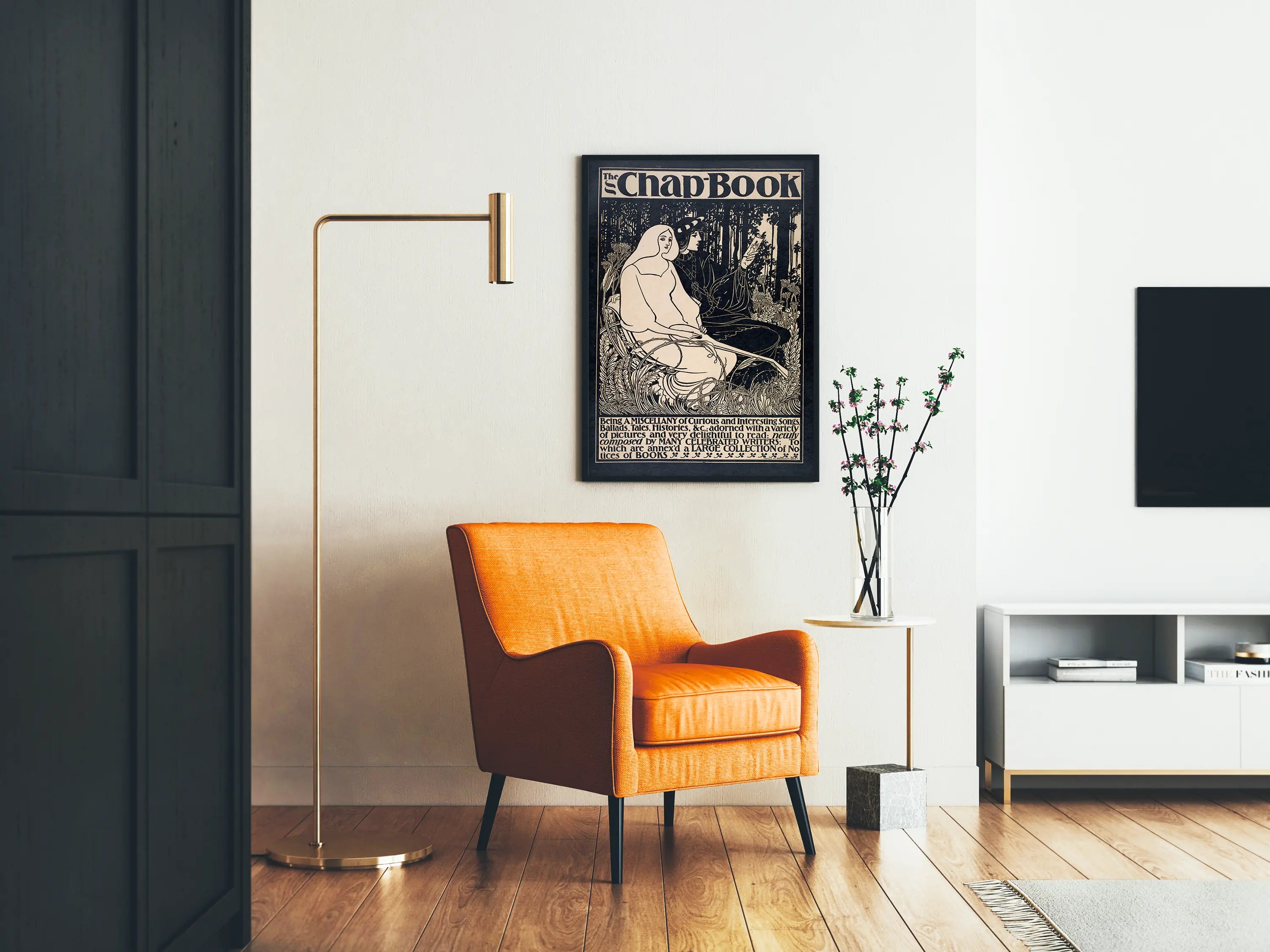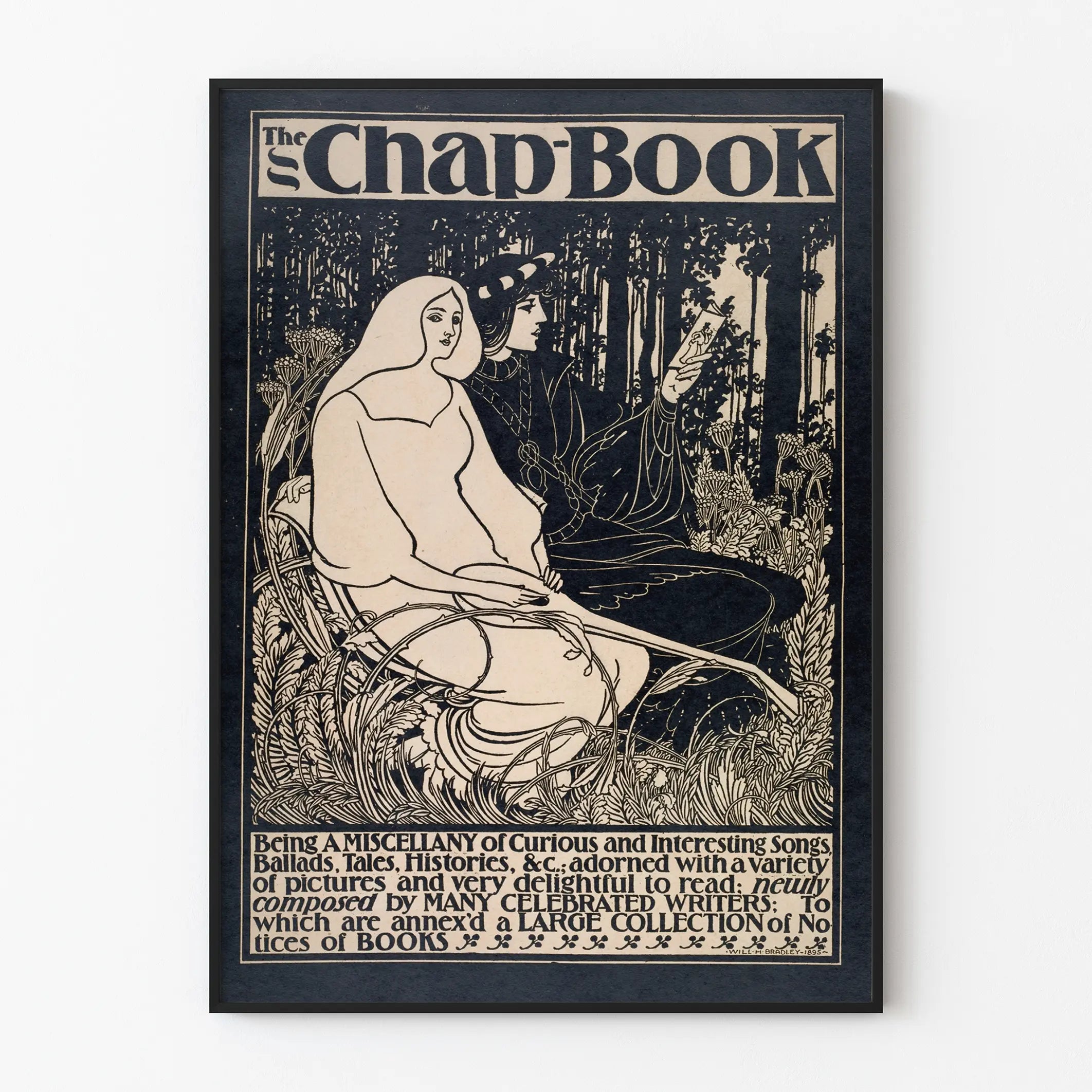 Entdecken Sie dieses Plakat im Jugendstil, inspiriert von klassischer und vintage Illustration. Diese Wanddekoration zeigt eine zarte Szene in Schwarzweiß, bei der zwei Figuren mit klaren, eleganten Linien in einer sehr detaillierten natürlichen Umgebung sitzen. Die Pflanzen und Blätter, die die Figuren umgeben, verleihen diesem Plakat eine organische und faszinierende Note, perfekt für eine poetische und nostalgische Atmosphäre. Der Text „The Chap Book“ am oberen Rand sowie die Beschriftungen unten fügen einen typografischen Charme vergangener Zeiten hinzu, ideal für Liebhaber von Wanddekorationen im Retro- und Literarstil. Dieses Poster ist eine originelle Wahl, um Ihre Wände mit einem künstlerischen und historischen Akzent zu schmücken, besonders in Innenräumen, die sich an alten grafischen Künsten orientieren. Seine ausgewogene Komposition zwischen gefüllten und leeren Flächen unterstreicht die Feinheit der Zeichnung und bietet gleichzeitig eine beeindruckende visuelle Wirkung. Ob im Wohnzimmer, in einer Bibliothek oder im Büro – dieses Vintage-Plakat trägt dazu bei, eine einzigartige Atmosphäre zu schaffen, die Nostalgie und visuelle Eleganz verbindet. Es richtet sich an Liebhaber von Grafikdesign, dekorativer Kunst sowie an Fans alter Schwarzweiß-Poster. Bringen Sie ein Wandstück in Ihre Inneneinrichtung, das eine Geschichte erzählt und gleichzeitig Ihren Geschmack für schlichte und dennoch anspruchsvolle Werke unterstreicht.