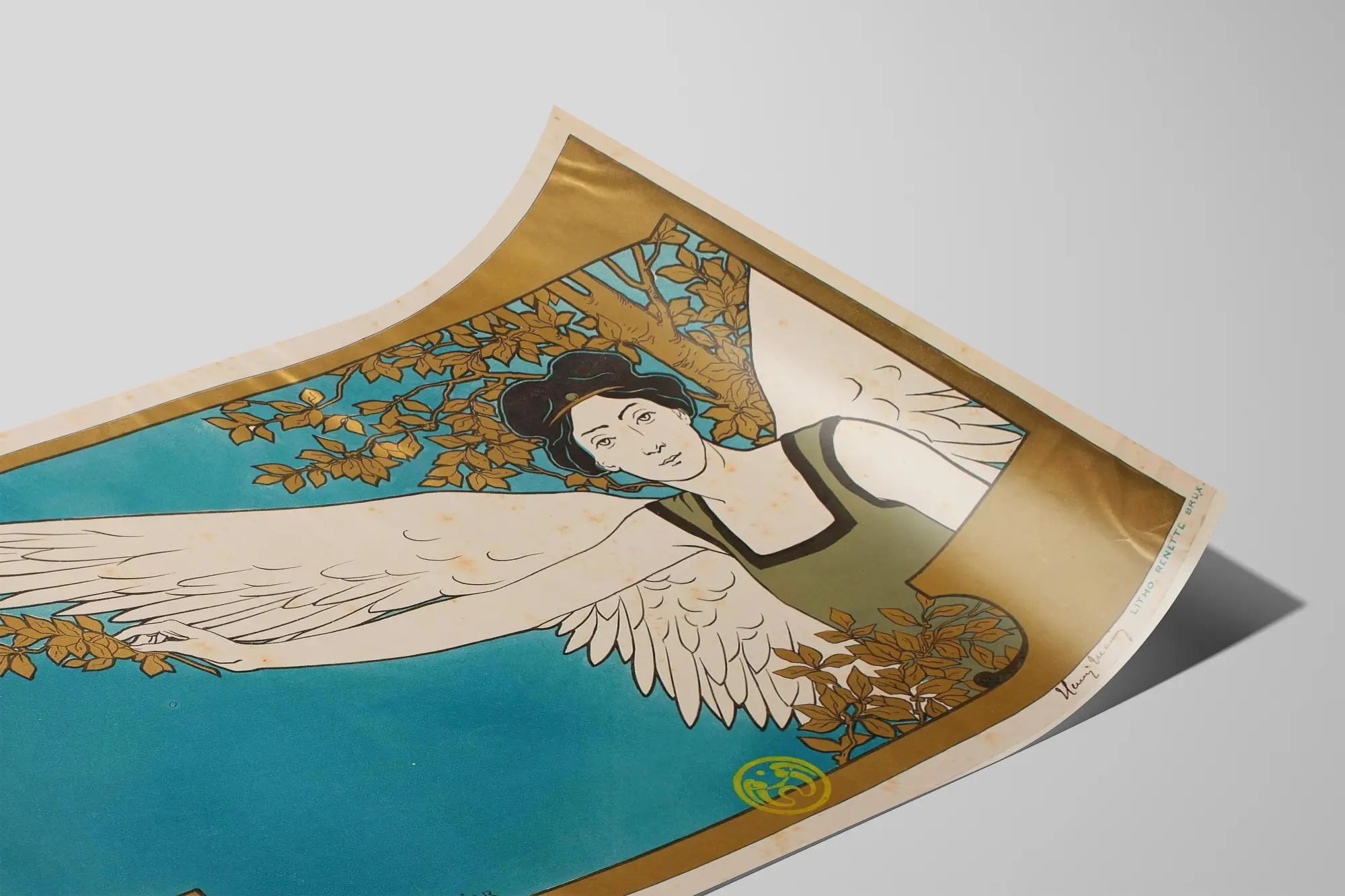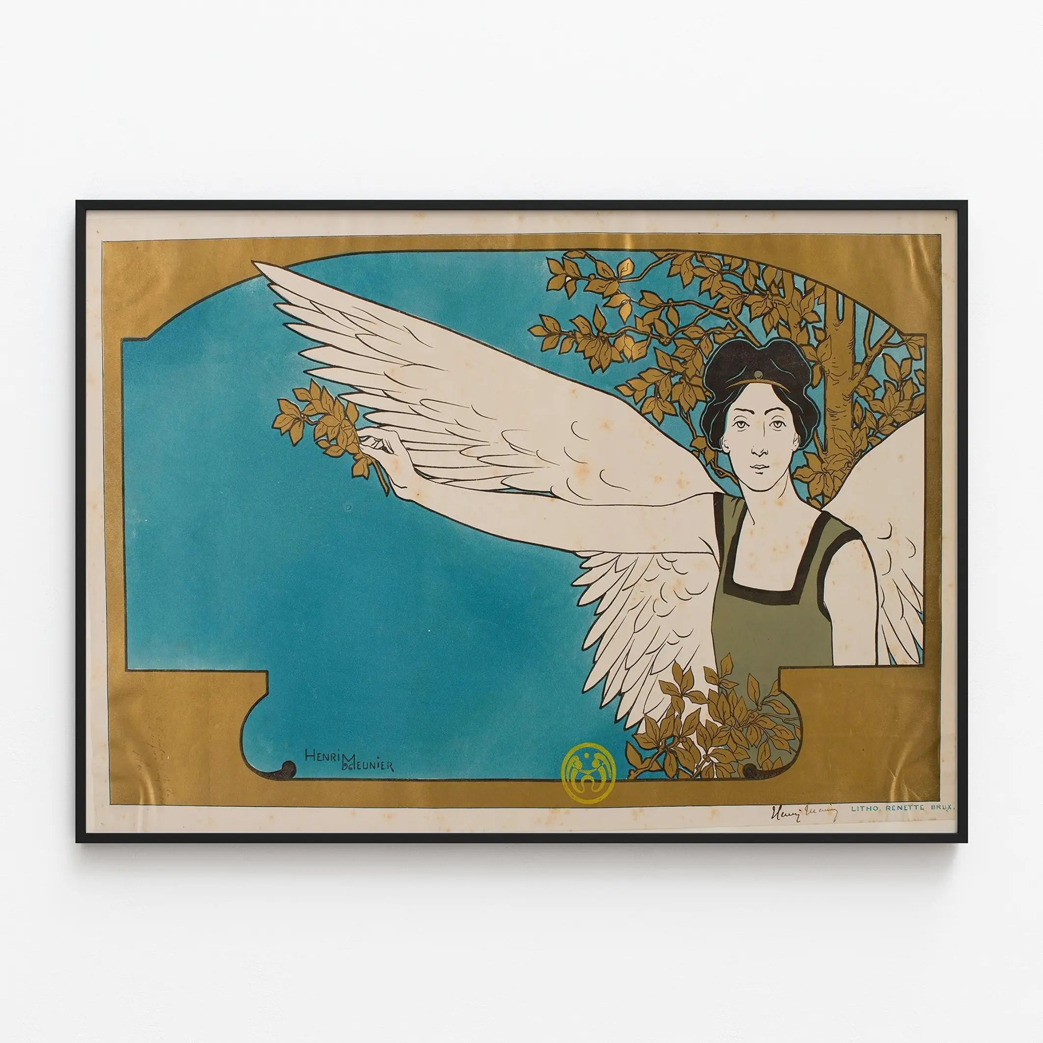 Entdecken Sie dieses elegante Jugendstil-Poster mit dem Titel „Der Musikführer“, ein dekoratives Wandbild signiert von Henri Meunier. Dieses Plakat zeigt eine geflügelte Frauenfigur, Symbol der Inspiration und Muse, vor einem azurblauen Hintergrund, eingerahmt in Gold. Der grafische Stil, charakteristisch für die Anfänge des 20. Jahrhunderts, verbindet Feinheit der Linien mit einer harmonischen Farbauswahl und bietet eine visuelle Darstellung, die sowohl schlicht als auch raffiniert ist. Dieses Wanddekor, im Lithografieverfahren gedruckt, ist ein emblematisches Beispiel der Jugendstil-Ära und eignet sich perfekt für Kunst- und Musikliebhaber, die ihr Interieur mit einem charaktervollen und poetischen Plakat verschönern möchten. Ideal zum Einrahmen verleiht dieses Werk jedem Raum, sei es ein Wohnzimmer, ein Büro oder ein Musikraum, eine Note von Eleganz und Geschichte. Seine künstlerisch ausgewogene Komposition, die die Zartheit der Figur mit der markanten Präsenz der Natur um sie herum verbindet, macht es zu einem Bild, das ins Auge fällt und zur Betrachtung einlädt. Wählen Sie dieses „Der Musikführer“-Plakat, um Ihrer Wanddekoration einen vintage- und kulturvollen Geist einzuhauchen und gleichzeitig eine meisterhafte Arbeit der traditionellen Kunst mit großer Feinheit zu präsentieren. Dieses Poster wird alle begeistern, die die Verbindung zwischen grafischer Kunst und natürlichen Elementen schätzen, veredelt durch einen einzigartigen und zeitlosen Stil.