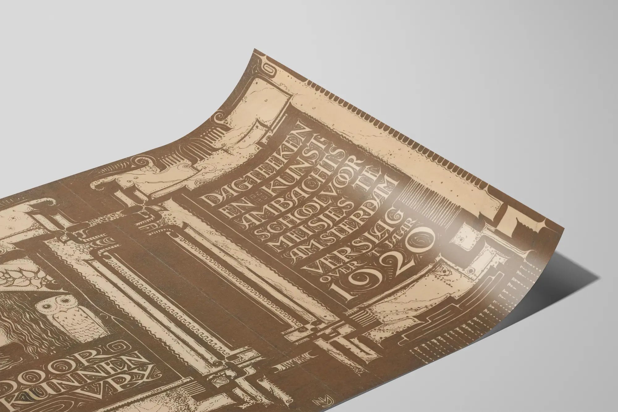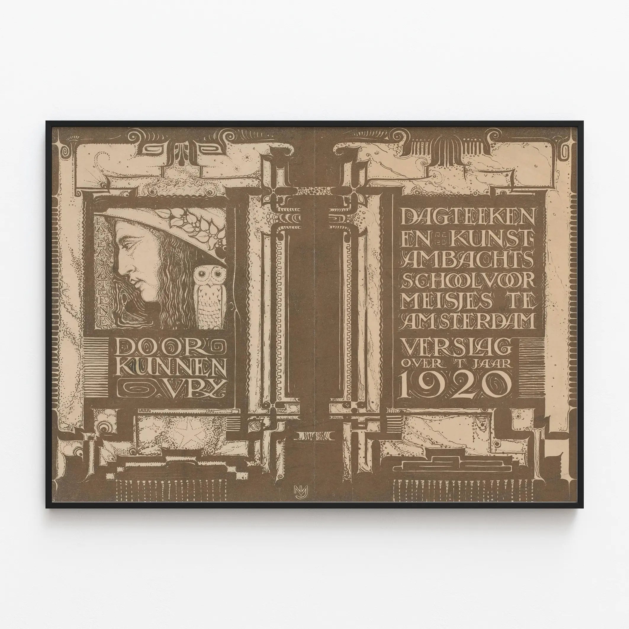 Dieses Plakat im Jugendstil zeichnet sich durch sein detailliertes und sorgfältiges Grafikdesign aus, typisch für den frühen zwanzigsten Jahrhundert. Es zeigt ein Profilgesicht mit Hut, neben einer stilisierten Eule, und ruft Weisheit sowie Kreativität hervor. Es verweist auf die Kunst- und Handwerksschule für Mädchen in Amsterdam und trägt die Angabe eines Jahresberichts für das Jahr 1920. Dieses dekorative Poster ist ideal für Liebhaber von Vintage-Kunst, historischen Kunstschulen und Wanddekorationen im Retro-Stil. Mit seinen organischen Linien und geometrischen Mustern fängt es perfekt den Geist der Illustration und des Designs der 1920er Jahre ein. Als Wanddekoration verleiht dieses Plakat einem Raum, egal ob modern oder klassisch, einen Hauch von Eleganz und Kultur. Es ist perfekt für die Präsentation im Wohnzimmer, Büro oder in einer Bibliothek und wird ein einzigartiges Ausstellungsstück sein, das durch seine Ästhetik und seine visuelle Geschichte begeistert. Dieses grafische Bild lädt zur Entdeckung angewandter Kunst und des Designs der Epoche ein und verleiht Ihrem Raum Authentizität und Tiefe. Ideal für alle, die ein stilisiertes Werk in ihre Sammlung von Postern oder Wanddekorationen im Stil der künstlerischen Bewegungen des frühen zwanzigsten Jahrhunderts integrieren möchten.