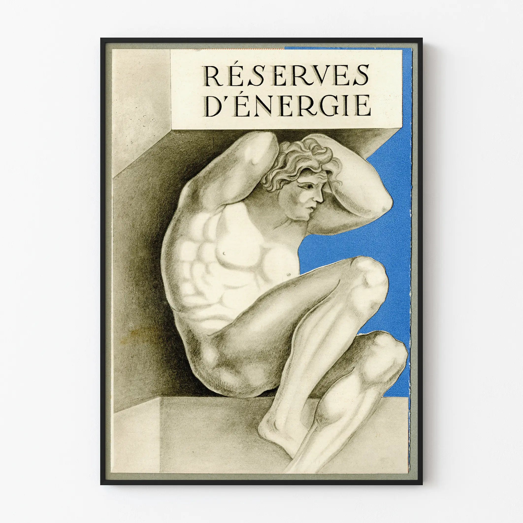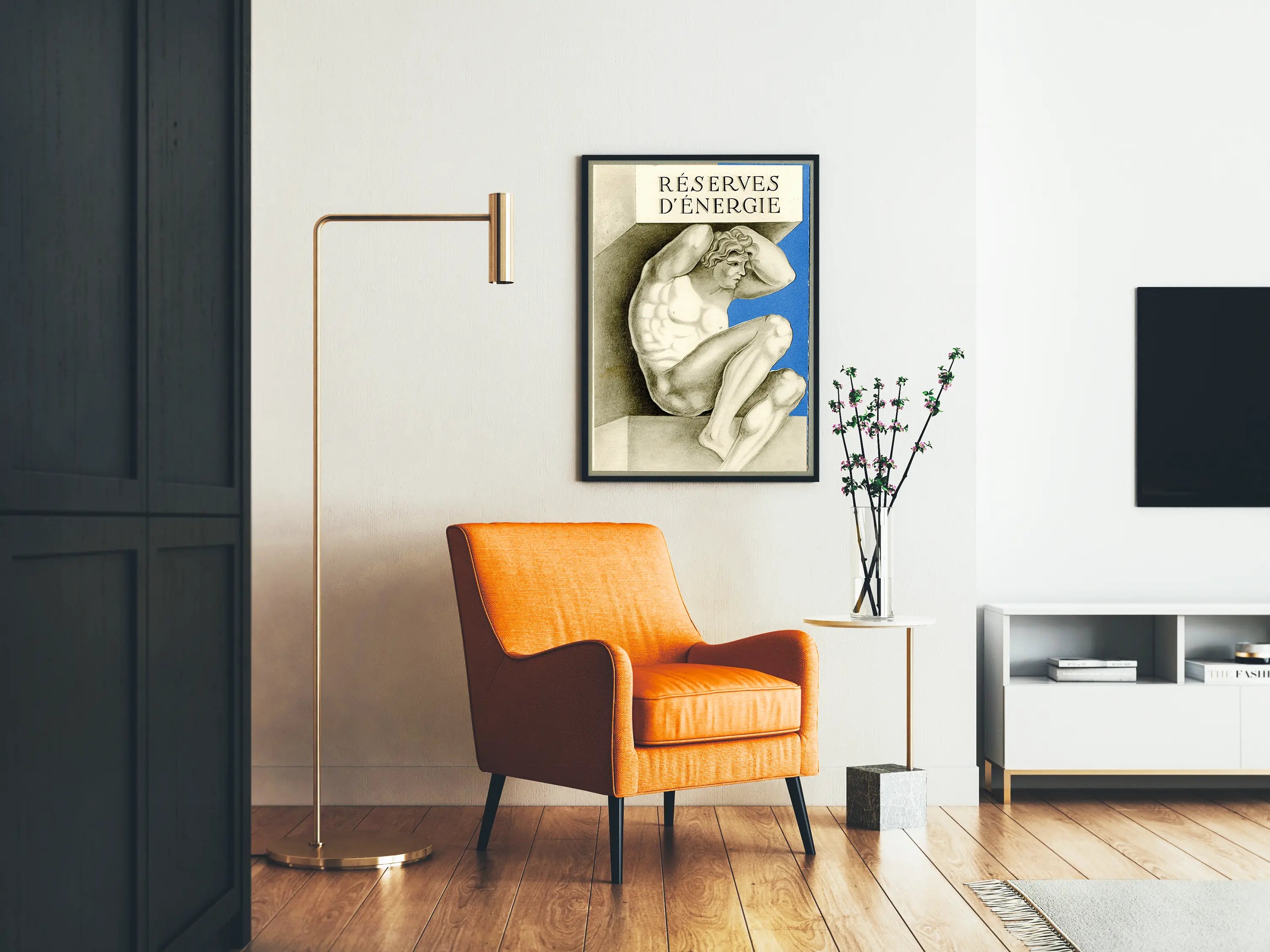 Dieses Poster mit dem Titel „Energiespeicher“ zeigt ein skulpturales Werk, das einen muskulösen Mann in sitzender Haltung darstellt, der scheinbar ein schweres Gewicht trägt. Die Zeichnung ist hauptsächlich in subtilen Grautönen gehalten, die die detaillierte Muskulatur und den konzentrierten Ausdruck der Figur hervorheben und einen Eindruck von zurückhaltender Kraft vermitteln. Der Hintergrund ist schlicht und geometrisch, mit einem lebhaften blauen Farbakzent, der im Kontrast zur allgemeinen Neutralität des Kunstwerks steht. Diese Komposition ruft eine latente Energie und innere Stärke hervor, was sie zu einer inspirierenden Wahl für jede Wanddekoration macht. Das Poster fügt sich perfekt in ein modernes Interieur oder einen Raum mit künstlerischer Atmosphäre ein und verleiht ihm sowohl einen klassischen als auch einen ausdrucksstarken Charakter. Dank seines klaren und kraftvollen Designs ist dieses dekorative Plakat ideal, um einen Bereich für Wohlbefinden, Nachdenken oder Kreativität aufzuwerten. Es verleiht Eleganz und Dynamik und lädt gleichzeitig zur Betrachtung ein. Für Liebhaber figurativer Kunst und außergewöhnlicher Wandgestaltung ist dieses gedruckte Wandbild ein starkes ästhetisches Element, das einen Salon, ein Büro oder einen Fitnessraum auf unterschiedliche Weise schmückt. Dieses Dekorationsobjekt wird so zu mehr als nur einem einfachen Bild; es verkörpert eine Symbolik rund um innere Stärke und den Umgang mit persönlichen Ressourcen, dargestellt durch die Haltung der Figur. Sein Format und die feinen Details der Zeichnung fördern die visuelle Qualität und bieten ein intensives, durchdachtes Dekorationserlebnis.