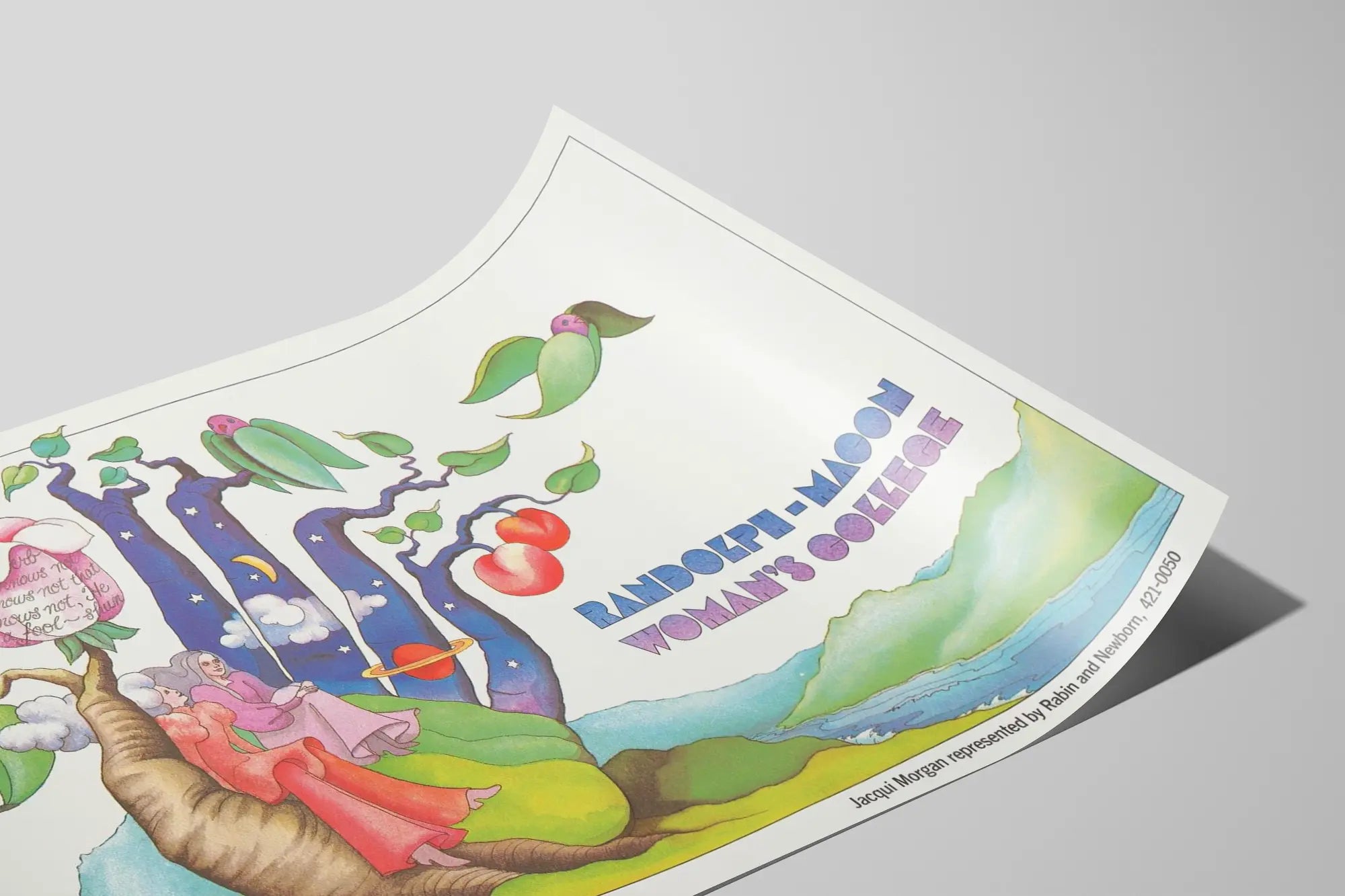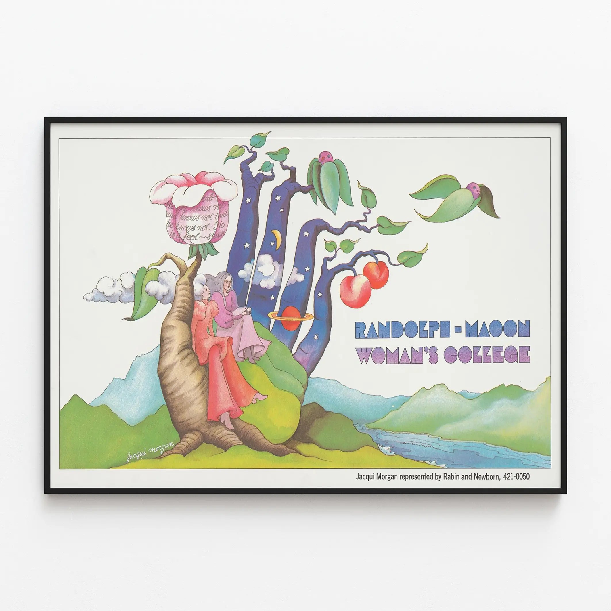 Dieses Plakat des Randolph-Macon Woman’s College, signiert von Jacqui Morgan, ist ein einzigartiges Wanddekorationselement, das durch seinen poetischen und träumerischen Stil Aufmerksamkeit erregt. Das Design zeigt zwei weibliche Figuren, die auf organisch geformten, bunten Baumwurzeln sitzen. Der Baumstamm verwandelt sich in stilisierte Äste mit himmlischen Mustern – Sterne, Mond, Wolken – und roten Früchten, was eine zugleich sanfte und geheimnisvolle Atmosphäre schafft. Die Farbpalette aus sanften Grüntönen, Rosé- und Violetttönen sowie tiefen Blau schafft eine ausgewogene und harmonische visuelle Akzentuierung. Der Text „Randolph-Macon Woman’s College“ in geometrischer Schriftart, rechts im Bild platziert, vervollständigt die Gestaltung mit einem retro-inspirierten und grafischen Akzent. Dieses Plakat eignet sich perfekt als Wanddekoration in einem zeitgenössischen oder retro-inspirierten Interieur, sei es im Wohnzimmer, Büro oder Lernraum. Es spricht Liebhaber grafischer Kunst und Vintage-Poster an sowie jene, die eine originelle Wandgestaltung schätzen, die natürliche und symbolische Elemente verbindet. Ob Sie sich für Illustration, Grafikdesign oder Inneneinrichtung begeistern – dieses Poster wird Ihre Wände mit einem Hauch visueller Poesie und einzigartigem Charme veredeln. Verleihen Sie Ihrem Wohnraum eine inspirierende und sanfte Atmosphäre mit diesem Plakat des Randolph-Macon Woman’s College, einem echten Kunstobjekt, das elegant und unverwechselbar ist.