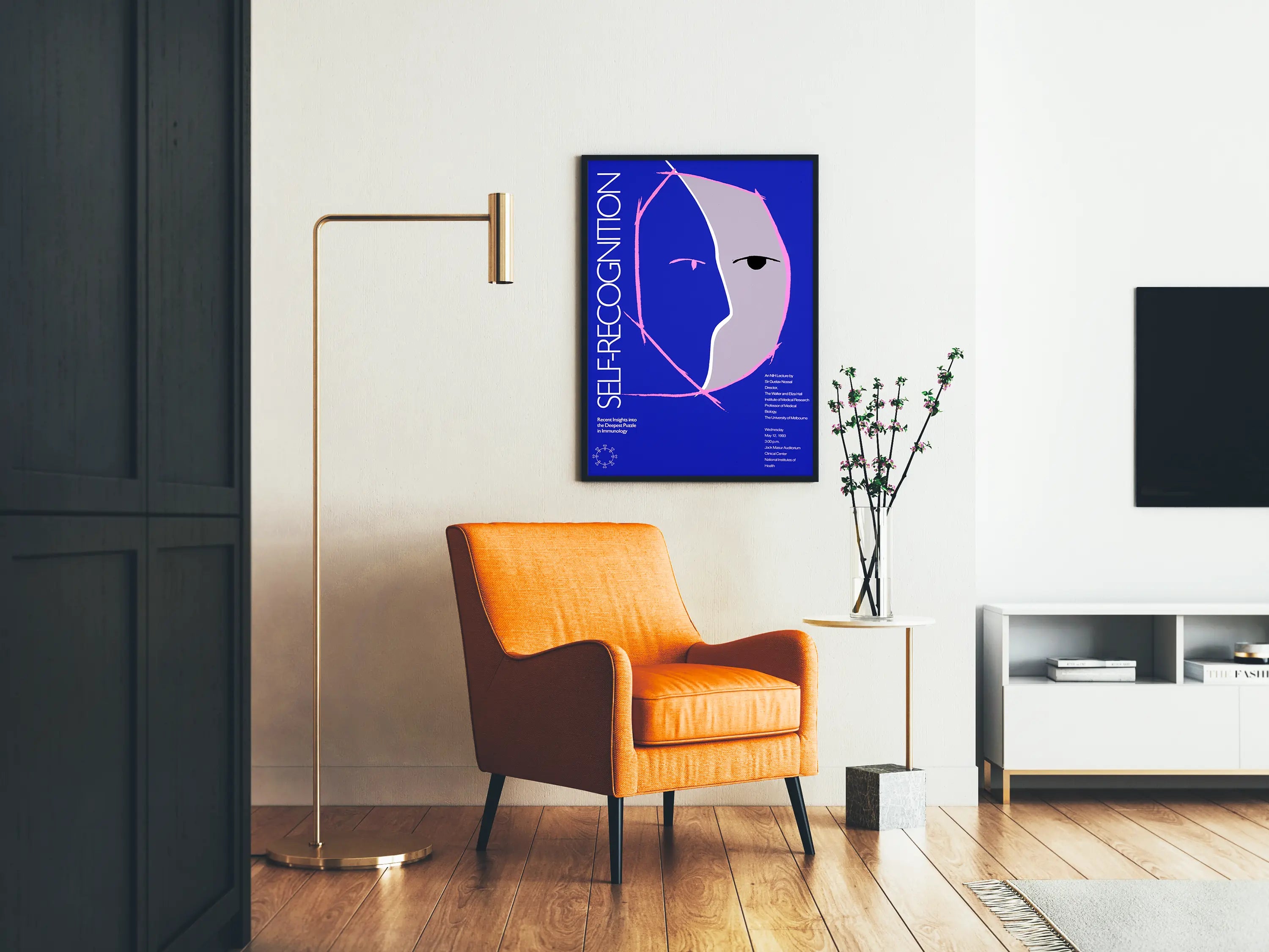 Bringen Sie einen modernen und originellen Akzent in Ihr Zuhause mit diesem dekorativen Poster mit dem Titel „Self-Recognition“. Dieses grafische Werk setzt auf eine kontrastreiche Farbpalette, dominiert von einem tiefblauen Hintergrund, verziert mit rosafarbenen Konturen und vereinfachten geometrischen Formen, die ein stilisiertes Gesicht bilden. Der klare und abstrakte Stil dieses Posters macht es zu einer perfekten Wahl für eine zeitgenössische Wanddekoration und verleiht Ihrem Raum eine künstlerische und nachdenkliche Atmosphäre. Das Design legt den Fokus auf eine doppelte Gesichtssilhouette, die Themen der Reflexion und Selbstwahrnehmung andeutet und so auch die kognitive und lernfreudige Stimmung eines Arbeitszimmers oder Büros bereichern kann. Mit geschwungenen Linien und minimalistischen Formen setzt dieses Poster auf Schlichtheit, um die Aufmerksamkeit zu fesseln, ohne visuell zu überladen. Dieses Wandbild ist ideal für Liebhaber grafischer Kunst und für diejenigen, die ihre Wände mit einzigartigen und ausdrucksstarken Elementen verschönern möchten. Der rosafarbene Ton und die weiße Mittellinie strukturieren das Gesicht und schaffen ein visuelles Gleichgewicht, das an eine feine Komposition erinnert. Neben seiner ästhetischen Anziehungskraft weckt dieses Poster die Verbindung zwischen Kunst und Wissenschaft, wie die kleinen Schriftzüge andeuten, die eine wissenschaftliche Konferenz suggerieren. Es spricht sowohl Liebhaber zeitgenössischer Kunst als auch akademische oder medizinische Kreise an, die ihre Umgebung mit bedeutungsvoller Wanddekoration gestalten möchten. Ob zur Verschönerung eines Wohnzimmers, Flurs, Büros oder einer Bibliothek – dieses Poster zum Thema „Self-Recognition“ wird zum echten Blickfang, der zum Nachdenken anregt und sich mühelos in verschiedene Einrichtungsstile integrieren lässt. Die gewählte mutige Farbgestaltung macht es zu einem schicken und modernen Poster, ideal, um oft leere Wände aufzupeppen und eine kreative Atmosphäre in Ihrem Zuhause zu schaffen.