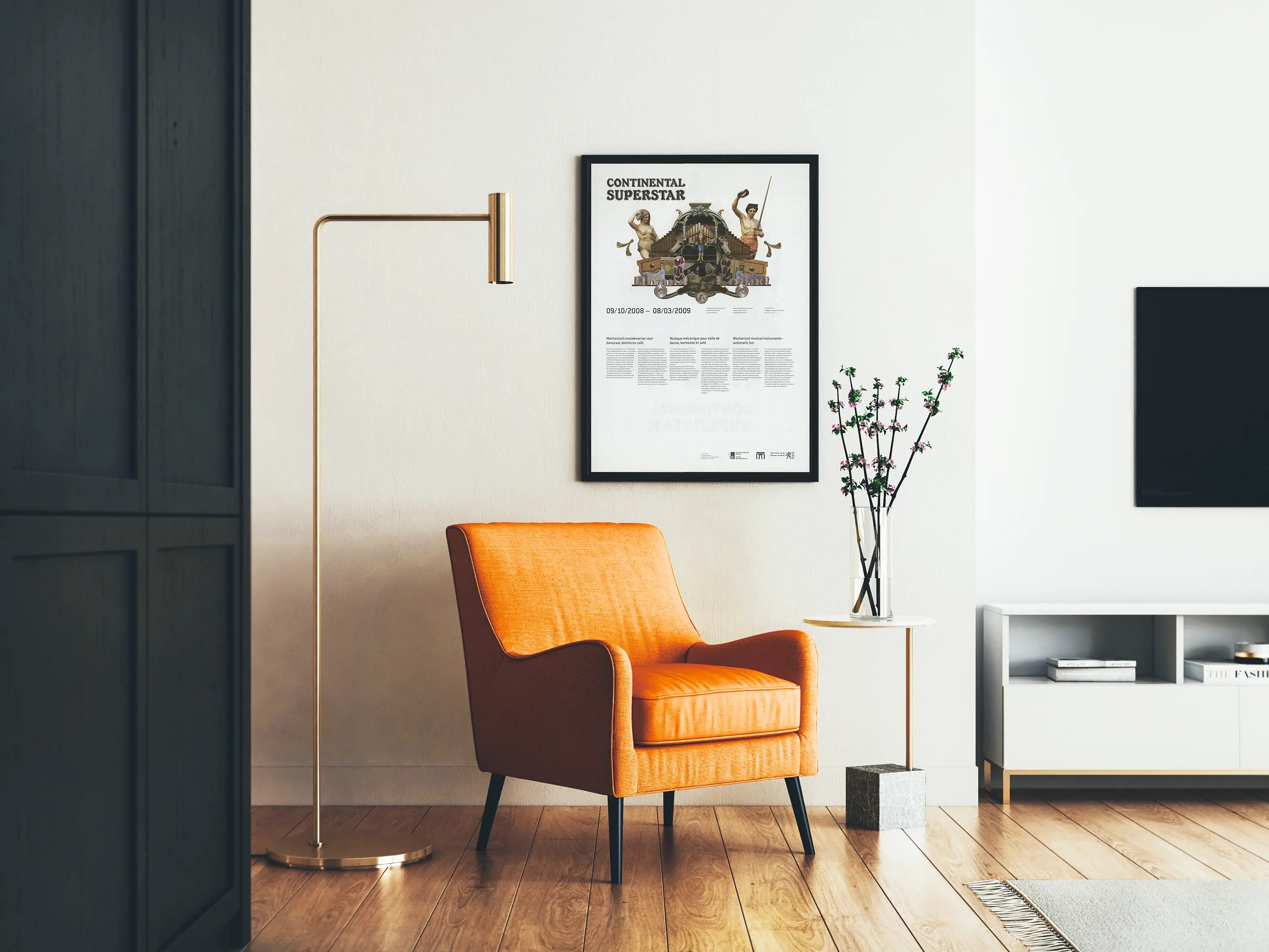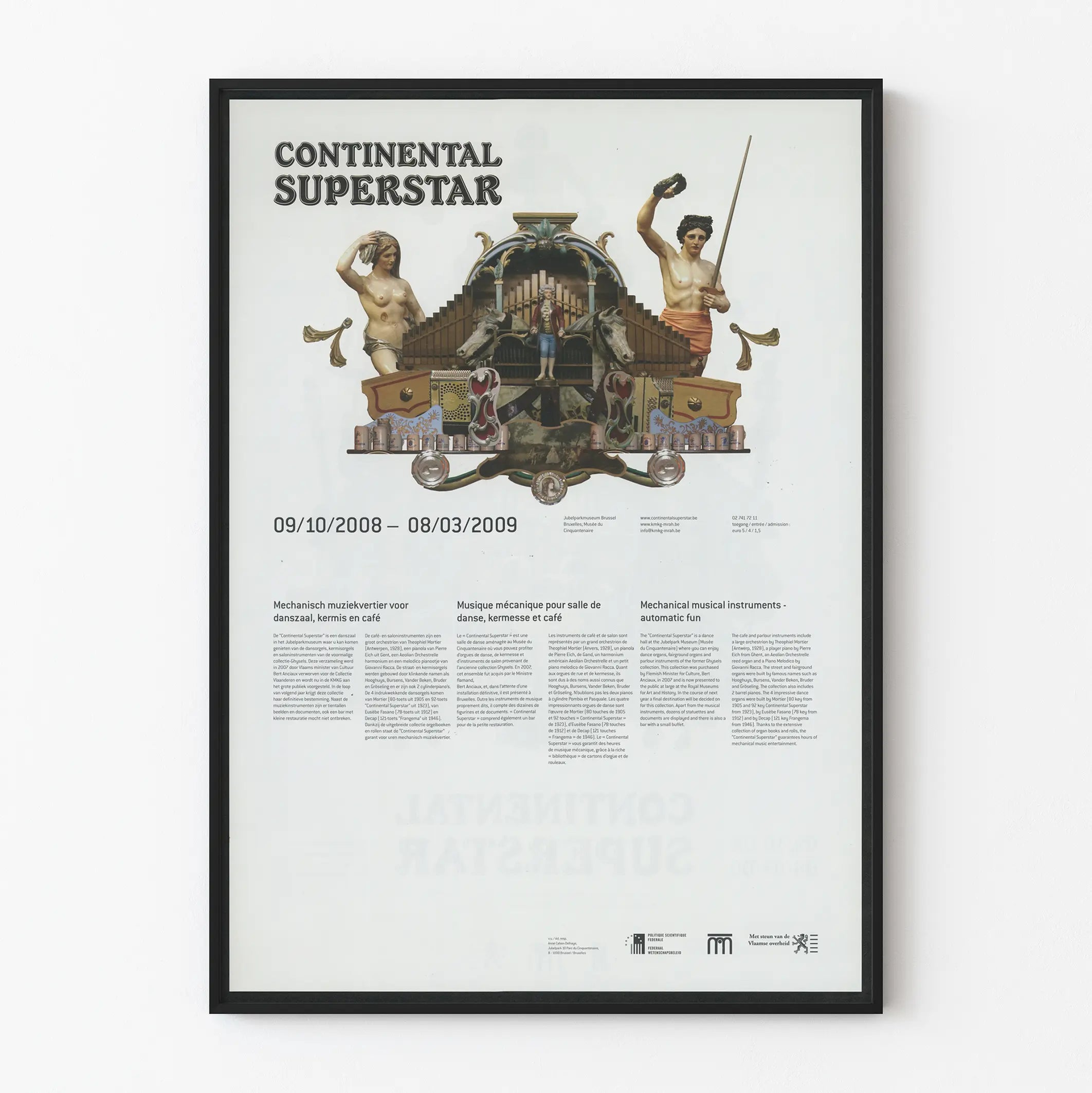 Dieses dekorative Stück wurde anlässlich einer Ausstellung im Jubelparkmuseum in Brüssel geschaffen, die von Oktober 2008 bis März 2009 stattfand. Es hebt mechanische Instrumente wie Straßenorgeln, mechanische Klaviere und Musikautomaten hervor, Elemente, die früher bei Jahrmärkten, in Cafés und Tanzsälen unverzichtbar waren. Das Plakat vermittelt durch seine elegante und detaillierte Optik die freundliche und festliche Atmosphäre dieser Orte und lädt dazu ein, ein oft unbekanntes akustisches und visuelles Erbe neu zu entdecken.