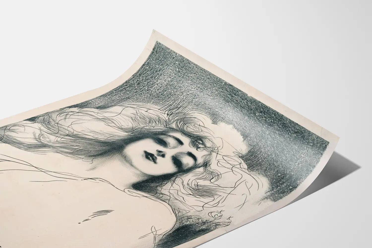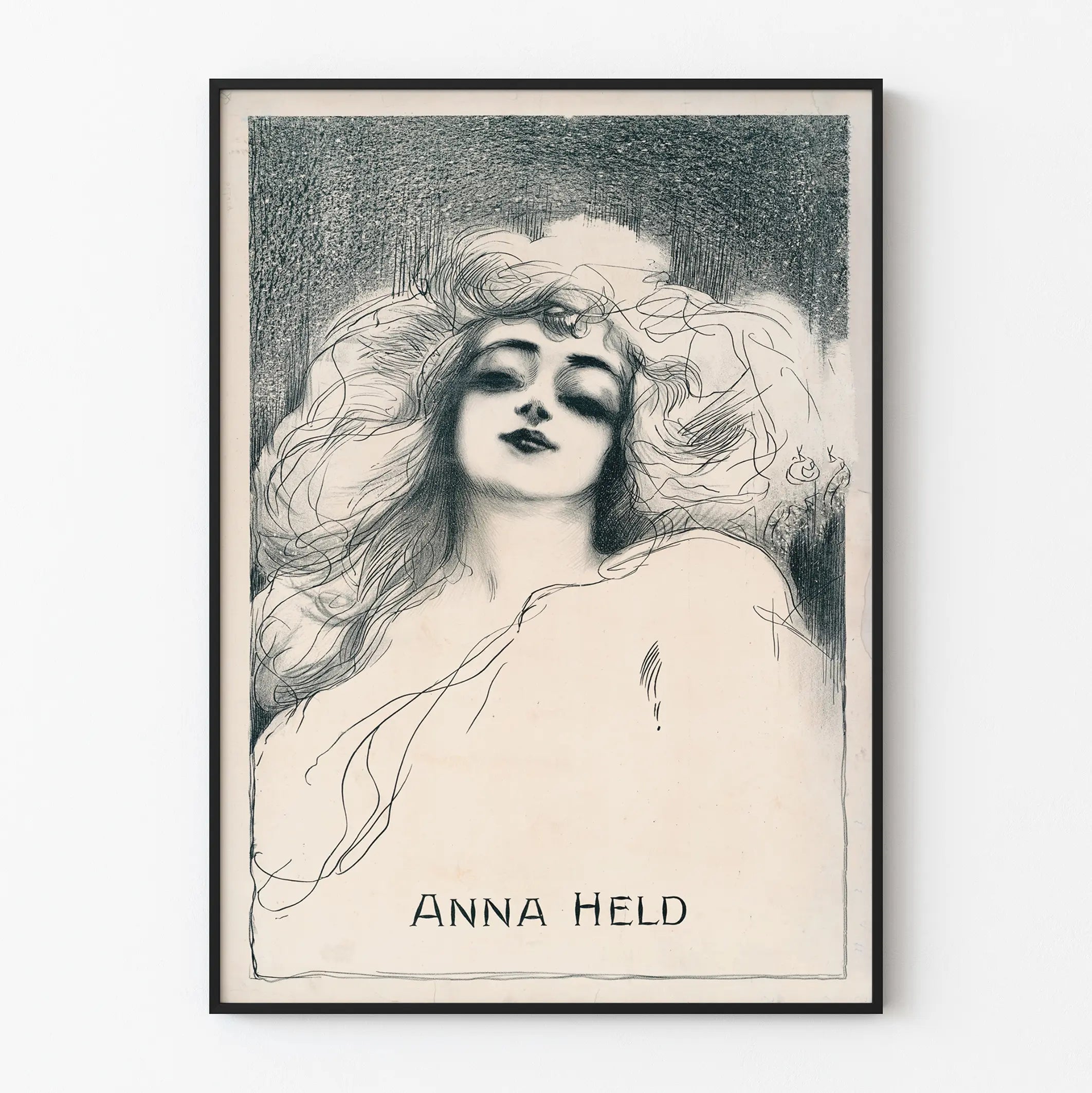 Entdecken Sie dieses künstlerische Vintage-Poster, das Anna Held darstellt – eine Lithografiekreation, die durch die Feinheit der Zeichnung und die Zartheit der Linien besticht. Dieses Plakat präsentiert ein stilisiertes Frauenporträt, das einen Ausdruck einfängt, der zugleich geheimnisvoll und bezaubernd ist, mit ausdrucksstarken Details der Haare und des Gesichts, ausgeführt mit Bleistift oder Kohlestift, vor einem kontrastreichen schattierten Hintergrund. Diese Wanddekoration passt perfekt in eine retro-elegante Welt und ist ideal, um eine künstlerische und kulturelle Atmosphäre in Ihrem Zuhause zu schaffen. Die Zeichnung verbindet leichte Linien mit präzisen Schraffuren und zeigt handwerkliches Können in traditioneller Grafik, wodurch ein authentisches und charaktervolles Wandkunststück entsteht. Dieses Anna-Held-Poster ist besonders geeignet für Liebhaber alter Kunst, originaler Lithografien und subtiler grafischer Kompositionen. Ob im Wohnzimmer, Büro oder in einer Galerie – dieses Wandbild setzt einen starken visuellen Akzent, ohne den Raum zu überladen, dank seiner sanften monochromen Farbpalette, die sich mühelos mit jeder Art von Dekoration kombinieren lässt. Mit der Integration dieses Posters in Ihre Sammlung wählen Sie ein einzigartiges Dekorstück, das Ihren Wänden einen Hauch von Geschichte und klassischer Ästhetik verleiht. Dieses Wandposter richtet sich an alle, die ihr Zuhause mit einer ausdrucksstarken Vintage-Illustration bereichern möchten – ideal für Liebhaber grafischer Kunst und zeitloser Frauenporträts.