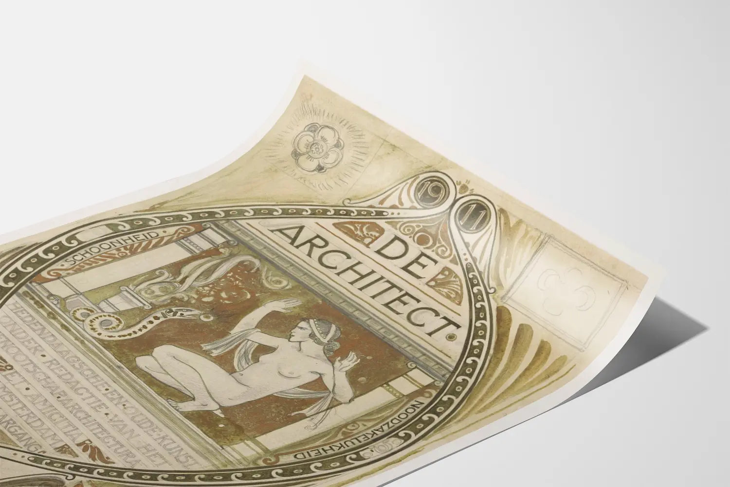 Entdecken Sie dieses originale Vintage-Poster mit dem Titel „De Architect“ aus dem Jahr 1911, perfekt, um Ihre Wände mit einem Hauch alter Kunst und Architektur zu verschönern. Diese Wanddekoration zeigt einen Rahmen mit geschwungenen Linien und floralen Mustern in dezenten Brauntönen, Beigetönen und Grüntönen, der eine Szene mit einer nackten weiblichen Figur in die Knie gehend vor einer stilisierten Schlange präsentiert – ein symbolisches Detail, das diesem Poster eine geheimnisvolle und klassische Note verleiht. Das Design erinnert an eine alte Ästhetik, die architektonische Eleganz mit dekorativer Kunst verbindet, ideal für ein Interieur im Retro- oder Vintage-Stil.