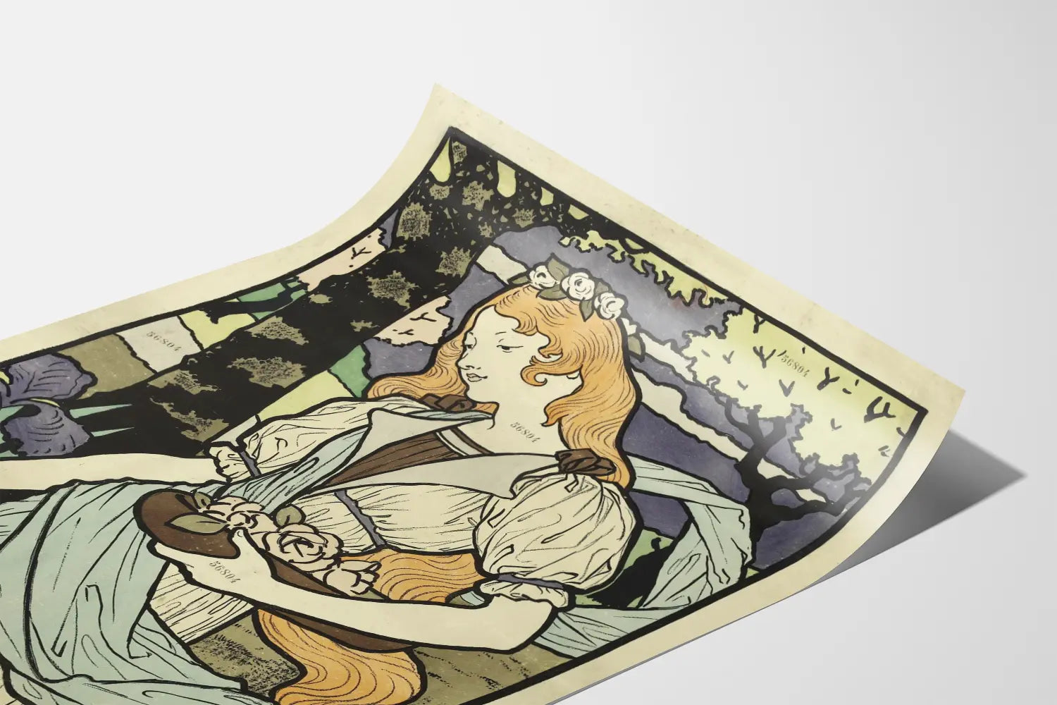 Entdecken Sie dieses künstlerische Vintage-Poster, das die dekorative Kunst mit einer eleganten und zarten Illustration einer Frau mit langen, goldenen Haaren, die mit einem Blumenkranz geschmückt ist, aufwertet. Dieses Wandbild besticht durch seinen markanten grafischen Stil, der an alte Drucktechniken erinnert, mit klaren schwarzen Konturen und sanften Farben, die eine romantische und nostalgische Atmosphäre hervorrufen. Die Komposition zeigt die Frau in einer stilisierten natürlichen Umgebung, umgeben von violetten Iris und schlichten Blättern, wodurch ein harmonisches und poetisches Bild entsteht, das sich perfekt in ein Ambiente im Boho- oder Jugendstil einfügt. Dieses dekorative Plakat ist ideal, um Ihre Wände mit einem Hauch von Eleganz und Raffinesse zu bereichern und gleichzeitig Charme und Persönlichkeit in Ihren Wohnraum zu bringen. Dank seines ausgearbeiteten Grafikstils und der ausgeprägten Konturen eignet sich diese Wanddekoration hervorragend für eine Präsentation in einem Rahmen und trägt dazu bei, einen faszinierenden Blickfang in Wohnzimmer, Schlafzimmer oder Büro zu schaffen. Ob Sie Kunstliebhaber alter Meister sind oder einfach auf der Suche nach einem originellen Wandbild mit floralen und femininen Motiven – dieses Stück ist eine ästhetische Wahl mit Charakter. Es lädt zu sanfter Betrachtung und einer Reise in eine visuelle Welt ein, die von klassischen Einflüssen neu interpretiert wird. Dieses Poster passt sowohl zu modernen als auch zu traditionelleren Interieurs, dank seines Gleichgewichts zwischen schlichten Formen und detailreicher Gestaltung. Gönnen Sie sich eine Wanddekoration, die künstlerischen Ausdruck mit nostalgischem Vintage-Charme verbindet und eine einzigartige, charmante Atmosphäre schafft.