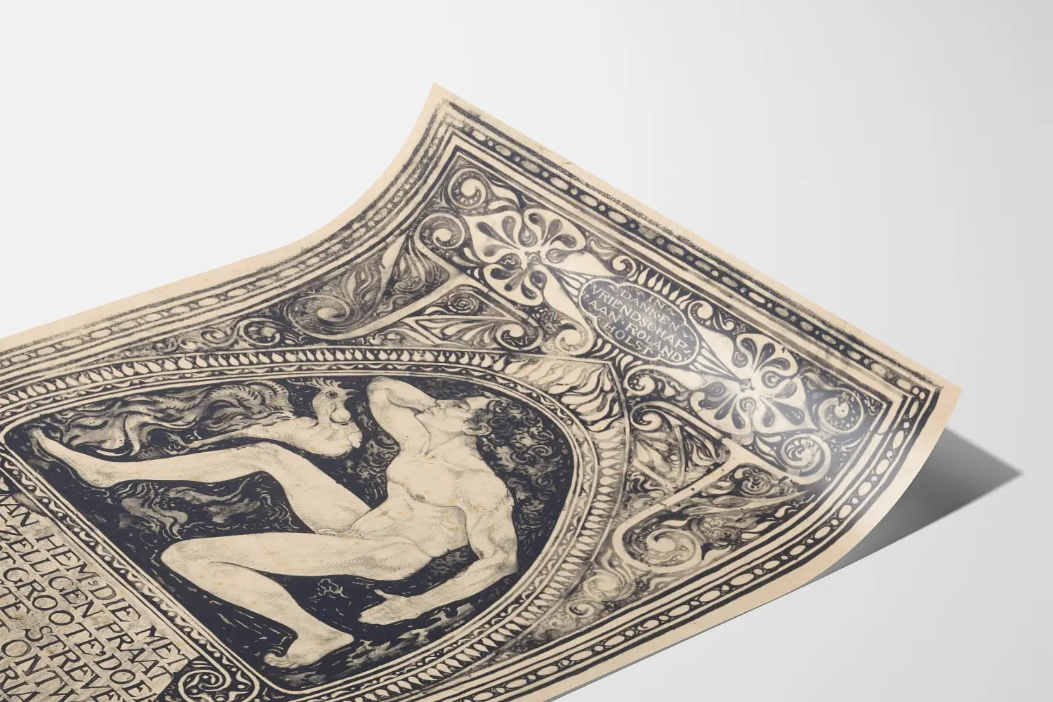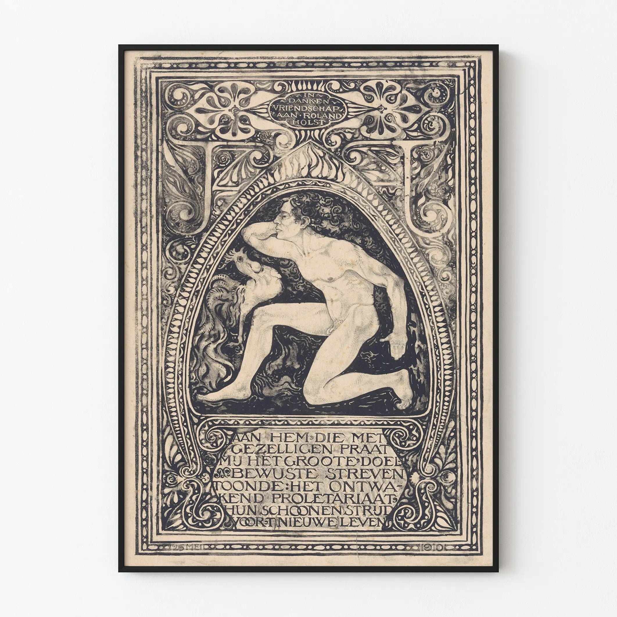 Dieses Vintage-Poster zeichnet sich durch seinen kunstvollen Stil mit reichen Details und Ornamenten aus und bietet eine einzigartige Wanddekoration. Das schwarz-weiße Design zeigt eine nackte männliche Figur, die kniend in einem ovalen Rahmen sitzt, der mit floralen Elementen und Voluten verziert ist und sowohl Kraft als auch Innenschau symbolisiert. Oben befindet sich eine niederländische Inschrift „IN DANK EN VRIENDSCHAP AAN ROLAND HOLST“, die darauf hinweist, dass es sich um eine Hommage oder Anerkennung an Roland Holst handelt, wahrscheinlich eine einflussreiche Persönlichkeit, die mit diesem Werk gewürdigt wird. Darunter folgt ein ausführlicher Text, der die Ehrung fortsetzt und den persönlichen sowie historischen Charakter dieses Stücks unterstreicht. Der kunstvoll gestaltete Rahmen um die Komposition erinnert an Jugendstil oder alte Radierungen und verleiht dem Werk eine dekorative und zeitlose Note. Dieses Poster ist ideal für Liebhaber klassischer Kunst und alter Illustrationen und passt gut zu einer eleganten Wanddekoration, die Räume, Büros oder kulturelle Orte aufwerten soll. Es lässt sich in eine Sammlung von Kunstpostern integrieren und bringt eine ästhetische Note, die auf meisterhafter Zeichnung und Gravur basiert, sowie eine erzählerische Dimension, die die Würdigung einer bedeutenden Persönlichkeit zum Ausdruck bringt.