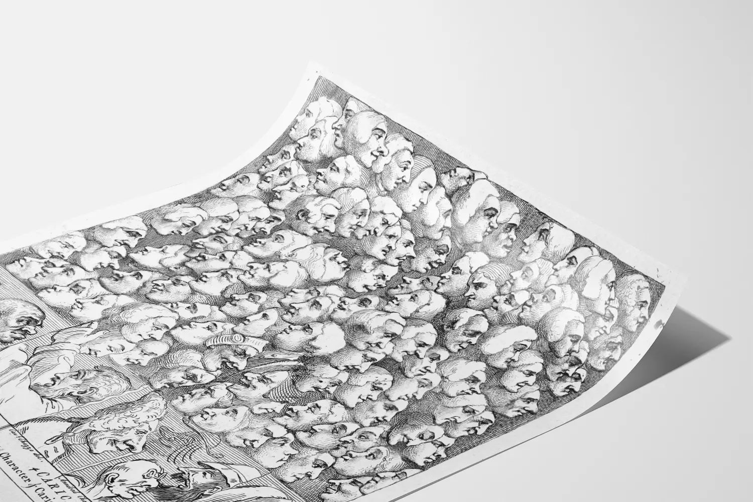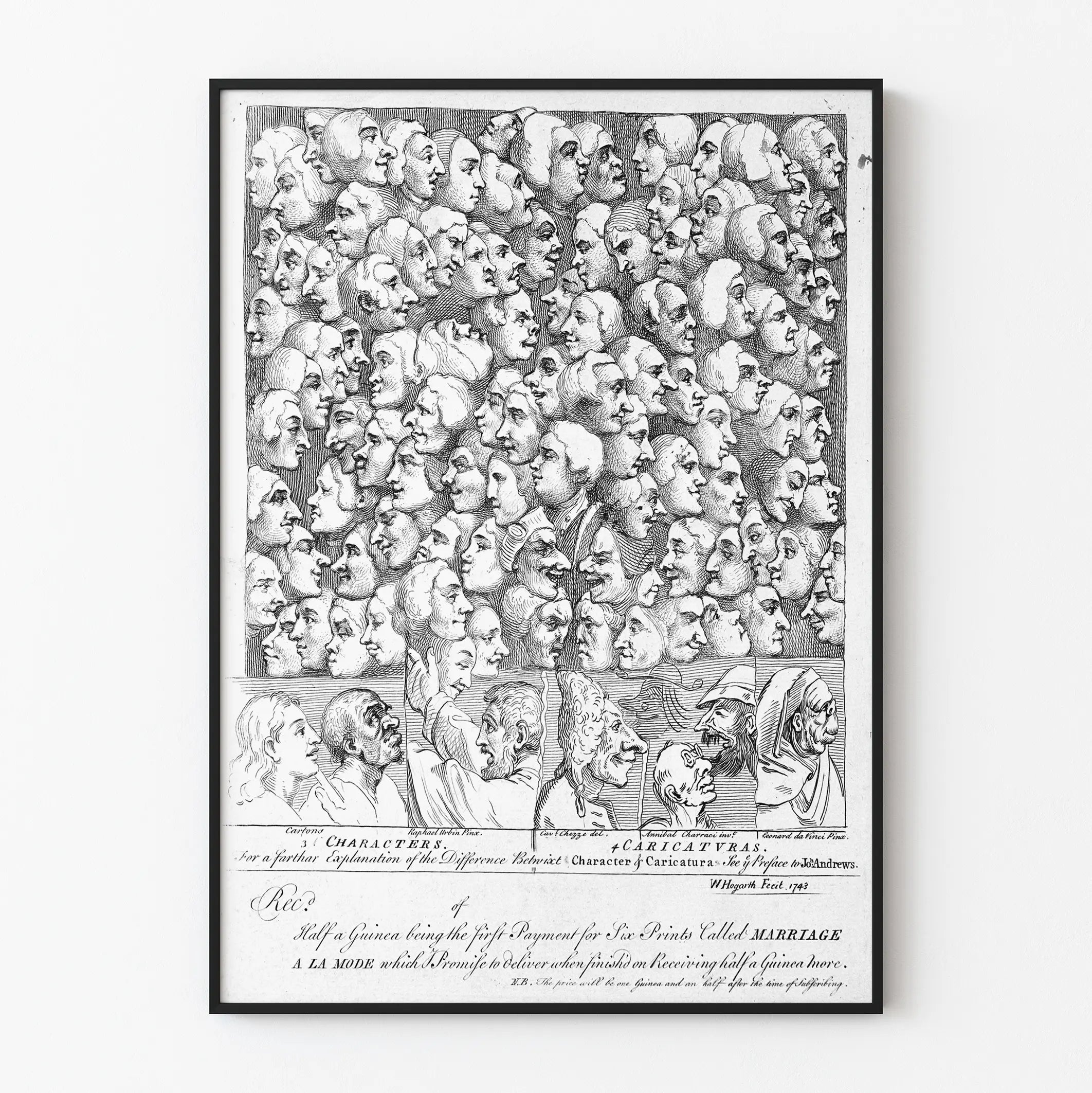 Dieses künstlerische Schwarz-Weiß-Poster zeigt eine reiche und detaillierte Komposition zahlreicher menschlicher Profilgesichter, gezeichnet im alten Stil, die Charaktere und Karikaturen miteinander verbinden. Jedes Gesicht, sorgfältig skizziert, stellt eine Vielzahl von Ausdrücken und Zügen dar und bietet eine faszinierende Studie der Physiognomie und der Kunst des klassischen Porträts. Dieses Plakat verbindet Tradition und Originalität und verleiht Ihrer Wanddekoration eine Note von Eleganz und Charakter. Perfekt für Liebhaber alter Kunst, Gravuren oder Vintage-Zeichnungen, ist dieses Poster ideal in einem Interieur mit Retro-Atmosphäre oder Kuriositätenkabinett. Sein Schwarz-Weiß-Format sorgt für eine harmonische und schlichte Integration in alle Einrichtungsstile, sei es im Wohnzimmer, Büro oder in einer Bibliothek. Als dekoratives Objekt präsentiert sich diese Illustration als eine grafische Tafel, die das Auge durch ihre Vielzahl an Details und die Vielfalt der dargestellten Profile anregt, welche unterschiedliche Emotionen und Persönlichkeiten widerspiegeln. Entscheiden Sie sich für diese außergewöhnliche Wanddekoration, die die Kunst des historischen Zeichnens wertschätzt und Ihren Raum mit einem originellen Werk voller historischer Charme bereichert.