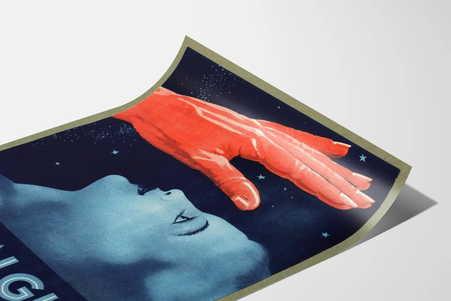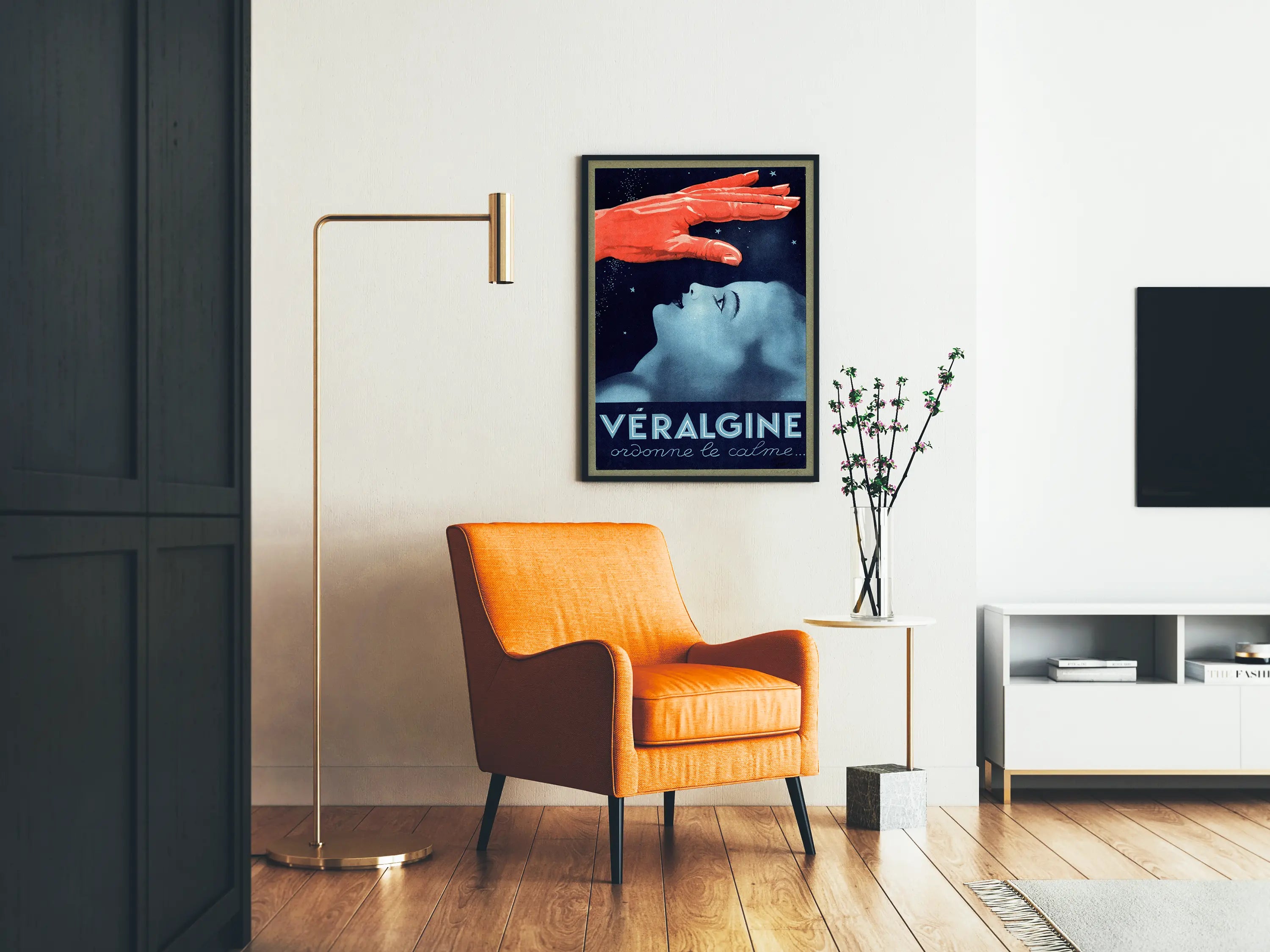 Dieses Vintage-Poster VÉRALGINE ist ein faszinierendes und ausdrucksstarkes Wanddekorationselement, das perfekt ist, um Ihrem Interieur eine künstlerische und nostalgische Note zu verleihen. Das Plakat zeigt ein weibliches Gesicht in Blautönen, seitlich liegend, den Blick auf eine imposante, leuchtend rote Hand gerichtet, die eine Aura der beruhigenden Ruhe zu vermitteln scheint, vor einem dunklen, sternenübersäten Hintergrund. Dieses visuelle Kunstwerk spielt mit Farbkontrasten und Komposition, um ein Gefühl von Gelassenheit und Schutz zu vermitteln. Der Text „VÉRALGINE verschreibt die Ruhe...“, der am unteren Rand des Posters steht, verstärkt diesen Eindruck der Entspannung und lädt zu einer Atmosphäre kontrollierter Ruhe ein. Dieses Retro-Poster, mit seinen dominanten Blau- und Rottönen, fügt sich perfekt in eine Wanddekoration ein, die Vintage und Moderne verbindet, und setzt einen gelungenen Blickfang in jedem Wohn- oder Arbeitsraum. Diese Art von Wandbild eignet sich besonders für Liebhaber origineller und visuell erzählender Dekorationen, ideal, um ein Wohnzimmer, Büro oder Schlafzimmer mit einem Hauch von Geheimnis und Eleganz zu schmücken. Es eignet sich auch für eine Sammlung von Retro-Postern, bei denen jedes Element eine einzigartige Geschichte erzählt. Mit der Wahl dieses Posters entscheiden Sie sich für eine Wanddekoration, die künstlerischen Stil und Emotion verbindet und die visuelle Identität Ihrer persönlichen Räume bereichert.
