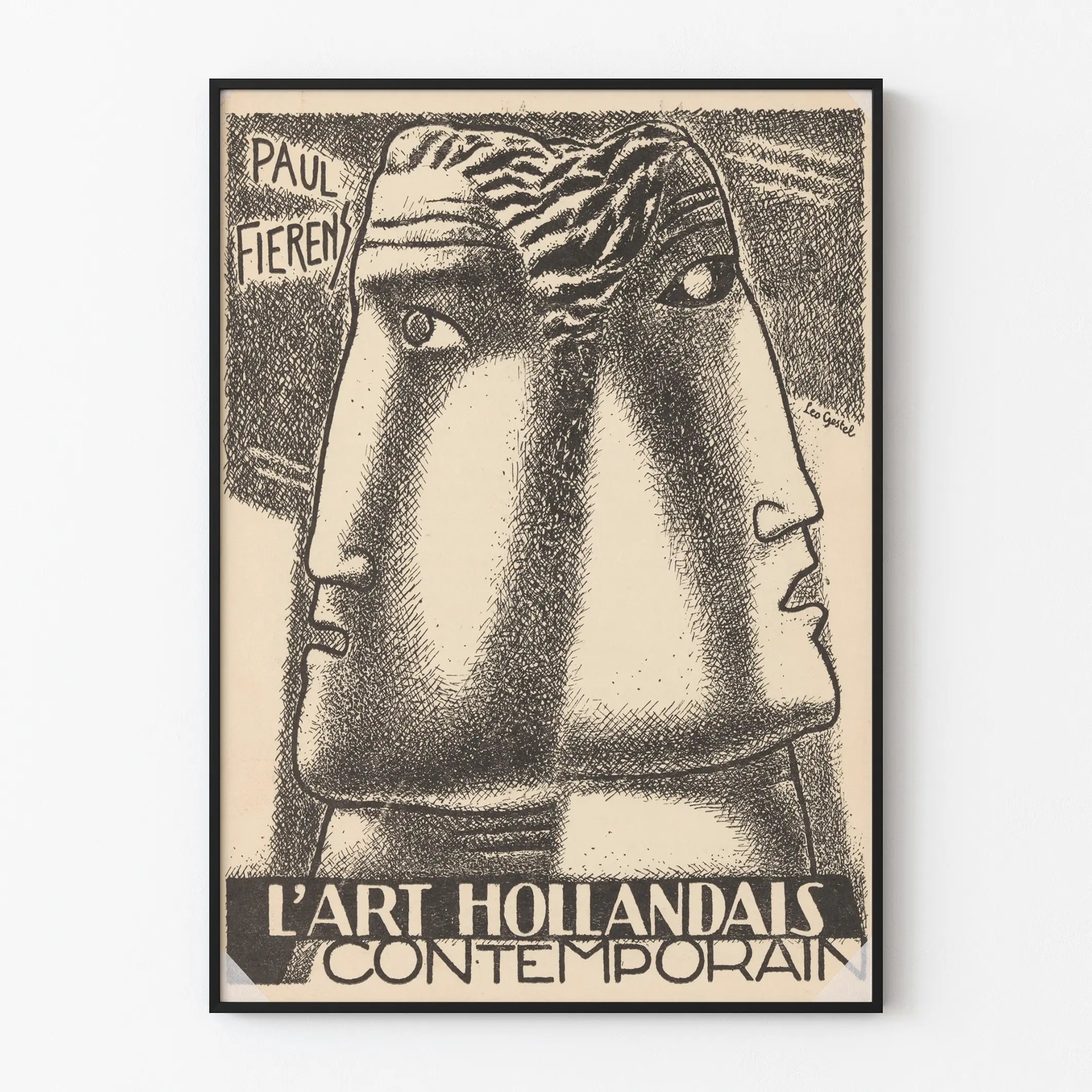 Entdecken Sie dieses einzigartige Plakat, das den Umschlag des Buches „L'Art Hollandais Contemporain“ von Paul Fierens zeigt, illustriert von Leo Gestel. Dieses schwarz-weiße Poster bietet eine beeindruckende grafische Komposition mit zwei stilisierten menschlichen Profilen, die verschmolzen und in sich verschlungenen Linien gezeichnet sind und Tiefe sowie Textur in das Bild bringen. Dieses Werk verbindet Modernismus und künstlerischen Ausdruck und eignet sich perfekt für eine zeitgenössische Wanddekoration, die elegant und charaktervoll ist.