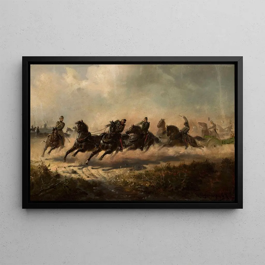 Charge d'Artillerie : ein Tribut an den militärischen Mut. Das Leinwandbild "Charge d'Artillerie" von Maksymilian Gierymski zeigt eine dynamische und beeindruckende Szene des Krieges, in der die Kraft und Entschlossenheit der Soldaten hervorgehoben werden. Die dunklen Farben und die markanten Kontraste schaffen eine Atmosphäre von Spannung und Dringlichkeit, während die Pferde und Kanonen unter dem Pinselstrich des Künstlers zum Leben erwachen. Gierymski gelingt es, die Bewegung und Energie dieser Attacke einzufangen und den Betrachter die Intensität der Aktion spüren zu lassen. Dieses Gemälde ist mehr als nur eine militärische Darstellung; es ruft den Mut und das Opfer der Menschen in Kriegszeiten in Erinnerung. Maksymilian Gierymski : ein Künstler im Herzen der historischen Kämpfe. Maksymilian Gierymski, polnischer Maler des 19. Jahrhunderts, ist bekannt für seine militärischen und historischen Werke. Vom Romantizismus beeinflusst, widmet er sich besonders den Themen Krieg und Mut. Seine Karriere ist geprägt von dem Wunsch, die bedeutenden Ereignisse seiner Zeit darzustellen, insbesondere die Kämpfe um die Unabhängigkeit Polens. "Charge d'Artillerie" ist ein beispielhaftes Werk seines Stils, in dem er Realismus und Dramatisierung verbindet, um die emotionale Wirkung der Schlachten zu vermitteln. Gierymski erinnert uns durch seine Werke an die Bedeutung des kollektiven Gedächtnisses und des Opfers. Eine dekorative Anschaffung mit vielfältigen Vorzügen. Die Kunstdruck-Reproduktion von "Charge d'Artillerie" ist ein dekoratives Stück, das in jedem Raum Aufmerksamkeit erregen wird, sei es im Büro, im Wohnzimmer oder im Spielzimmer. Ihre Druckqualität und Treue zum Originalwerk machen sie zur idealen Wahl für Kunst- und Geschichtsliebhaber. Dieses Gemälde verleiht Ihrer Dekoration Charakter und Tiefe und regt gleichzeitig zum Nachdenken über Mut und Entschlossenheit an. Mit dieser Leinwand bereichern Sie Ihr Interieur um ein Werk, das Geschichten von Mut und Heldentum erzählt, und fügen Ihrer Umgebung eine künstlerische Dimension hinzu.