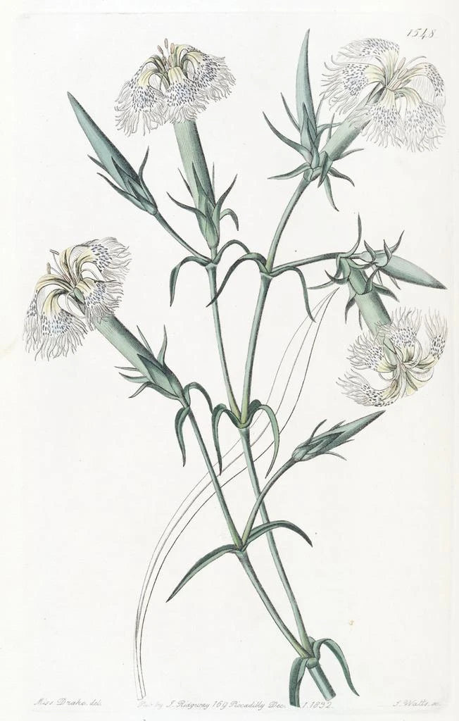 Sydenham Edwards, aktiv im frühen 19. Jahrhundert, ist bekannt für seine Beiträge zur botanischen Illustration. Ausgebildet in der Kunst der Gravur, verstand er es, wissenschaftliche Präzision mit künstlerischer Sensibilität zu verbinden. Seine Werke, oft veröffentlicht in botanischen Fachbüchern, spielten eine entscheidende Rolle bei der Dokumentation exotischer Pflanzen seiner Zeit. Der Libanon-Nelke ist ein perfektes Beispiel für seinen unverwechselbaren Stil, bei dem die natürliche Schönheit mit wissenschaftlicher Strenge hervorgehoben wird. Edwards wurde von den botanischen Entdeckungen seiner Zeit beeinflusst, was ihm ermöglichte, seltene Arten mit unvergleichlicher Genauigkeit zu erfassen.