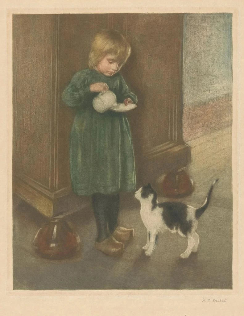 Mädchen, das eine Katze füttert - Heinrich M. Krabbé