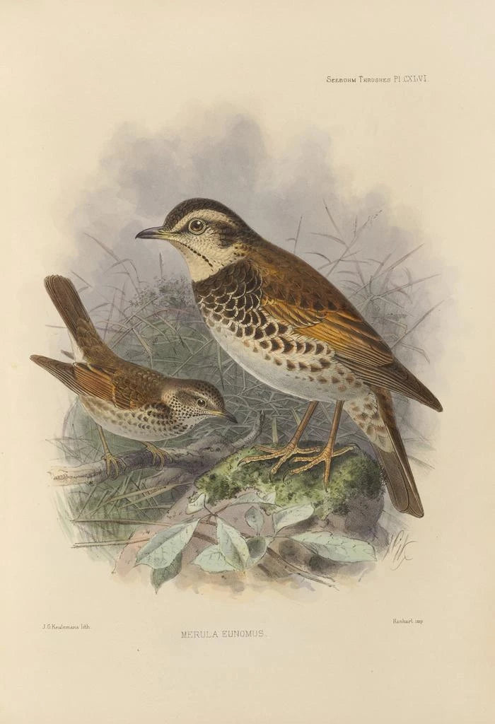 Henry Seebohm, Naturforscher und Ornithologe des 19. Jahrhunderts, vereinte seine Leidenschaft für Vögel mit seinem künstlerischen Talent. Seine Werke, zu denen auch Merula Eunomus gehört, zeugen von einer Epoche, in der die Beobachtung der Natur sowohl wissenschaftlich als auch ästhetisch war. Beeinflusst von den Entdeckungen seiner Zeit, trug Seebohm zur Dokumentation der Vogelarten bei, während er sie mit bemerkenswerter Präzision darstellte. Seine Arbeit ist wesentlich, um die Biodiversität seiner Zeit zu verstehen und die Bedeutung des Artenschutzes zu erkennen, was ihn zu einer unverzichtbaren Figur in der Welt der naturalistischen Kunst macht.