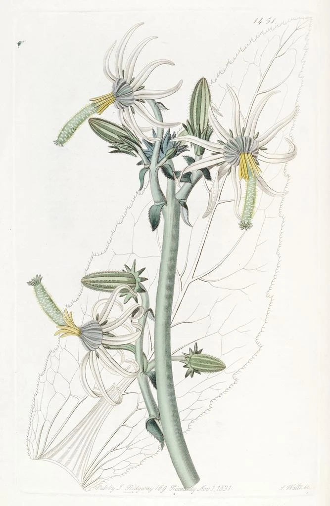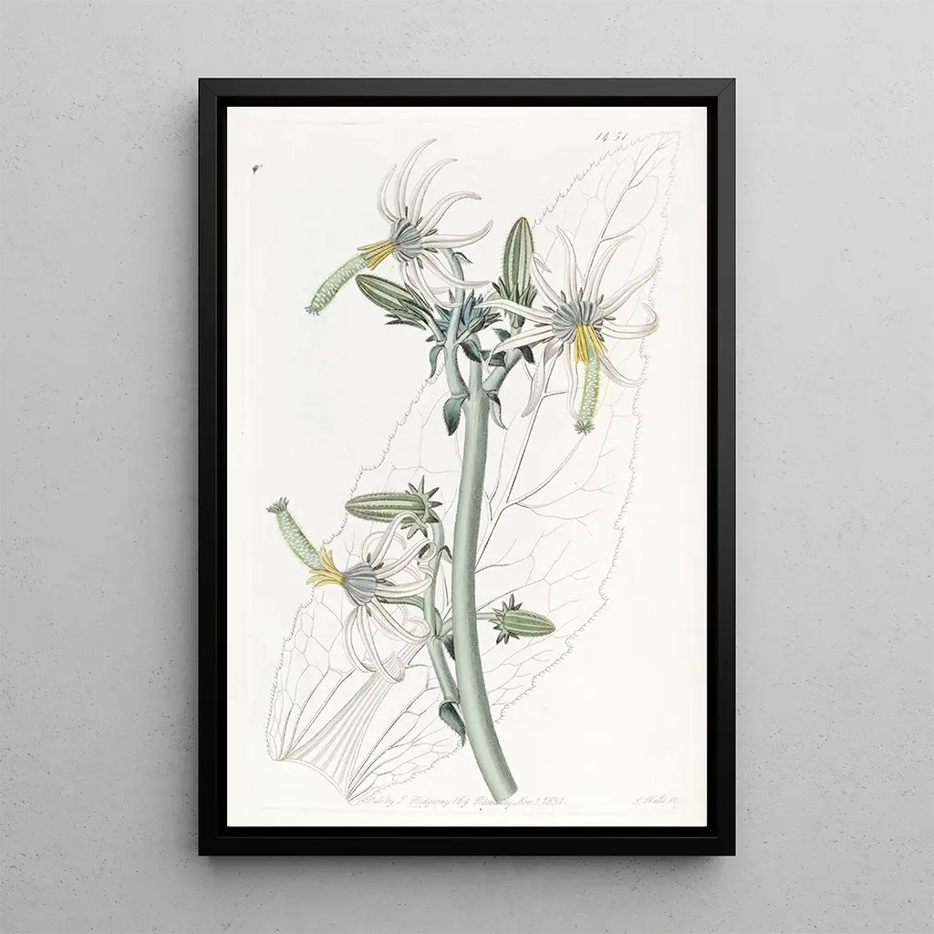 Michauxia lisse : eine Ode an die zarte Natur Die kunstdrucke von Michauxia lisse, ein Werk von Sydenham Edwards, entführen uns in eine botanische Welt voller Feinheit. Die Pastellfarben verschmelzen subtil miteinander und schaffen eine beruhigende, kontemplative Atmosphäre. Jedes Detail der Pflanze ist sorgfältig wiedergegeben, was auf eine aufmerksame Beobachtung und eine raffinierte Gravurtechnik hinweist. Das Licht spielt auf den Blättern, hebt ihre glatte Textur und ihre natürliche Eleganz hervor. Dieses Bild lädt zum Träumen ein, zu einer Flucht in einen geheimen Garten, in dem die Schönheit der Formen und Farbtöne in vollkommener Ruhe erblüht.