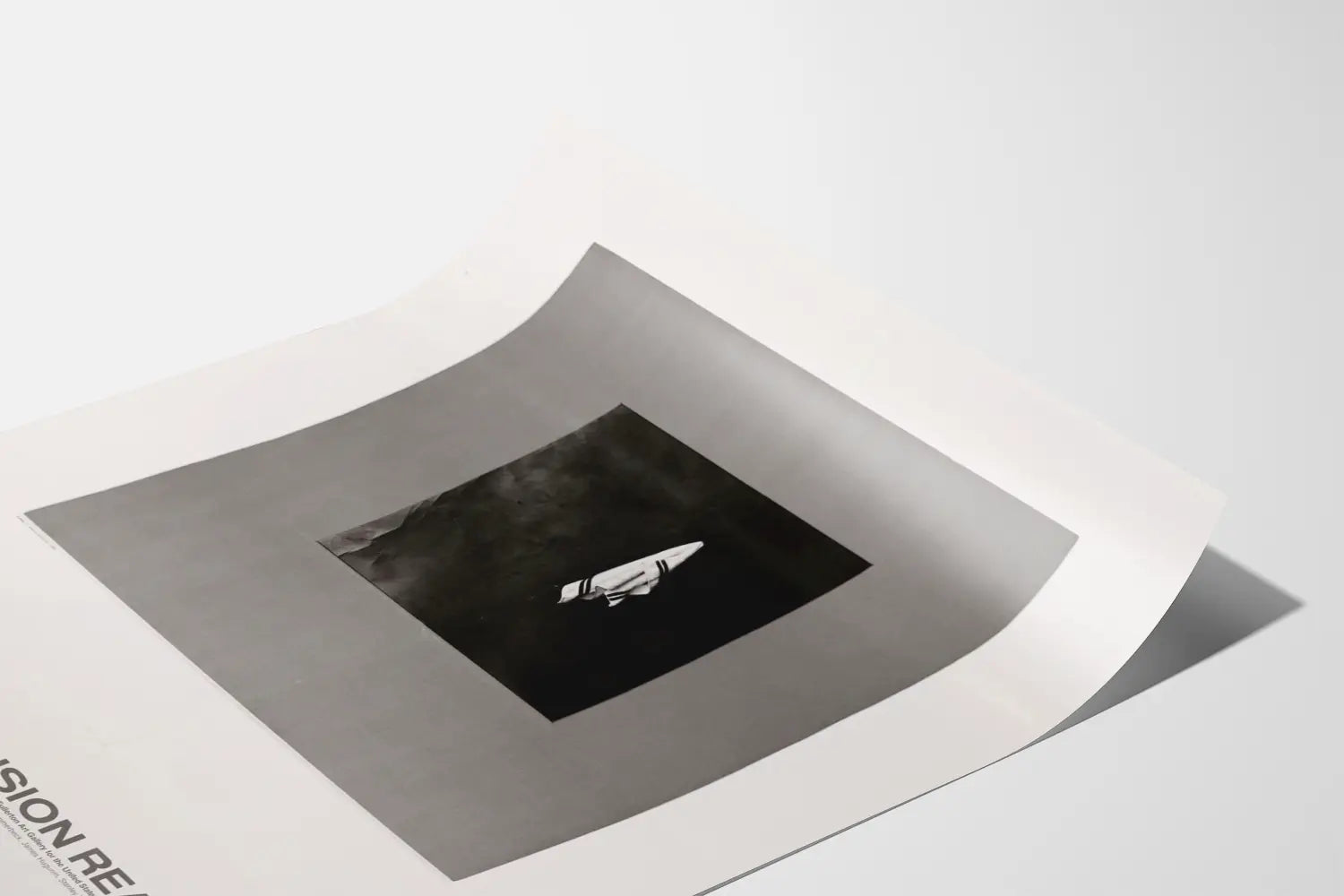 Perfekt für ein zeitgenössisches Interieur, ist dieses Plakat eine bemerkenswerte ästhetische Wahl, die Schlichtheit und Originalität vereint. Es passt sowohl in ein elegantes Wohnzimmer als auch in ein modernes Büro oder eine Kunstgalerie. Der graue Rahmen, der die Fotografie umgibt, schafft ein perfektes Gleichgewicht zwischen Licht und Schatten und verstärkt den visuellen Effekt des schwebenden Objekts. Dieses Wanddekorationselement vermittelt eine nachdenkliche und künstlerische Stimmung, die alle Blicke auf sich ziehen wird.