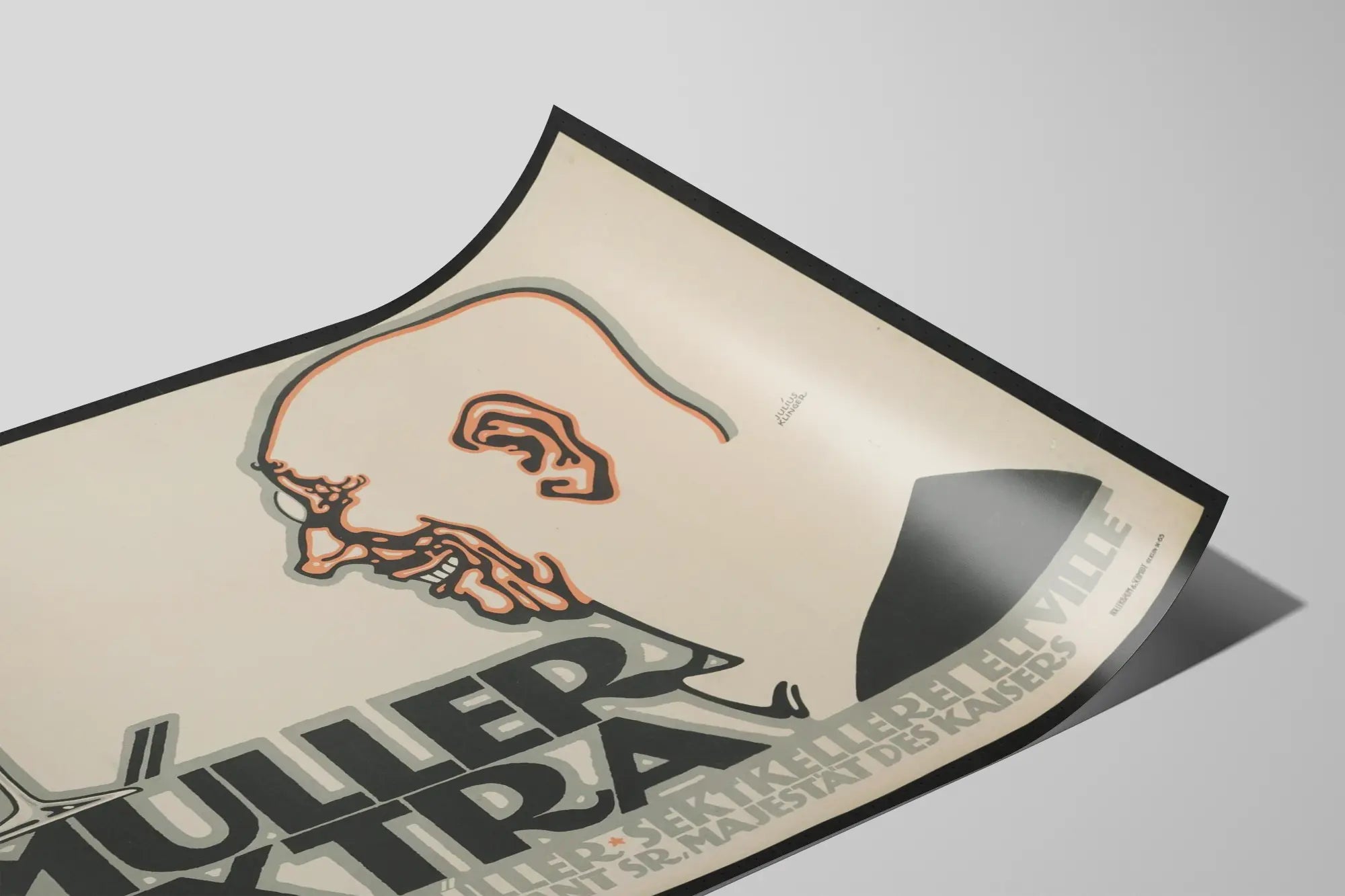 Cette affiche vintage Müller Extra est une pièce idéale pour enrichir votre décoration murale avec une touche d'authenticité et de charme rétro. Représentant un profil dessiné avec des lignes épurées et stylisées, cette affiche met en avant le nom "Müller Extra" en caractères gras et noirs, parfaitement intégrés dans un design minimaliste mais expressif. La coupe du personnage au visage souriant et dégagé de détails excessifs évoque une atmosphère à la fois élégante et conviviale, soulignée par la présence d'un verre de boisson pétillante, délicatement dessinée à gauche. Ce poster est caractéristique des affiches publicitaires anciennes, qui privilégient l'efficacité visuelle et l'impact graphique. La combinaison des couleurs sobres comme le noir, le gris et le beige, associée à des touches orange, donne à cette affiche un aspect chaleureux et intemporel. Idéale pour les amateurs de décoration murale vintage, cette affiche peut parfaitement s'insérer dans une ambiance de cuisine, salle à manger ou bar, apportant un accent décoratif nostalgique. Grâce à sa composition simple et néanmoins raffinée, cette affiche Müller Extra s'adapte aussi bien à une décoration moderne qu'à un intérieur au style industriel ou rétro, favorisant une ambiance élégante et décontractée. Son format horizontal offre une belle présence sur un mur, permettant de capter facilement l'attention tout en restant une œuvre graphique facile à associer avec d'autres éléments décoratifs. Apportez une touche vintage à votre intérieur avec cette affiche textile ou papier de qualité, parfaite pour tous ceux qui souhaitent une déco murale originale et pleine de charme. Que ce soit pour un espace privé ou un cadre professionnel, cette affiche ancienne Müller Extra donnera vie à vos murs avec un style grahpique unique qui mise sur l'expression et la simplicité. Une belle invitation à redécouvrir les charmes des affiches publicitaires d'autrefois dans un format idéal pour la décoration contemporaine.