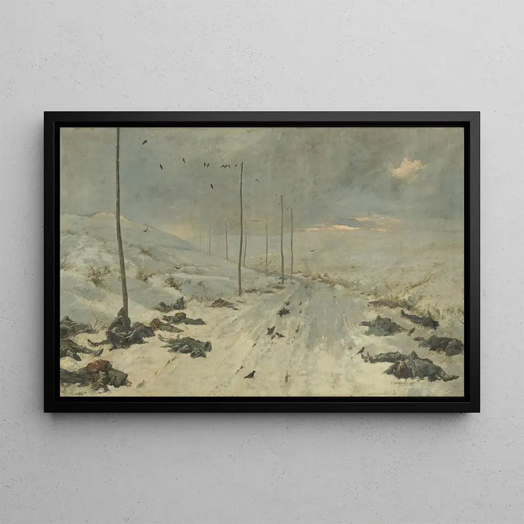 Après le Combat : eine eindrucksvolle Darstellung des Krieges Der kunstdruck "Après le Combat" bietet eine beeindruckende Sicht auf die Folgen des Krieges. Dieses Gemälde, geprägt von Realismus, zeigt erschöpfte Soldaten, die die Brutalität des Konflikts bezeugen. Die dunklen, erdigen Farben dominieren die Komposition und schaffen eine schwere, melancholische Atmosphäre. Die Technik von Vasily Vereshchagin, einem Meister des Realismus, zeigt sich in detaillierten Elementen, die die rohe Emotion der Figuren einfangen. Jedes Gesicht erzählt eine Geschichte, und jede Geste ruft das Leiden und die menschliche Resilienz hervor. Dieses Werk lädt uns ein, über die Verwüstungen des Krieges und seine Auswirkungen auf die Betroffenen nachzudenken. Vasily Vereshchagin: der engagierte Künstler des 19. Jahrhunderts Vasily Vereshchagin, russischer Maler des 19. Jahrhunderts, ist bekannt für sein Engagement für die realistische Darstellung militärischer Konflikte. Beeinflusst von seinen persönlichen Erfahrungen auf dem Schlachtfeld, suchte er, den Krieg nicht als Verherrlichung, sondern als menschliche Tragödie darzustellen. Seine Werke, oft mit einer starken emotionalen Ladung versehen, hatten einen bedeutenden Einfluss auf die Wahrnehmung des Krieges zu seiner Zeit. "Après le Combat" reiht sich in diese Linie ein und bietet eine kraftvolle Kritik an der Gewalt und ihren Folgen, während es Vereshchagins Platz in der Kunstgeschichte bestätigt. Eine dekorative Anschaffung mit vielfältigen Vorzügen Dieser kunstdruck des Gemäldes "Après le Combat" stellt eine eindrucksvolle Ergänzung Ihrer Inneneinrichtung dar. Ob im Wohnzimmer, Büro oder Schlafzimmer – dieses Werk zieht den Blick auf sich und regt zum Nachdenken an. Die Druckqualität sorgt für eine bemerkenswerte Treue zu den Nuancen und Details des Originalwerks und verleiht Ihrem Raum emotionale Tiefe. Durch die Integration dieses Leinwandbildes in Ihre Dekoration verschönern Sie nicht nur Ihr Zuhause, sondern laden auch zu Gesprächen über Kunst, Geschichte und Menschlichkeit ein, was diesen kunstdruck zu einer sowohl ästhetischen als auch bedeutungsvollen Wahl macht.