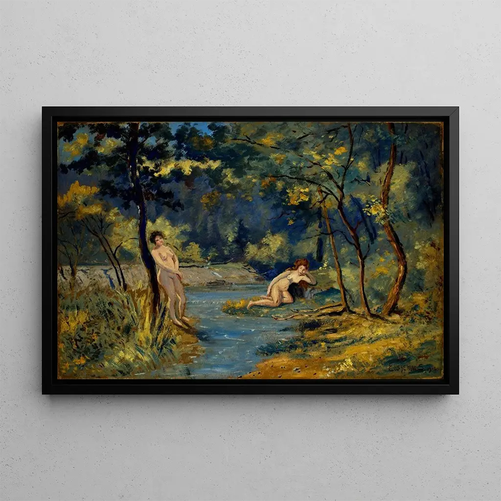 Nymphen stehend und liegend: eine Feier der weiblichen Schönheit. Die kunstdruck von Nymphen stehend und liegend von Louis Michel Eilshemius evoziert eine zarte Sinnlichkeit und eine Harmonie zwischen dem menschlichen Körper und der Natur. Die weiblichen Figuren, zugleich anmutig und geheimnisvoll, scheinen aus einem Traum zu entspringen, umhüllt von fließenden Drapierungen, die ihre Eleganz unterstreichen. Die Pastellfarben und das Spiel mit Licht verstärken die Sanftheit der Szene und schaffen eine traumhafte Atmosphäre. Die Technik des Künstlers, die Impressionismus und Symbolismus verbindet, lädt zu einer introspektiven Betrachtung ein, bei der jeder Blick eine neue Facette von Schönheit und Weiblichkeit offenbart. Louis Michel Eilshemius: ein Künstler an der Weggabelung. Louis Michel Eilshemius, amerikanischer Maler des frühen 20. Jahrhunderts, wird oft mit dem symbolistischen Bewegung und dem Impressionismus in Verbindung gebracht. Seine Karriere, die weniger bekannt ist als die seiner Zeitgenossen, ist geprägt von einer mutigen Erforschung der Themen Schönheit und Flucht. Beeinflusst von europäischen Strömungen, entwickelt Eilshemius einen einzigartigen Stil, gekennzeichnet durch lyrische Kompositionen und eine zarte Farbpalette. Seine Werke, häufig mit weiblichen Figuren bevölkert, spiegeln eine Suche nach dem Ideal und eine Faszination für das Geheimnis des Lebens wider. Der Künstler gelingt es, flüchtige Momente einzufangen und den Betrachter in eine Welt des Traums und der Kontemplation einzutauchen. Eine dekorative Anschaffung mit vielfältigen Vorzügen. Der kunstdruck von Nymphen stehend und liegend ist eine wertvolle Ergänzung für jede Kunstsammlung. Ob im Wohnzimmer, Schlafzimmer oder Arbeitsbereich, dieses Leinwandbild bringt einen Hauch von Raffinesse und Gelassenheit. Die Druckqualität sorgt für eine bemerkenswerte Treue zu den Nuancen und Details des Originalwerks, sodass man seine Schönheit voll genießen kann. Seine ästhetische Anziehungskraft liegt in seiner Fähigkeit, einen Raum zu verwandeln und eine beruhigende sowie inspirierende Atmosphäre zu schaffen. Mit der Wahl dieses kunstdrucks entscheiden Sie sich für eine elegante und zeitlose Dekoration, die alle Blicke auf sich ziehen wird.