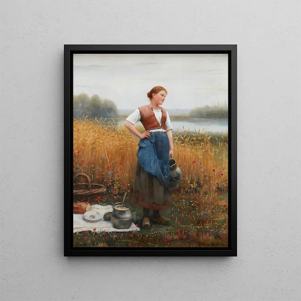 Reproduktion Pause de midi - Daniel Ridgway Knight – Einführung fesselnd In der bezaubernden Welt der Kunst gelingt es einigen Werken, die Zeit und den Raum zu transzendieren, Momente des Lebens einzufangen, die von Schönheit und Gelassenheit geprägt sind. "Pause de midi - Daniel Ridgway Knight" ist eines dieser Werke, die eine friedliche Atmosphäre hervorrufen und den Betrachter einladen, in ein lebendiges Gemälde einzutauchen. Dieses Werk, das weibliche Figuren zeigt, die eine Ruhepause inmitten einer grünen Landschaft genießen, verkörpert die Harmonie zwischen Mensch und Natur. Durch diesen Kunstdruck spürt man eine Einladung zur Kontemplation, den Wunsch, den Turbulenzen des Alltags zu entfliehen und in eine Welt einzutauchen, in der die Zeit stillzustehen scheint. Stil und Einzigartigkeit des Werks Der Stil von Daniel Ridgway Knight zeichnet sich durch eine außergewöhnliche Beherrschung von Licht und Farben aus. In "Pause de midi" verschmelzen die zarten Nuancen von Grün und Blau mit einer Subtilität, die der Szene eine fast traumhafte Atmosphäre verleiht. Die Figuren, in leichten Kleidern gekleidet, sind in natürlichen und entspannten Posen dargestellt, was einen Moment der Geselligkeit und des Teilens widerspiegelt. Die Komposition ist sorgfältig ausbalanciert, jedes Element des Gemäldes trägt zur allgemeinen Harmonie bei. Die feinen Details, wie die Spiel von Schatten und Licht auf den Gesichtern und Kleidern der Figuren, zeugen von einer minutiösen Aufmerksamkeit für die Darstellung des Alltagslebens. Dieses Werk beschränkt sich nicht nur auf die Darstellung einer Szene, sondern erzählt eine Geschichte – den Moment des Anhaltens, eine wohlverdiente Pause. Der Künstler und sein Einfluss Daniel Ridgway Knight, eine ikonische Figur der impressionistischen Bewegung, prägte seine Epoche durch seinen einzigartigen Ansatz in der Genre-Malerei. Geboren 1839, wurde er von den großen Meistern der französischen Malerei beeinflusst, integrierte aber auch seine eigene amerikanische Sensibilität. Seine Arbeiten konzentrieren sich häufig auf ländliche Themen und heben die Schönheit einfacher und authentischer Szenen hervor. Knight konnte die Essenz der Natur und der menschlichen Beziehungen durch seine Werke einfangen, und "Pause de midi" ist ein perfektes Beispiel dafür. Sein Einfluss besteht bis heute fort und inspiriert zahlreiche zeitgenössische Künstler, die versuchen, Emotionen durch die Darstellung zu vermitteln.