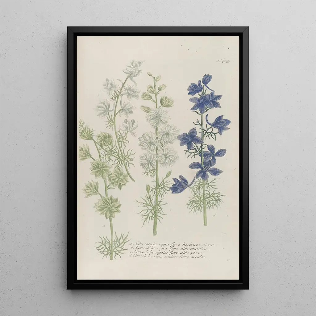 Die reproduction von Phytanthoza iconographia Pl132 entführt uns in eine faszinierende botanische Welt, in der jedes Detail sorgfältig hervorgehoben wird. Die lebendigen Farben und zarten Nuancen der dargestellten Pflanzen wecken Assoziationen an eine üppige und vielfältige Natur. Die von Johann Wilhelm Weinmann verwendete Gravurtechnik ermöglicht es, die Textur der Blätter und die Feinheit der Blumen einzufangen und schafft so eine fast greifbare Atmosphäre. Dieses Gemälde, eine wahre Ode an die Flora, lädt zur Betrachtung und zum Staunen über die Schönheit der natürlichen Welt ein.