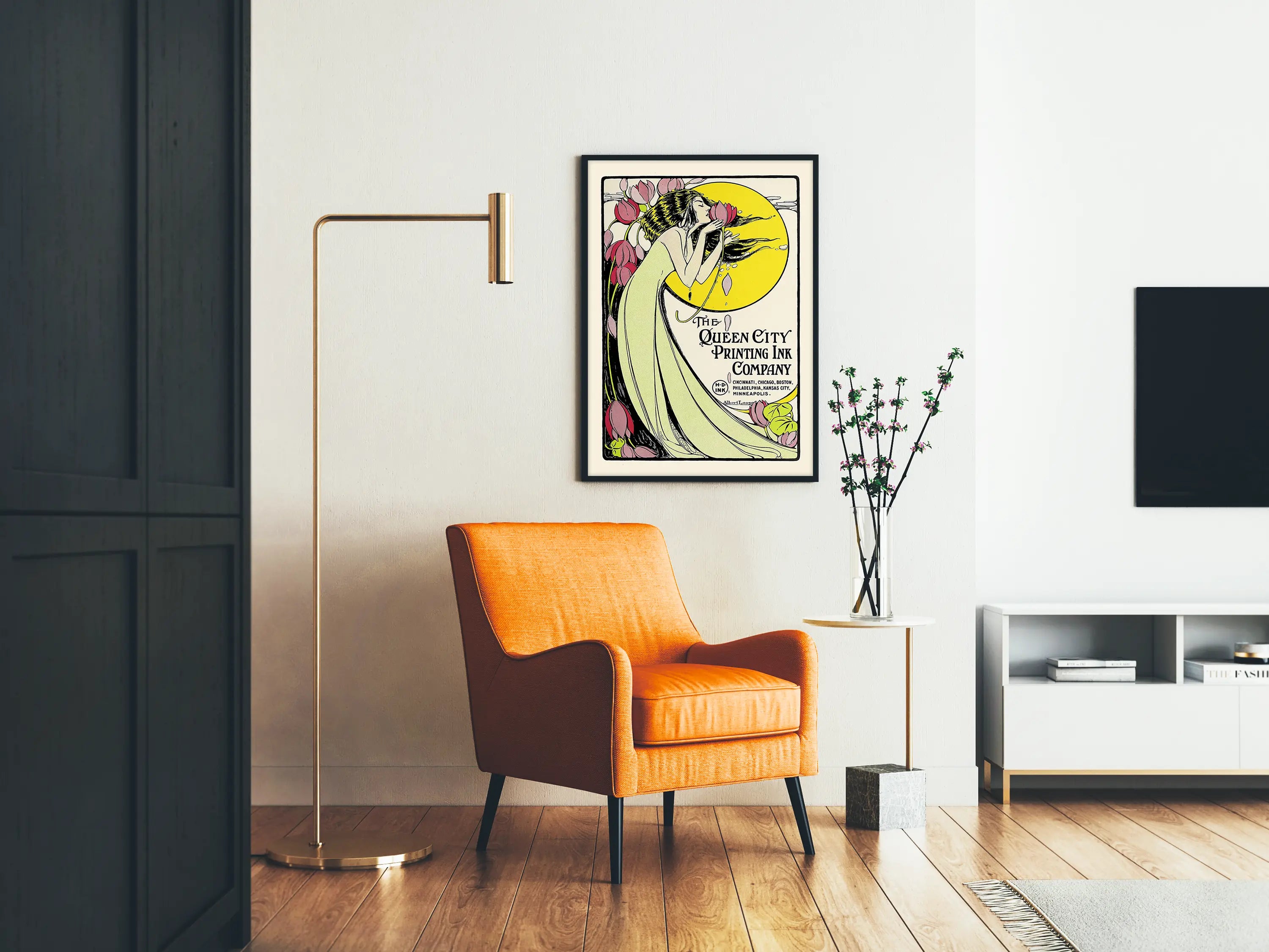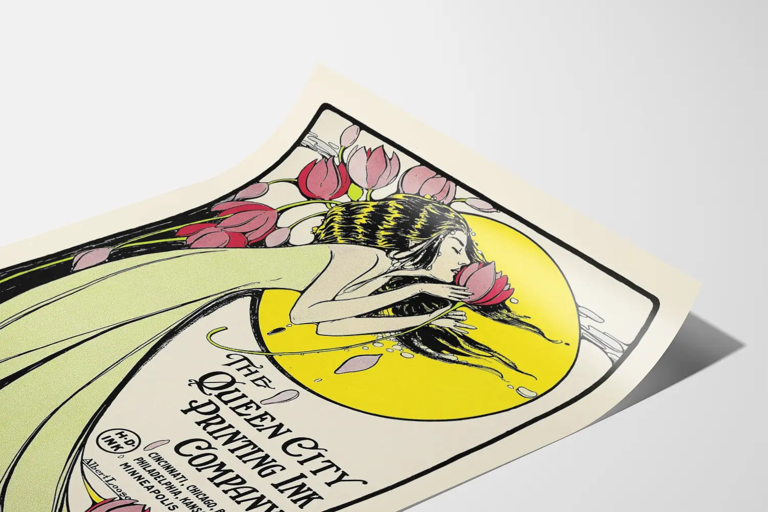 Entdecken Sie dieses wunderschöne Plakat im Jugendstil, das eine elegante Frau in fließendem Kleid zeigt, die sich nähert, um eine rosa Blume zu erschnuppern. Dieses Vintage-Poster hebt die The Queen City Printing Ink Company hervor, mit stilisiertem Schriftzug und Städtenamen wie Cincinnati, Chicago, Boston, Philadelphia, Kansas City und Minneapolis. Das Design besticht durch seine harmonischen Kurven, sanfte Farben, dominiert von Gelb, Rosa und Grün, sowie eine ausgewogene Komposition, die einen großen gelben Kreis im Hintergrund betont. Diese Wanddekoration verleiht Ihrem Zuhause einen Hauch von retro- und raffiniertem Stil. Ideal als Poster für Wohnzimmer, Büro oder kreativen Raum, ruft dieses alte Plakat den Charme und die Zartheit des frühen 20. Jahrhunderts hervor. Der grafische Stil hebt die künstlerische Arbeit und die Präzision der Linien hervor, typische Merkmale des Jugendstils. Perfekt für Liebhaber vintage-inspirierter Wandgestaltung, ist dieses Druckbild eine ausgezeichnete Wahl, um eine Wand künstlerisch und historisch zu personalisieren. Verleihen Sie Ihren Wänden dieses einzigartige Werk, das Kunst und kommerzielles Design vergangener Zeiten verbindet und so eine warme, stilvolle Atmosphäre in Ihrem Wohnraum schafft.