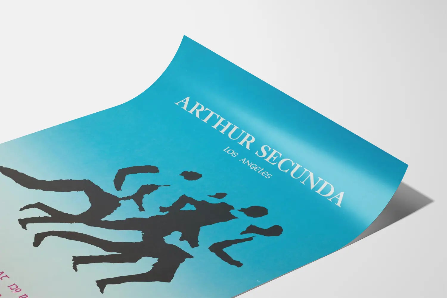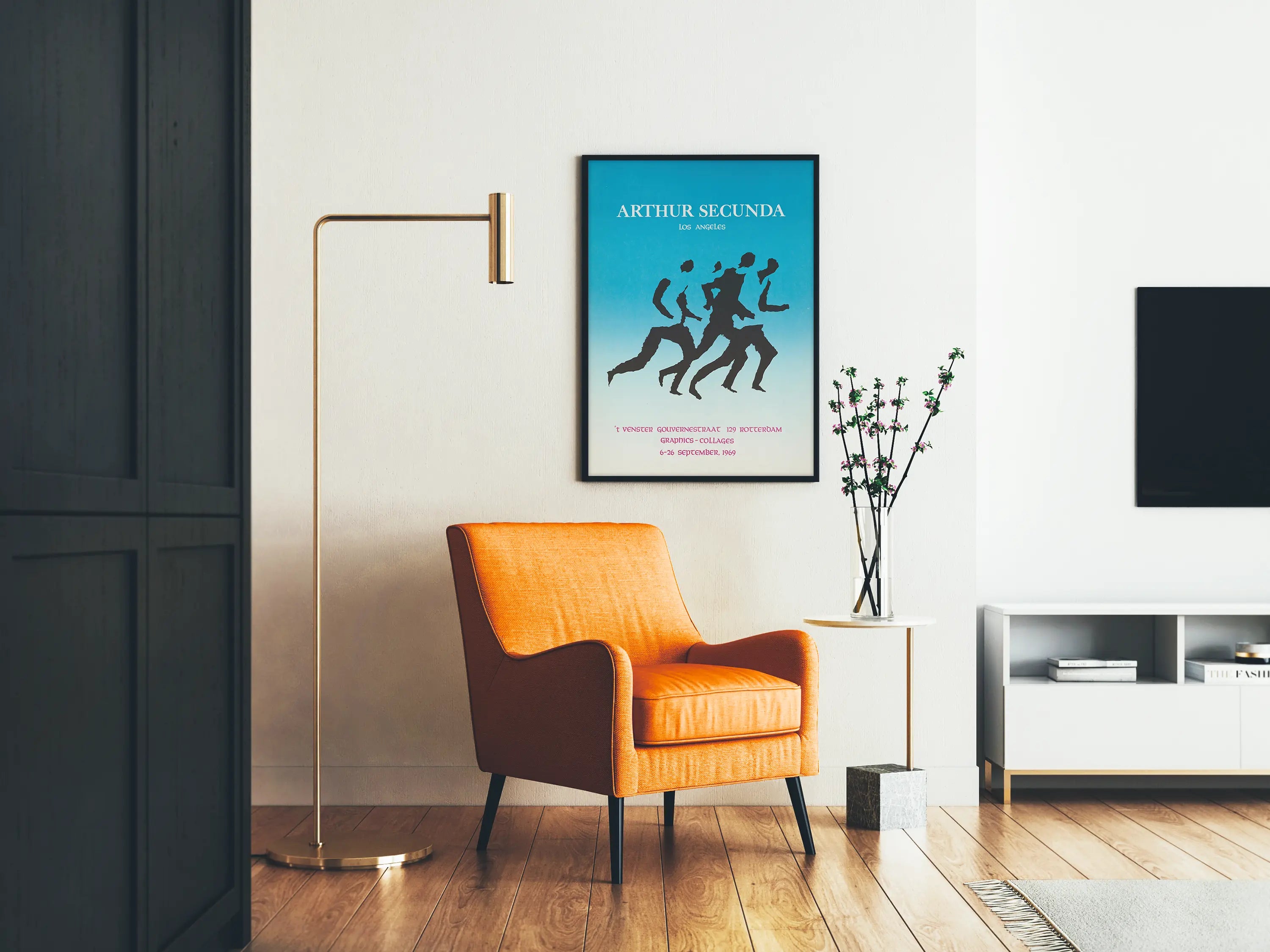 Dieses Vintage-Poster von Arthur Secunda mit dem Titel "Los Angeles" bietet eine kraftvolle und dynamische Wanddekoration, ideal für Liebhaber grafischer Kunst und Retro-Designs. Das Werk zeigt eine Szene mit stilisierten schwarzen Läufer-Silhouetten, die wunderschön im Kontrast zu einem Farbverlauf stehen, der oben in lebhaftem Blau beginnt und nach unten fast weiß wird. Dieses Poster verbindet einen klaren, minimalistischen Stil mit einer ausdrucksstarken Energie, die Bewegung und Fließfähigkeit durch einfache, kraftvolle Formen einfängt. Am oberen Rand des Posters ist der Name "Arthur Secunda" elegant in weißen Buchstaben geschrieben, gefolgt vom Titel "Los Angeles", was diesem Stück eine Note von Authentizität und Raffinesse verleiht. Der untere Bereich zeigt in rosa Schrift eine Erwähnung der Ausstellung in Rotterdam, mit den Daten der künstlerischen Veranstaltung. Dieses Poster ist ein wunderschönes Element der Wanddekoration, das jedem Raum Charakter verleiht, egal ob modern oder klassisch. Es kann in einem Wohnzimmer, Büro oder einer Galerie hervorgehoben werden und bietet einen grafischen sowie zeitlosen Blickfang. Mit der Wahl dieses Posters für Ihre Dekoration bringen Sie eine künstlerische Note ein, die auf Grafik und der Schlichtheit der Formen basiert, was zu Interpretation und Betrachtung einlädt. Dieses Dekorationsobjekt ist perfekt, um eine weiße oder bunte Wand zu bereichern und sich harmonisch in ein Ensemble aus Postern oder Gemälden einzufügen. Sein Vintage-Stil und seine klare Ästhetik entsprechen den aktuellen Trends im Innendesign, die Kunst und Funktionalität verbinden. Ideal für Liebhaber kühler Farben, lädt dieses Poster auch zu einer visuellen Balance ein, durch die Kombination von Schwarz und Blau. Es spiegelt auch die Welt des Sports und der Bewegung wider, was eine lebendige und dynamische Dekoration inspirieren kann. Dieses Poster ist eine ideale Wahl für diejenigen, die ein einzigartiges Stück aufhängen möchten, das grafische Schlichtheit mit erzählerischer Kraft verbindet.