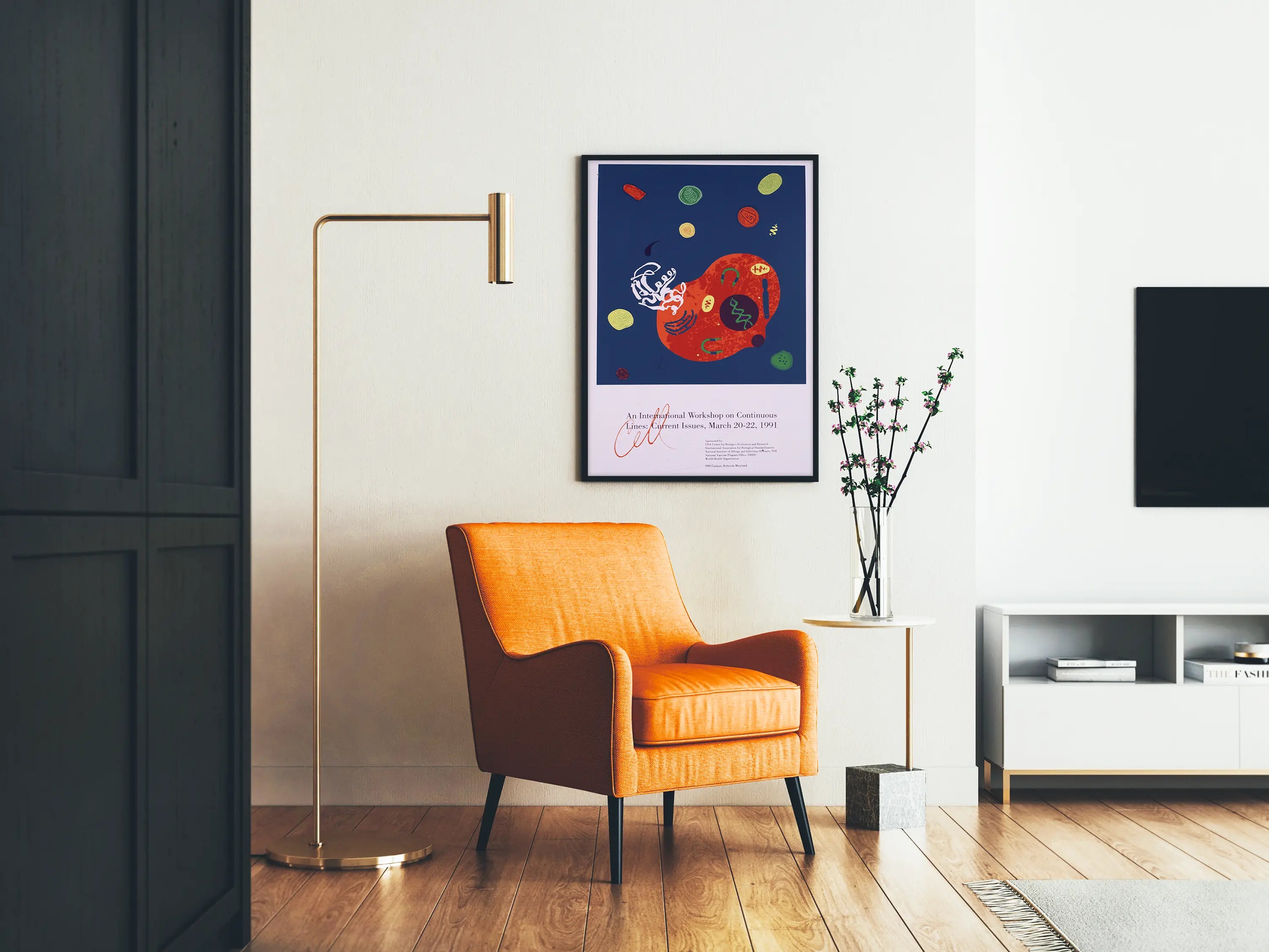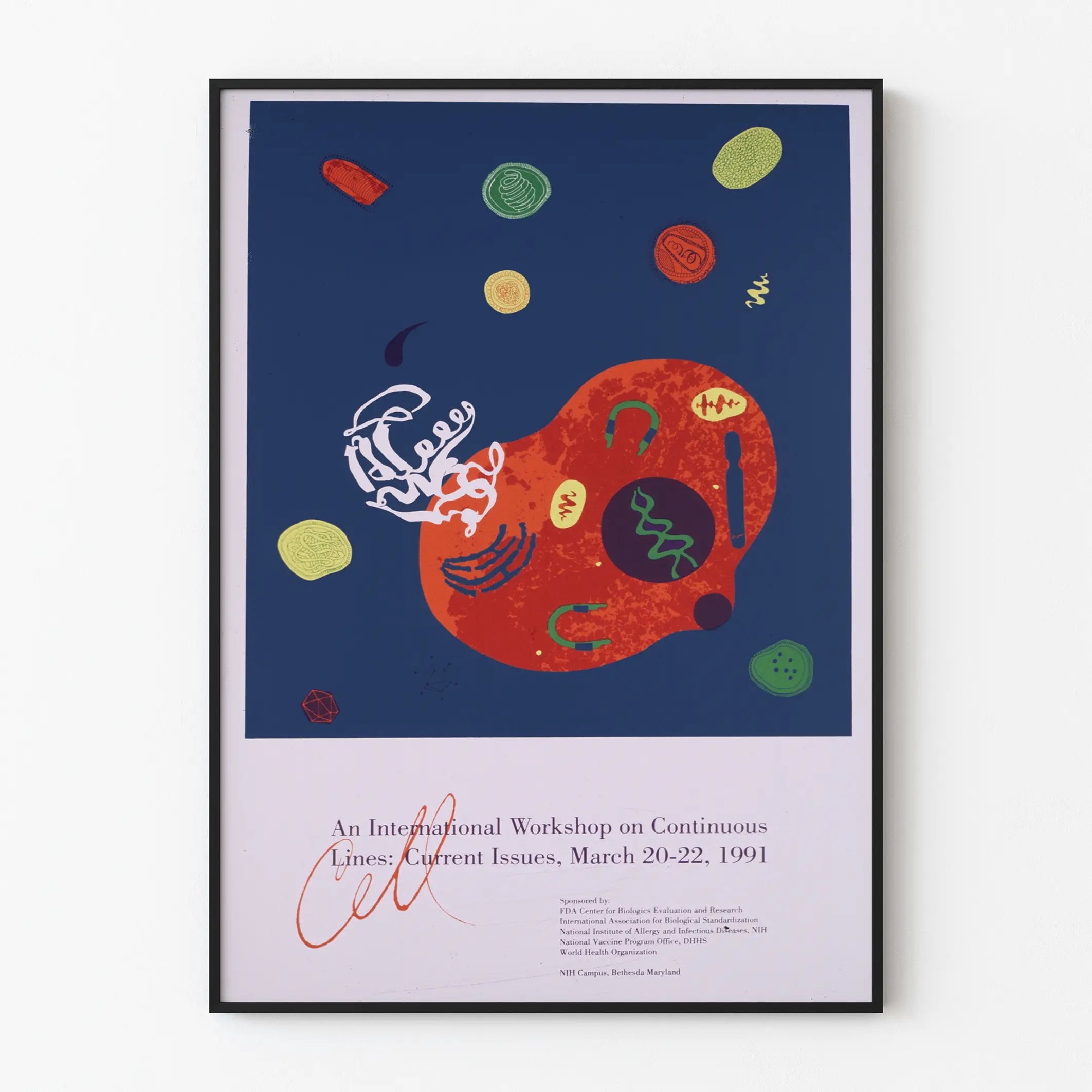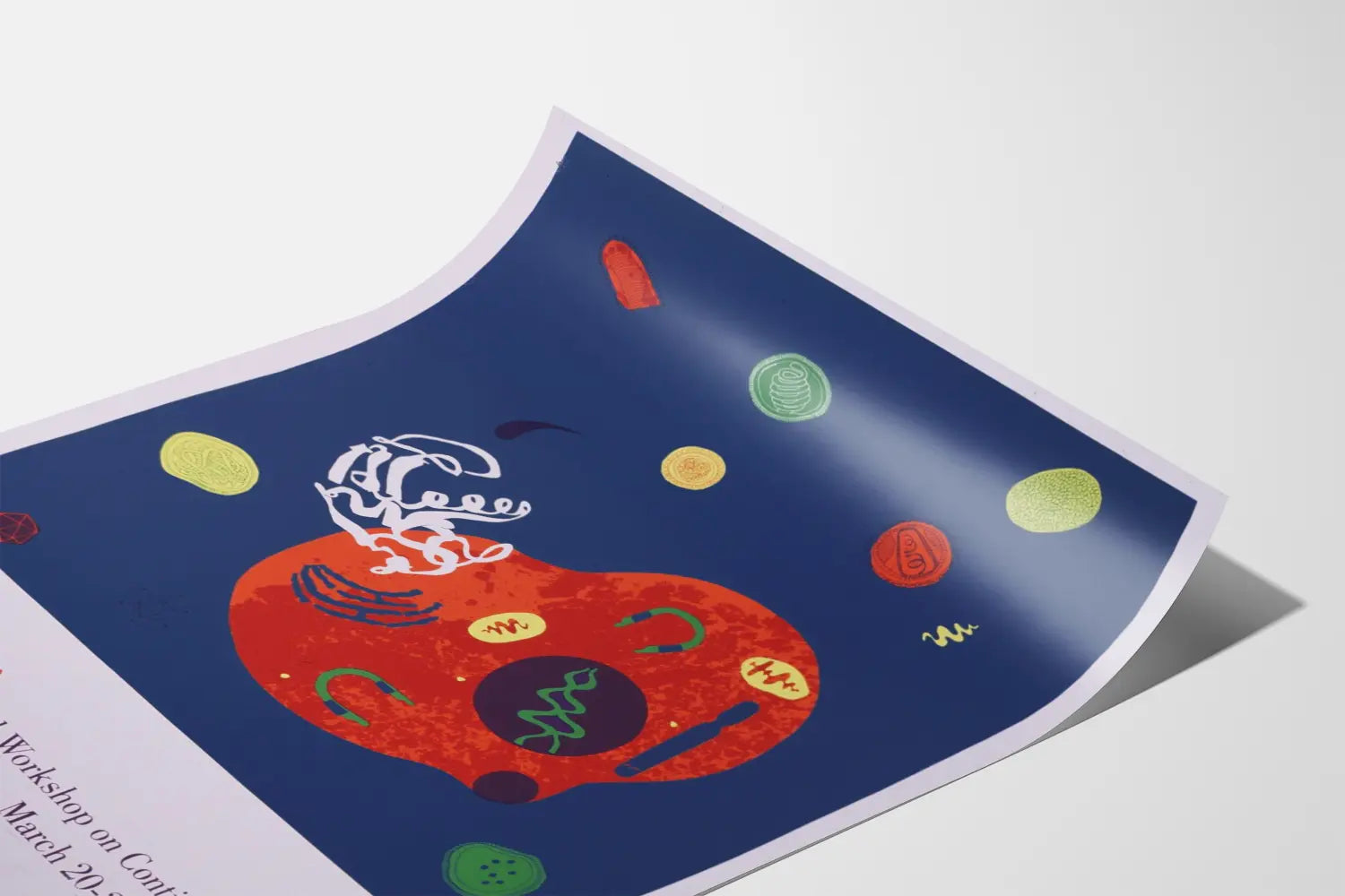 Dieses einzigartige Kunstposter zeigt eine abstrakte Komposition, inspiriert von der wissenschaftlichen Welt, mit Fokus auf die Idee der durchgehenden Linien. Die Wanddekoration wird von einer texturierten, roten, organischen Form dominiert, die auf einem tiefblauen Hintergrund zu schweben scheint, begleitet von sekundären Formen in Gelb, Grün und Orange, die Zellen oder mikroskopische Strukturen andeuten. Weiß schimmernde, wirbelnde Linien und stilisierte grafische Elemente bereichern das Gesamtbild, verleihen ihm visuelle Dynamik und ein Gefühl ständiger Bewegung. Dieses Poster ist eine wahre Einladung zur Reflexion über Formen und Flüsse, ideal für eine zeitgenössische Wandgestaltung mit einem originellen und wissenschaftlichen Akzent. Der im unteren Bereich gedruckte Text erwähnt ein internationales Seminar über durchgehende Linien aus dem März 1991, was dem Bild einen historischen und thematischen Mehrwert verleiht. Dieses Poster passt perfekt in einen Arbeitsraum, ein Büro oder eine Bibliothek und bringt Farbe sowie Material durch seine reiche und kontrastreiche Farbpalette. Durch die Verbindung von Abstraktion und Wissenschaft richtet sich dieses dekorative Bild an alle Liebhaber komplexer Grafiken und an Designbegeisterte, die Kunst und wissenschaftliche Konzepte verbinden. Dieses Wandbild in Ihr Zuhause zu integrieren bedeutet, ein Stück zu wählen, das sowohl ästhetisch ansprechend als auch anregend ist und eine leere Wand in einen faszinierenden Blickfang verwandelt. Entscheiden Sie sich für diese originelle und stilvolle Wanddekoration, um eine moderne und gelehrte Atmosphäre in Ihren Raum zu bringen.