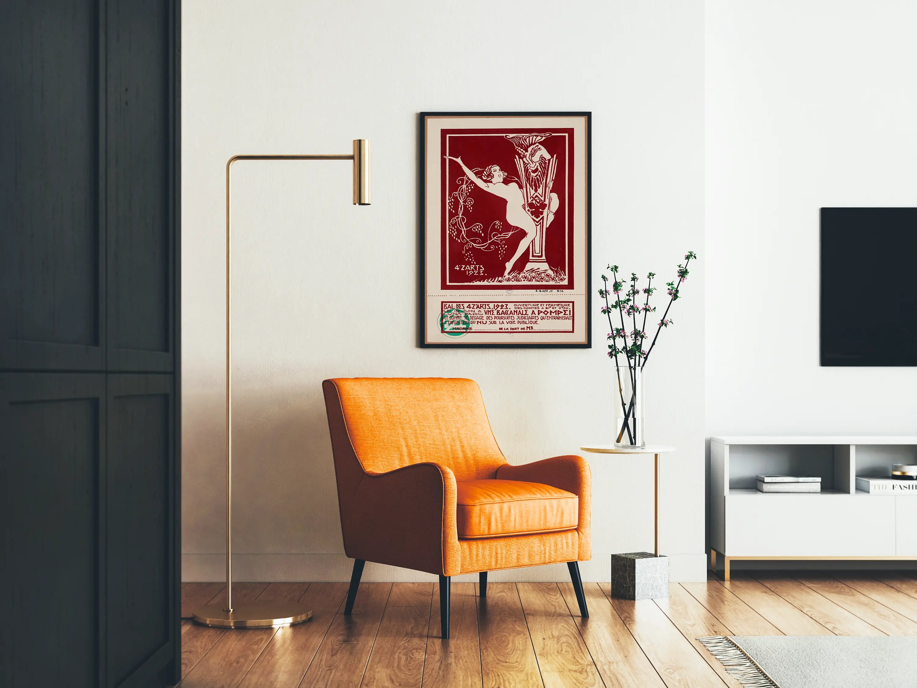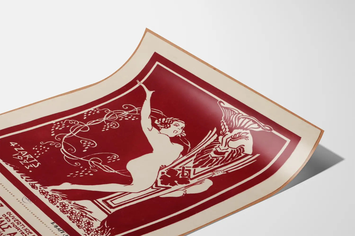 Dieses Vintage-Poster von 1923 zeigt den Ball der 4 Z'Künste, ein künstlerisches Ereignis mit dem Thema „Bacchanale in Pompeji“, das im Luna Park stattfand. Dieses originelle Stück, mit grafischem Design, geprägt von einem Kontrast aus Bordeauxrot und Weiß, stellt eine nackte tanzende Frau dar, umgeben von symbolischen Elementen wie Trauben und einer geschnitzten Faunenkopf, die an die antiken Bacchanalien-Feiern erinnern. Das Bild ist von einem weißen Rand umrahmt, der die zentrale Szene hervorhebt. Der künstlerische Stil, geprägt von klaren Linien und Silhouetten-Optik, erinnert stark an die Ästhetik der 1920er Jahre und den Einfluss der dekorativen Künste jener Zeit. Am unteren Rand des Posters befindet sich ein Textfeld mit praktischen Informationen zum Ereignis in roter Handschrift, das diesem Bild einen authentischen und historischen Charakter verleiht. Dieses Poster ist ein ideales Stück für eine Vintage-Wanddekoration, das einen Hauch kultureller Geschichte und grafischer Eleganz in einen Raum bringt. Es eignet sich perfekt für künstlerisch inspirierte, retro- oder antike Themenräume. Als Dekorationsposter verbindet es eine schlichte, markante Ästhetik, die die Einrichtung von Wohnzimmern, Büros oder kreativen Räumen bereichert und einen originellen, geschichtsträchtigen Blickfang bietet. Verleihen Sie Ihrer Wanddekoration eine einzigartige Atmosphäre mit dieser Hommage an die künstlerische Welt der 1920er Jahre und die Symbolik der Bacchanalien-Feste.