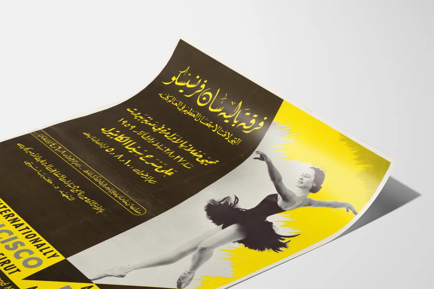 Dieses Wandbild ist eine ausgezeichnete Wahl für Tanzliebhaber, Fans klassischer Aufführungen oder für jene, die Poster im Retro-Stil schätzen. Diese Wanddekoration zeigt ein harmonisches Gleichgewicht zwischen Text und Bild, mit Inschriften auf Englisch und Arabisch, die das internationale Kulturereignis widerspiegeln, das Ende Februar und Anfang März 1959 im Capitol-Theater in Beirut stattfand.