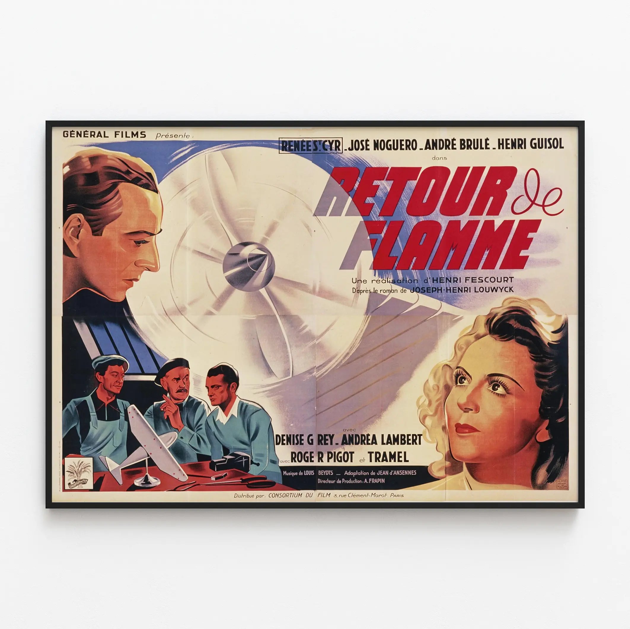 Dieses Vintage-Poster „Rückkehr der Flamme“ ist ein ikonisches Wanddekorationselement für Liebhaber des klassischen Kinos. Gedruckt im Retro-Stil zeigt es feinfühlig illustrierte Figuren mit ausdrucksstarken Zügen und eleganten Farben, die das goldene Zeitalter des Films heraufbeschwören. Das grafische Design verbindet warme und kalte Nuancen, wobei Rot- und Blautöne dominieren, und hebt den Titel in großen, dynamischen Buchstaben hervor. Das Motiv kontrastiert das leuchtende Frauenporträt rechts mit dem ernsten Männerprofil links und rahmt eine stilisierte Flugzeugpropeller in der Mitte ein – ein kraftvolles Symbol, das den Blick fängt und das Thema des Films erinnert. Dieses detailreiche Poster ist perfekt, um eine Wanddekoration zu bereichern und eine vintage Atmosphäre sowie einen zeitlosen filmischen Charme zu verleihen. Ideal für ein Wohnzimmer, ein Büro oder einen Kinoraum vermittelt dieses Wandbild eine visuelle Geschichte und weckt die Nostalgie vergangener Plakate. Mit diesem Poster in Ihrer Sammlung bringen Sie einen Hauch retro-Eleganz und ein Stück filmkulturelles Erbe in Ihr Zuhause.