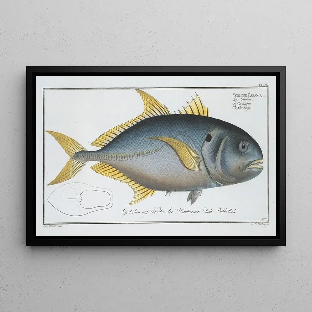 Scomber carangus, der Carangue: eine Ode an das Meer und seine Bewohner Die kunstdruck Scomber carangus, der Carangue, von Marcus Elieser Bloch zeigt eine faszinierende Darstellung dieses emblematischen Fisches. Die Nuancen von Blau und Silber, kombiniert mit Tupfern von Gelb, erinnern an das funkelnde Licht des Ozeans. Die Gravurtechnik, sorgfältig ausgeführt, ermöglicht es, die feinen Details der Schuppen und Flossen einzufangen und gleichzeitig eine Atmosphäre von Ruhe und Gelassenheit zu vermitteln. Das Werk lädt den Betrachter ein, in die Meereswelt einzutauchen, die Tiefen zu erkunden und die Schönheit der Kreaturen, die sie bewohnen, zu schätzen. Marcus Elieser Bloch: ein Pionier der künstlerischen Ichthyologie Marcus Elieser Bloch, Naturforscher und Künstler des 18. Jahrhunderts, ist bekannt für seine Beiträge zur Erforschung der Fische. Ursprünglich aus Deutschland stammend, widmete er sein Leben der Dokumentation der Meeresarten, wobei Wissenschaft und Kunst verbunden wurden. Sein bedeutendes Werk, "Ichthyologie", markierte einen wichtigen Meilenstein in der wissenschaftlichen Illustration und beeinflusste zahlreiche Künstler und Wissenschaftler. Bloch gelang es, nicht nur die Form der Fische, sondern auch ihre Essenz einzufangen und so der Vielfalt des Wasserlebens Tribut zu zollen. Seine Leidenschaft für die Natur und sein Blick fürs Detail machen ihn zu einer unverzichtbaren Figur der naturalistischen Kunst. Eine dekorative Anschaffung mit vielfältigen Vorzügen Der kunstdruck Scomber carangus, der Carangue, ist eine ideale dekorative Wahl für verschiedene Räume, sei es im Wohnzimmer, im Büro oder im Schlafzimmer. Seine Druckqualität und die Treue zum Originalwerk garantieren eine beeindruckende ästhetische Darstellung. Dieses Bild zieht den Blick auf sich und weckt Neugier, während es eine frische Meeresatmosphäre in Ihr Zuhause bringt. Durch die Integration dieses Leinwandbildes in Ihre Dekoration schaffen Sie eine beruhigende Atmosphäre und feiern gleichzeitig die Schönheit der Natur und ihrer wundersamen Wasserwelten.