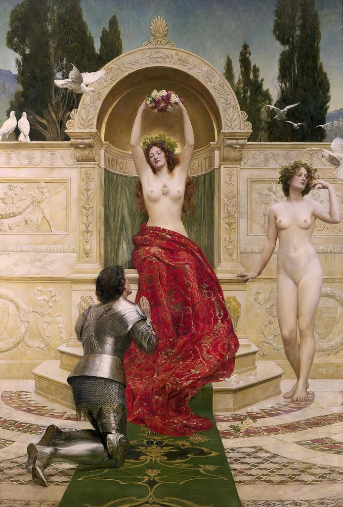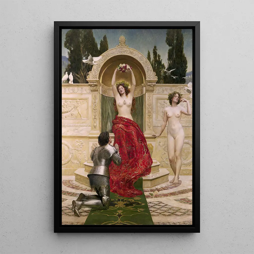 In diesem fesselnden Werk taucht John Collier in eine mittelalterliche Legende ein, in der Tannhäuser, ein Troubadour, im verzauberten Reich der Venus landet. Die Komposition ist reich an Details, mit lebendigen Farben, die Leidenschaft und Schönheit hervorrufen. Die Nuancen von Rot und Gold dominieren und schaffen eine Atmosphäre, die sowohl mystisch als auch sinnlich ist. Die Technik von Collier, die Realismus und Symbolismus verbindet, ermöglicht es, die Intensität der Emotionen der Figuren zu spüren, während der üppige Hintergrund den märchenhaften Charakter dieser Szene verstärkt.