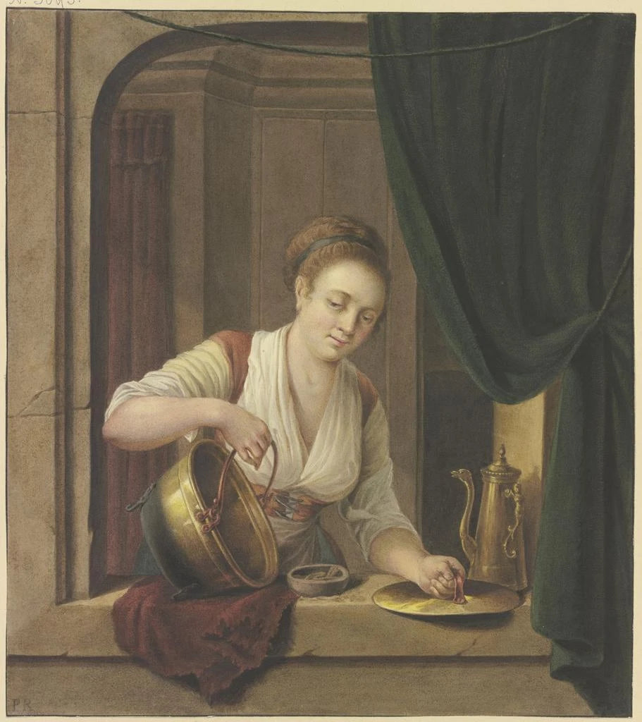 Ein Koch spült das Geschirr am Fenster - Pieter Recco