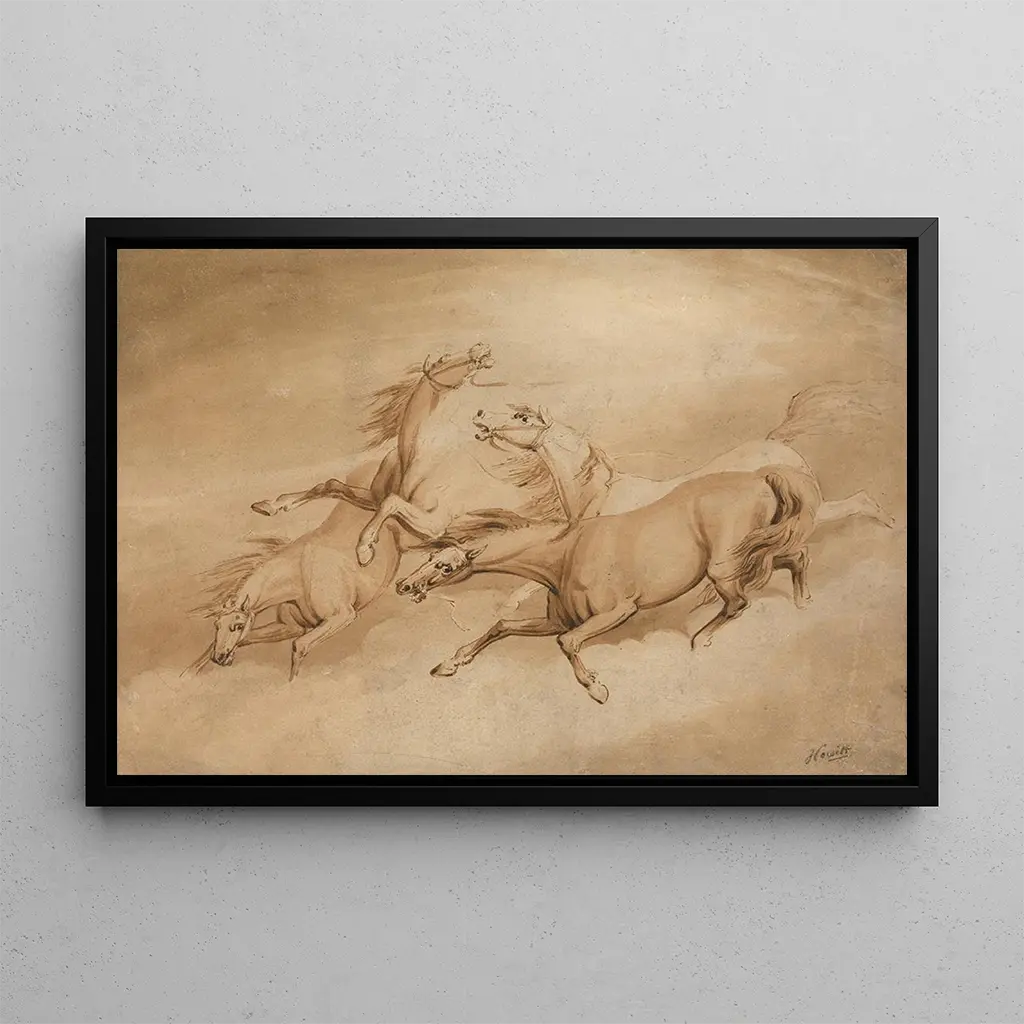 In diesem ikonischen werk, Quatre Chevaux au Galop, fängt Samuel Howitt die kraft und anmut dieser majestätischen tiere ein. Die pferde, dargestellt in einer dynamischen bewegung, scheinen fast über den boden emporzusteigen, ihre muskeln gespannt und ihre mähne im wind. Die farbpalette, dominiert von warmen brauntönen und akzenten in leuchtendem weiß, schafft eine lebendige und pulsierende atmosphäre. Die technik des künstler, die aquarelle und zeichnung verbindet, vermittelt ein gefühl von leichtigkeit und flüssigkeit und entführt den betrachter in eine welt, in der die natur herrscht.
